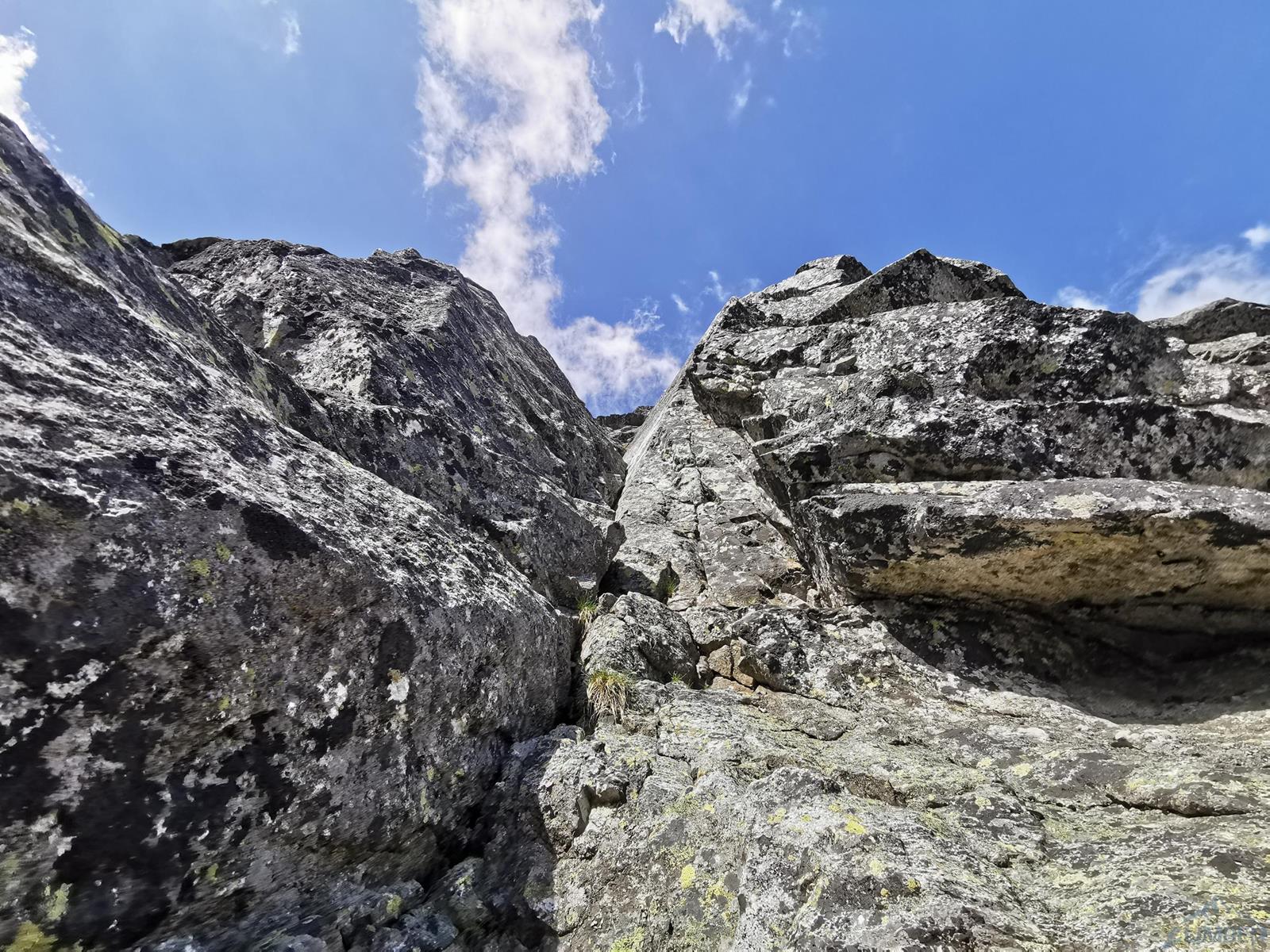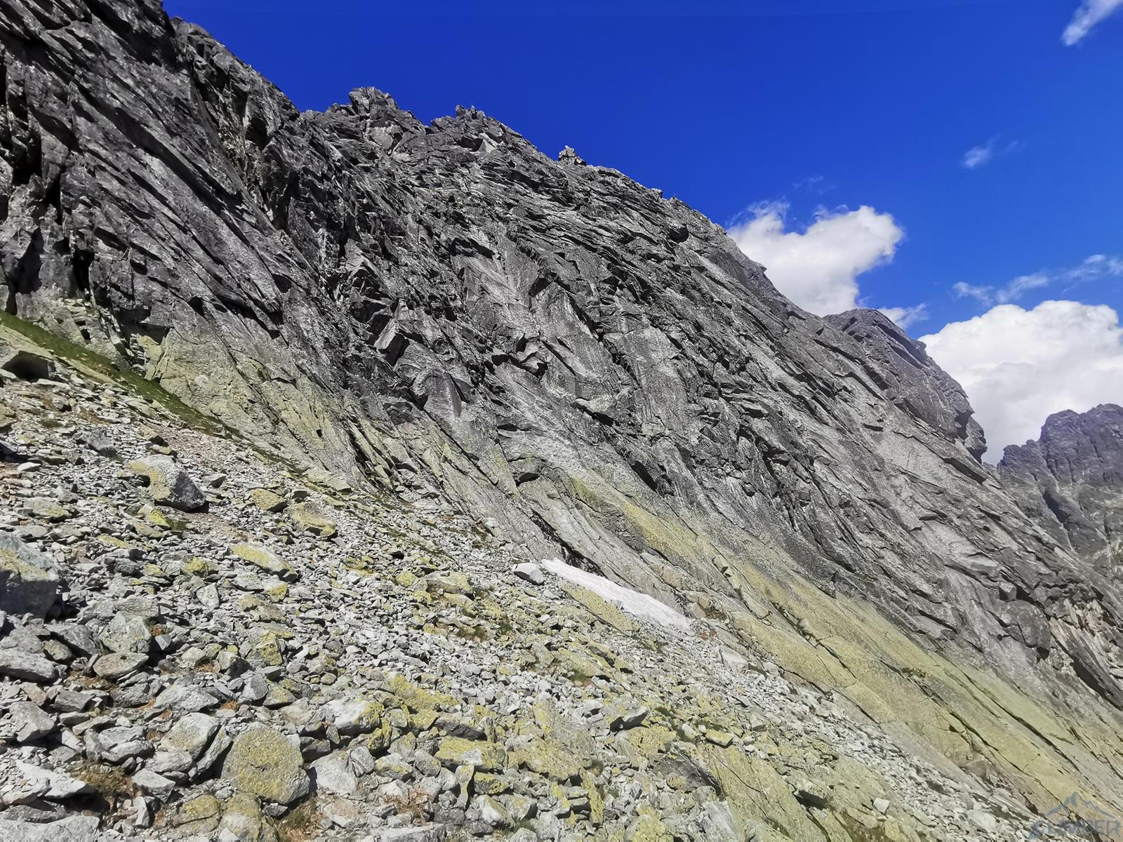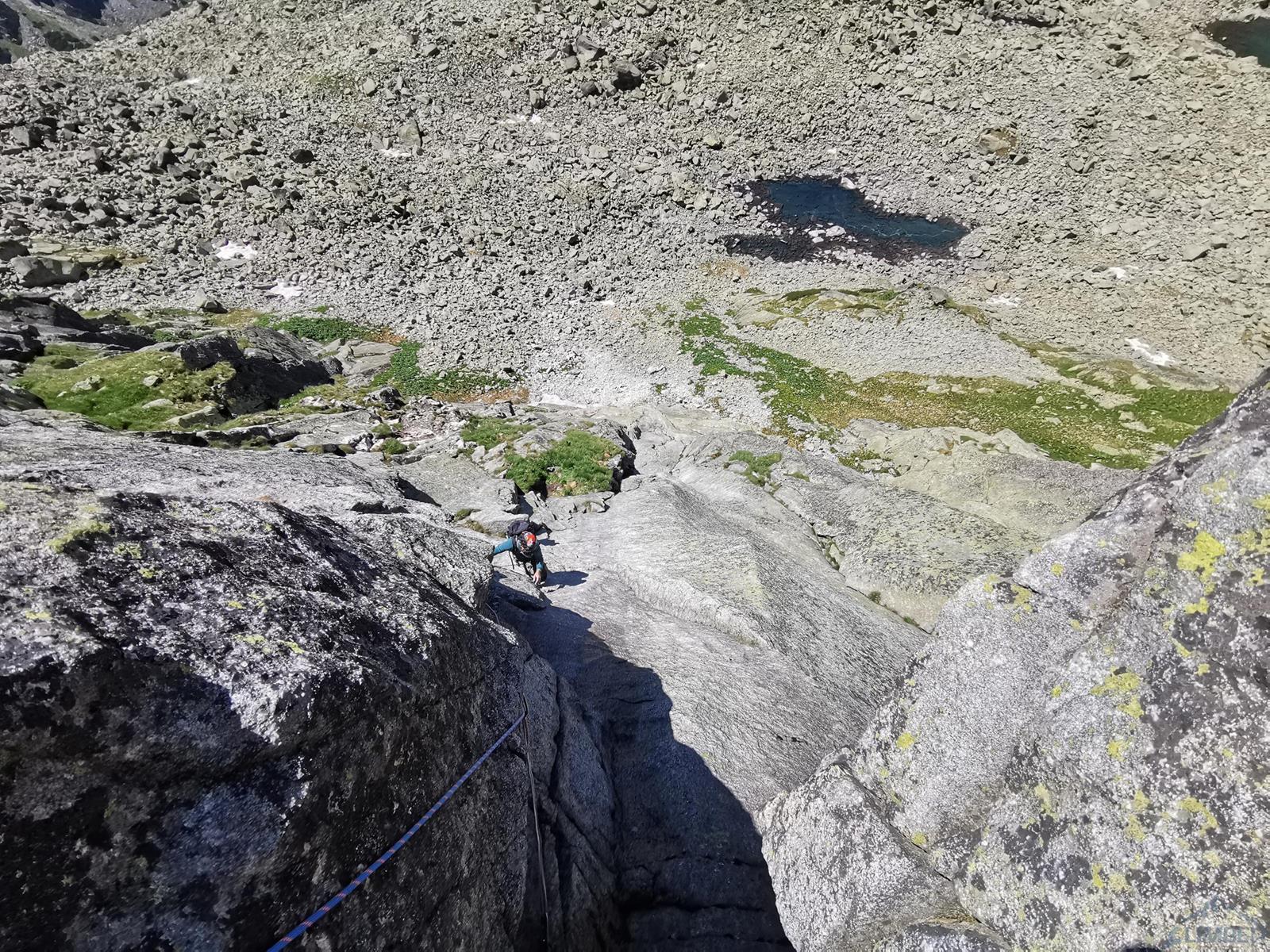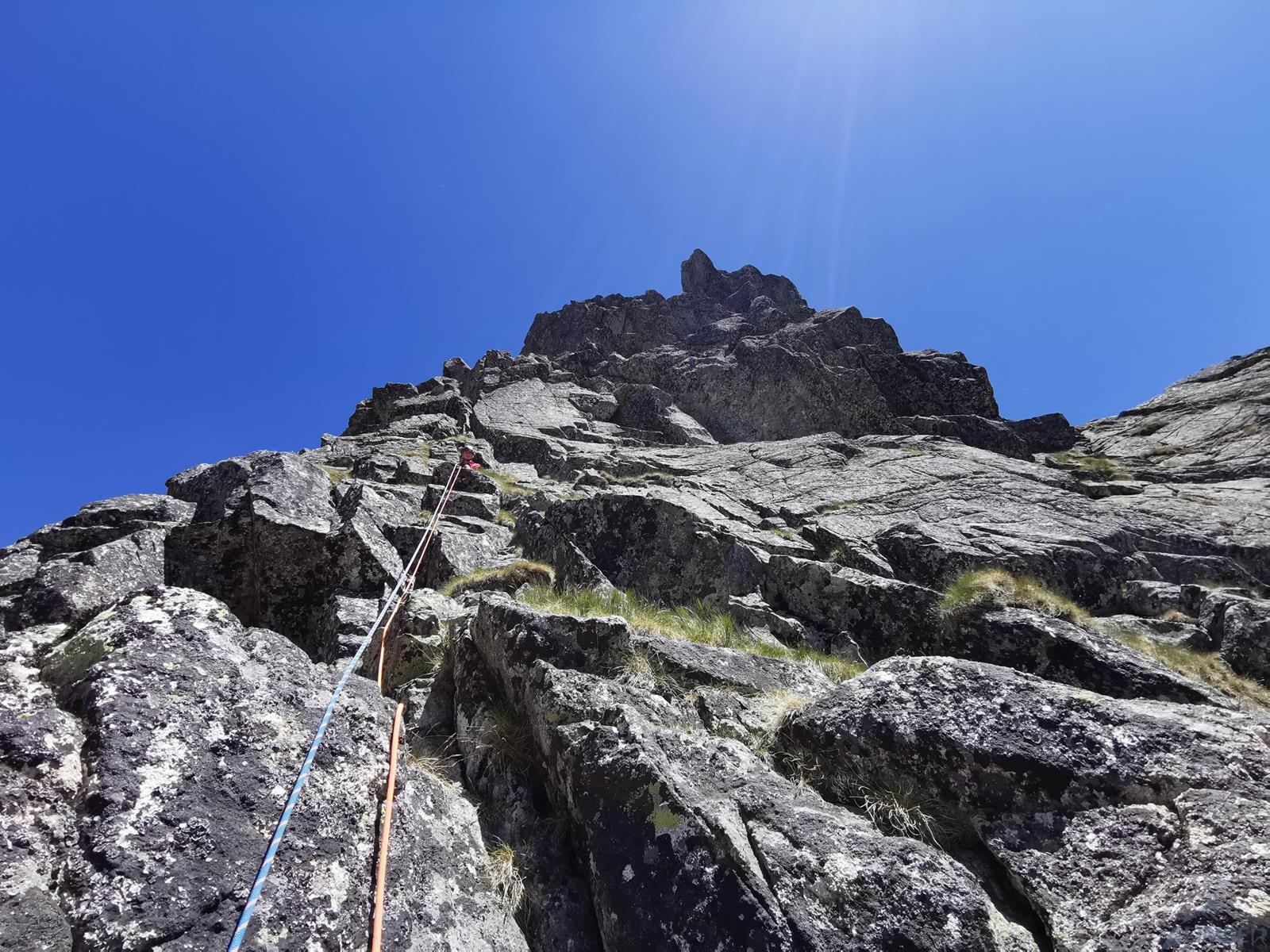 Niestety jak już wspominałem na wstępie, na następnym fragmencie czeka nas sporo „terenu rolniczego” – przebieramy buty na podejściówki i ruszamy dalej. Po około 80 metrach docieramy pod kopułę szczytową – tutaj możemy się zatrzymać lub od razu kontynuować groźnie wyglądającym kominkiem (II) po prawej, stanowisko znajdziemy zaraz po wyjściu z niego. Ostatni fragment to około 30 metrów wspinania po pięknych płytach grani wyprowadzającej na wierzchołek Wielkiej Szarpanej Turni – do wyboru mamy kilka wariantów (III/IV). Ze szczytu zjeżdżamy (blok z taśmami) około 20 metrów na trawiastą półkę, z której łatwo przechodzimy na ścieżkę biegnącą z przełączki do dużej poziomej rampy wyprowadzającej nas ze ściany. Zachęcam do powtórzeń, mając dobry opis drogę robi się bardzo szybko - warto więc pamiętać o niej przy okazji wspinania na innych, dużo bardziej popularnych liniach na ścianie południowej.