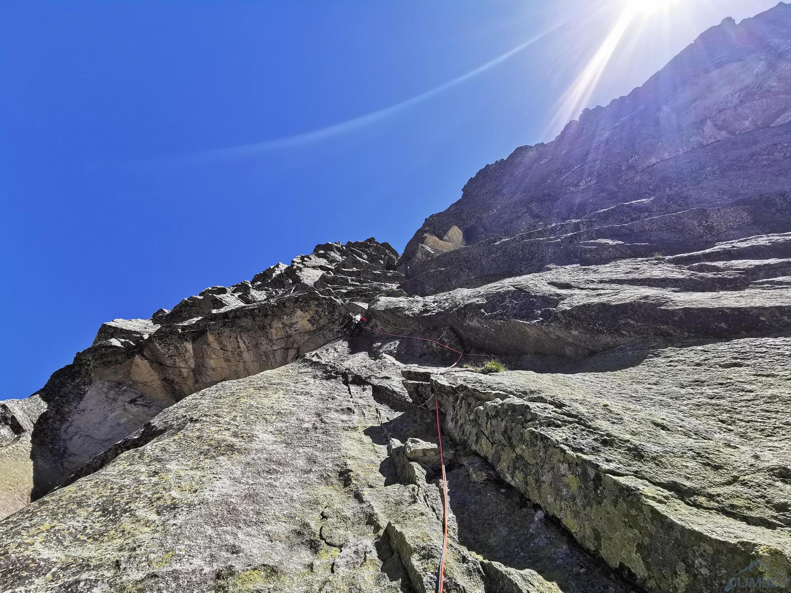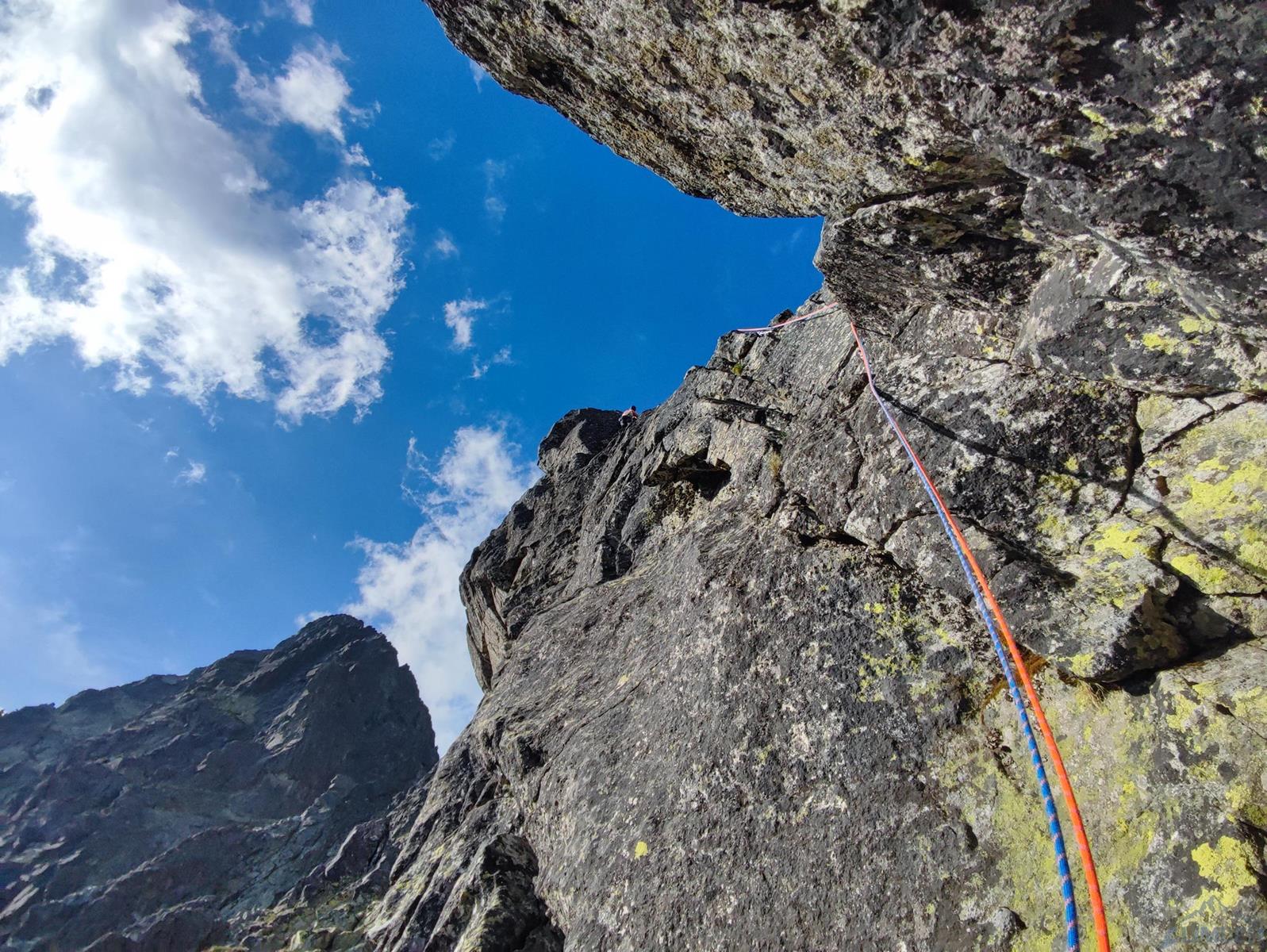 Wyciąg czwarty (V, ok. 50m) jest bardzo fajny – wspinamy się przez okapiki, dalej gładkim zacięciem, wychodzimy z niego ścianką w prawo i po ominięciu przewieszenia wracamy i kontynuujemy do góry aż do półki nad skalnym „dziobem”. Na piątym wyciągu (ok. 50m) wspinamy się ładnym kominem (IV), po dojściu do zamykającej go przewieszki trawersujemy w lewo i w dogodnym miejscu odbijamy do góry i lekko w lewo – aż do trawiastych półek obok wielkiej popękanej płyty. Około 20 metrów na prawo znajduje się stanowisko zjazdowe z Drag”on”line – jeżeli planujemy wracać pod ścianę najlepiej udać się do niego. My tymczasem idziemy jeszcze jeden łatwy (III, 50m) wyciąg do góry – najpierw skośnie w lewo wzdłuż pęknięć, potem już do góry na grań i na szczyt Małego Siarkana.