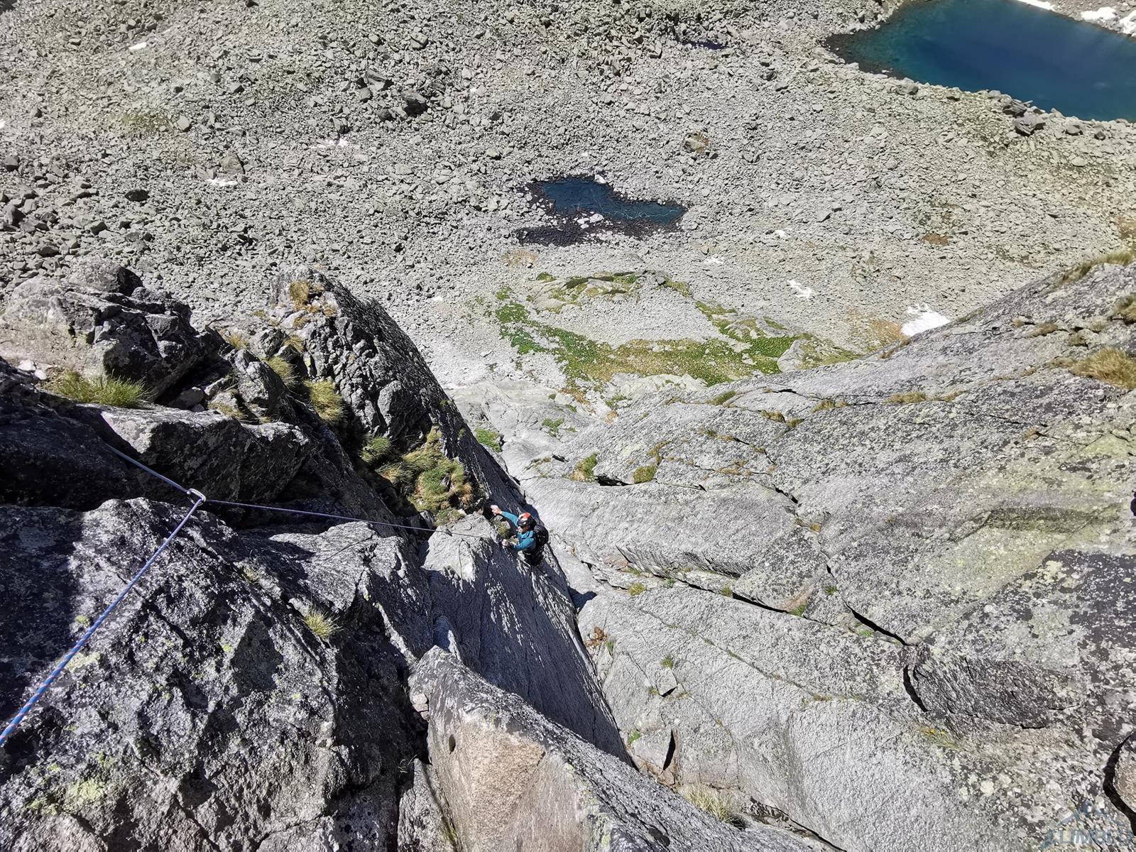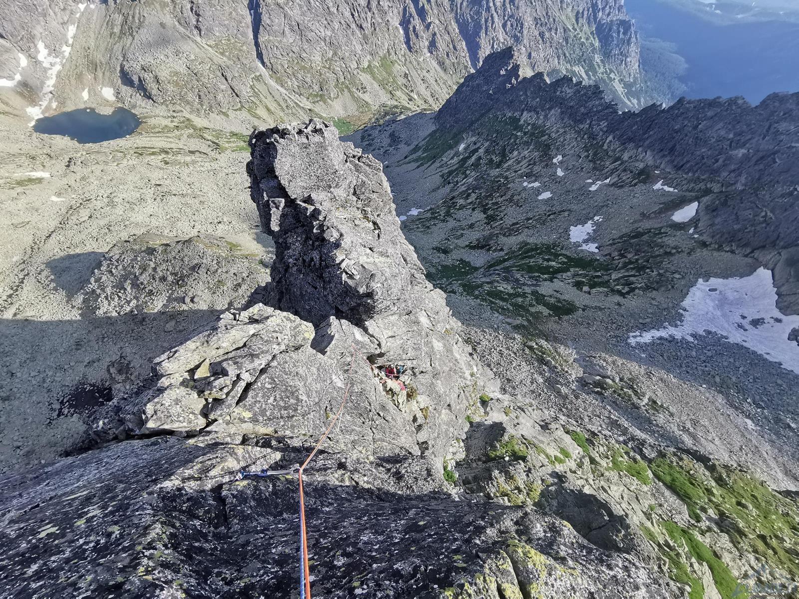 Po przerwie ruszamy granią w kierunku Siarkańskiej Przełęczy – po drodze czeka nas krótki zjazd (stałe stanowisko), wspinaczka przez dwie efektowne turniczki i wejście na szczyt Wielkiego Siarkana, na zejściu z którego zjeżdżamy raz jeszcze kilka metrów (kolejny stan ze spitów). Po dojściu na przełęcz rozwiązujemy się i schodzimy do Złomiskiej Zatoki, do której opada zachodnia ściana Szarpanych Turni. Bardzo kusi też południowa wystawa Smoczego Szczytu, z powodu później pory decydujemy się jednak na dostępną „pod ręką” Motykę (V), której jakimś cudem nie udało mi się jeszcze zrobić mimo wielu wizyt w okolicy choć od dawna widniała na mojej „liście klasyków”.