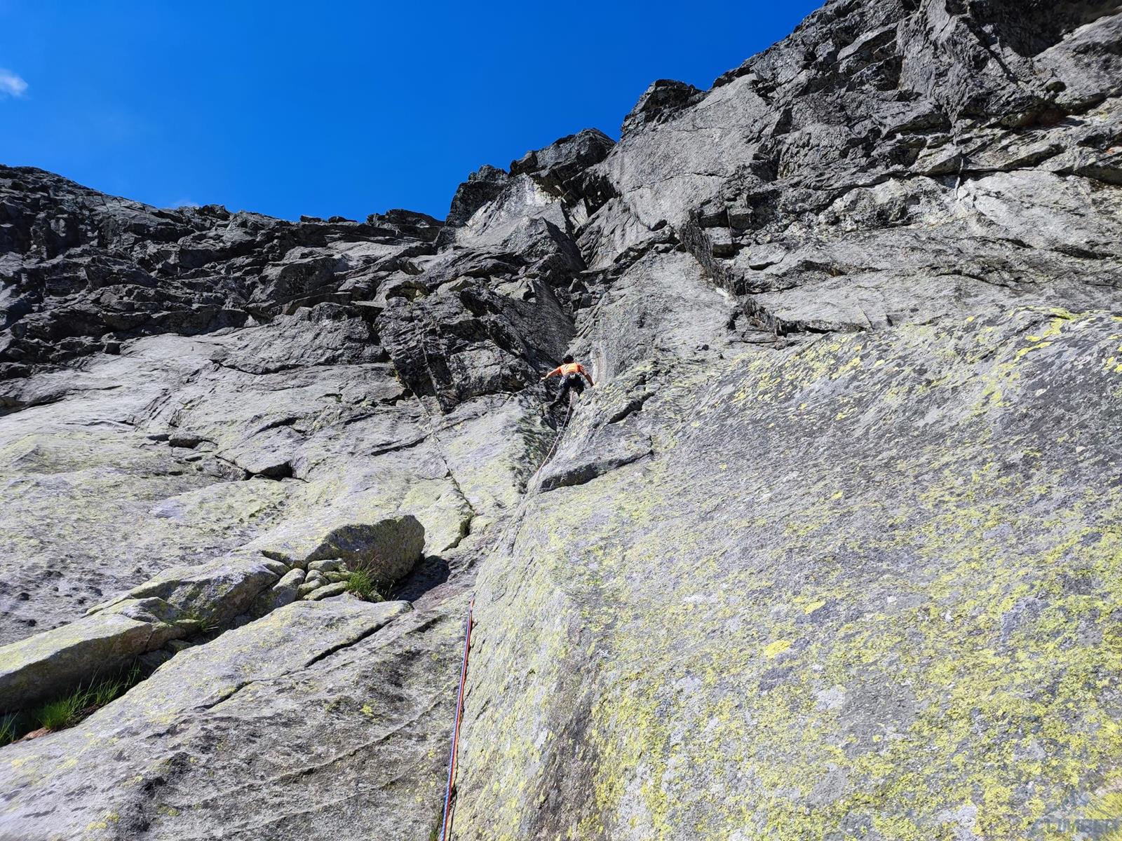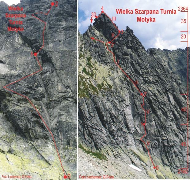 Na początek napiszę to co usłyszeć można chyba od każdego, kto drogę przeszedł - gdyby dwa ostatnie wyciągi były takie jak te dwa pierwsze droga pretendowała by do miana najładniejszej piątki w Tatrach. Niestety po zaskakującej urodą i śmiałością (ukłon w kierunku starych mistrzów, którzy przeszli ją klasycznie w 1931 roku!) pierwszej połowie drogi, dalsze 100 metrów pod kopułę szczytową prowadzi niestety trawiasto-skalnym dwójkowym terenem. Na pocieszenie pozostaje piękny i lity odcinek końcowy wyprowadzający wprost na szczyt Wielkiej Szarpanej Turni. Zainteresowanych historią drogi oraz szczegółową analizą jej (dość zawiłego) przebiegu odsyłam do ciekawego artykułu Grześka Folty opublikowanego w Górach – link TUTAJ. Mimo iż kusiło by drogę „prostować” starałem się trzymać prawdopodobnego oryginalnego przebiegu – być może kiedyś warto będzie wrócić bo zacięcia wprost wyglądały bardzo ciekawie.