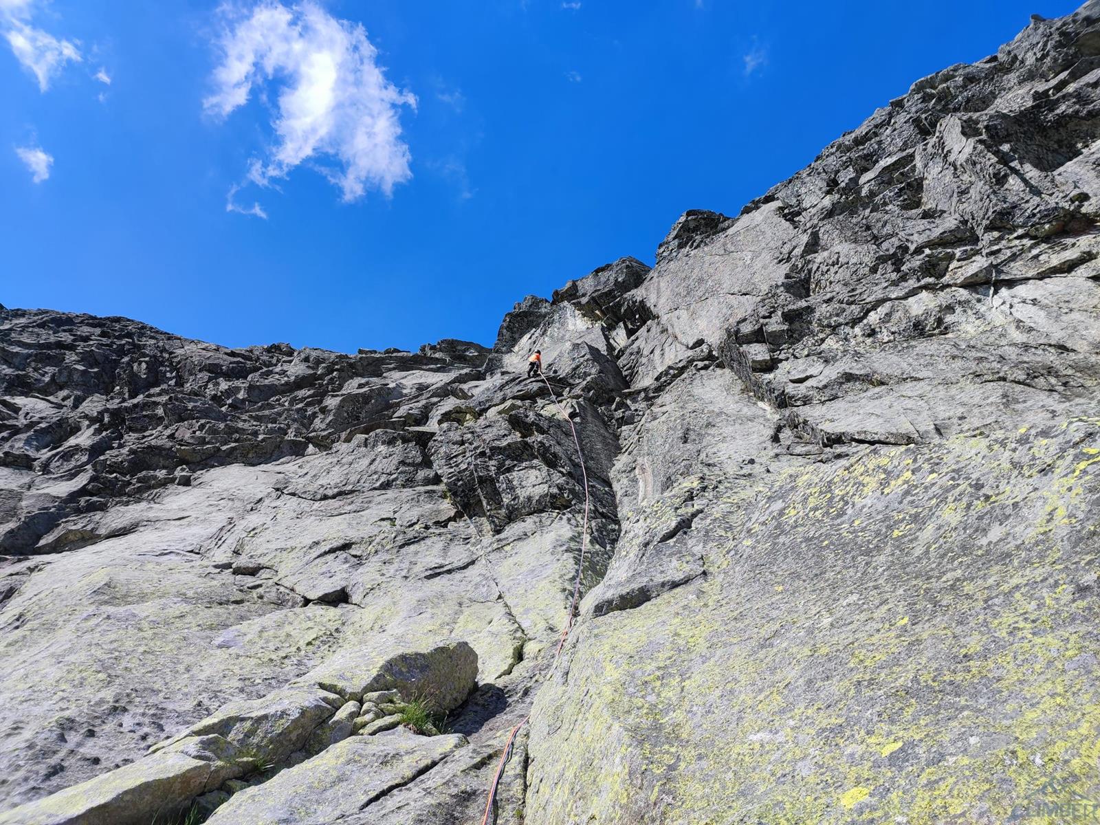Startujemy wymytymi połogimi płytami i idziemy w kierunku skalnej rynny, ograniczonej po bokach rysami – tą z lewej strony dojdziemy do wygodnej półki, gdzie można zbudować dobre stanowisko (III, ok. 55m). Drugi odcinek (IV+, ok. 25m) rozpoczynamy od obejścia przewieszki w zacięciu po lewej stronie, po czym po dobrze urzeźbionej skale kierujemy się skośnie w prawo aż do trawnika pod kluczowym wyciągiem – widać na nim haki w „zamkniętym” zacięciu. Ze stanowiska dostajemy się pod zacięcie i wspinamy się obok niego skośnie w lewo (VI) po tarciowych stopniach, pokonujemy uklamiony okapik i wychodzimy na półkę (ok. 20m) gdzie warto się zatrzymać.