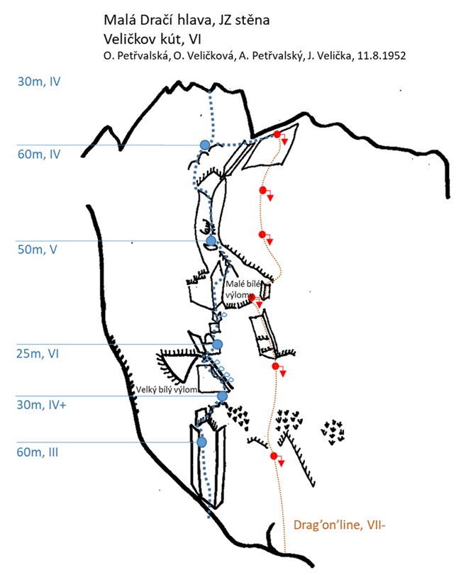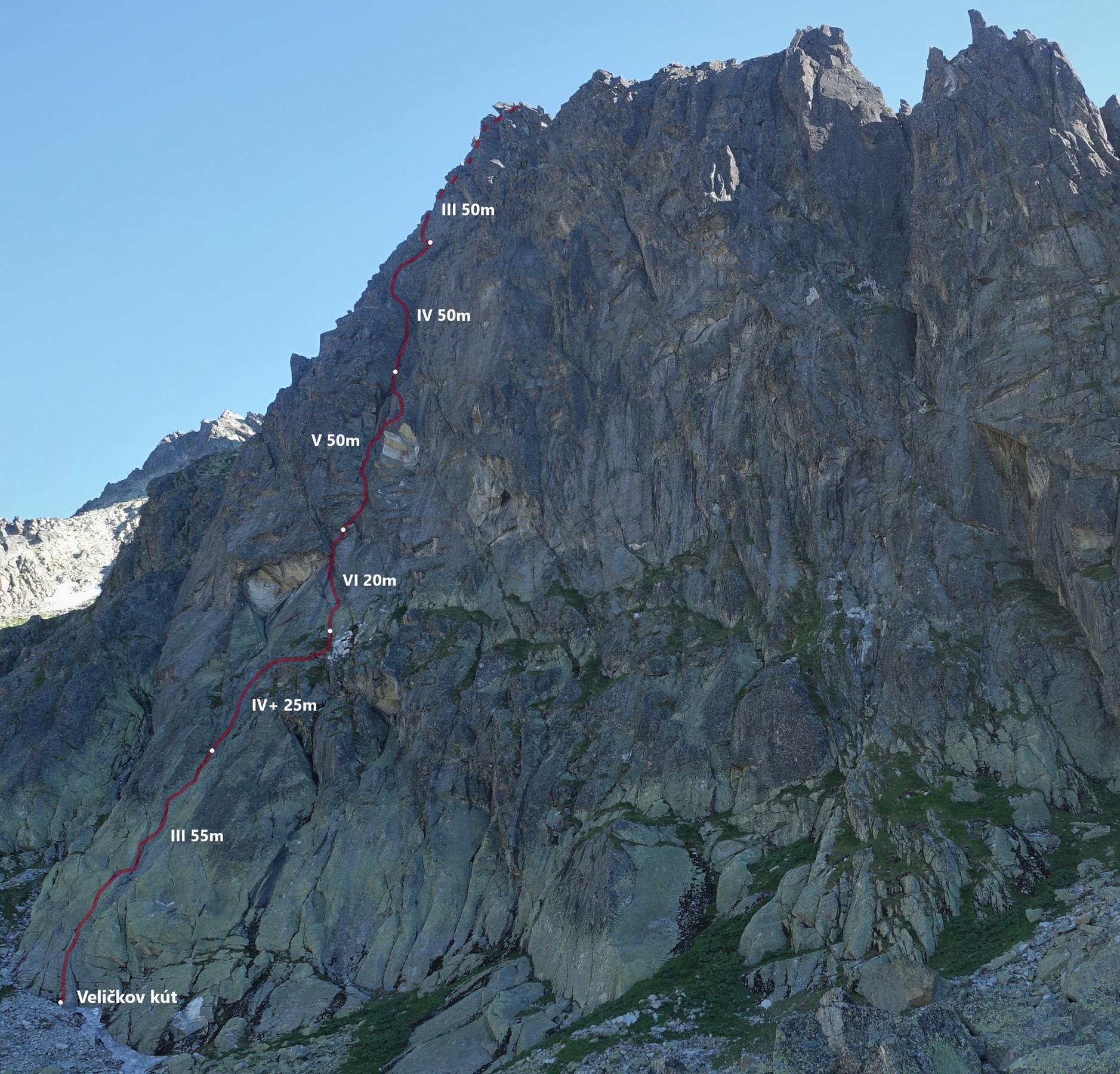 Veličkov kút (VI) to ładna i logiczna linia prowadzącą depresjami – całość prowadzi Ania i poza mokrym tarciowym odcinkiem na kluczowym wyciągu trudności nie sprawiają jej problemów. Droga jest przystępna, w miarę lita i zapewnia dobrą asekurację własną – stanowiska również trzeba budować ale własnych haków zabierać nie trzeba, jest kilka starych, w tym cztery na kluczowym odcinku. Widoczny z dołu obryw nie uszkodził naszej drogi, również biegnąca tuż obok niego linia Drag”on”line (VII-) miała już przejścia po tym zdarzeniu.