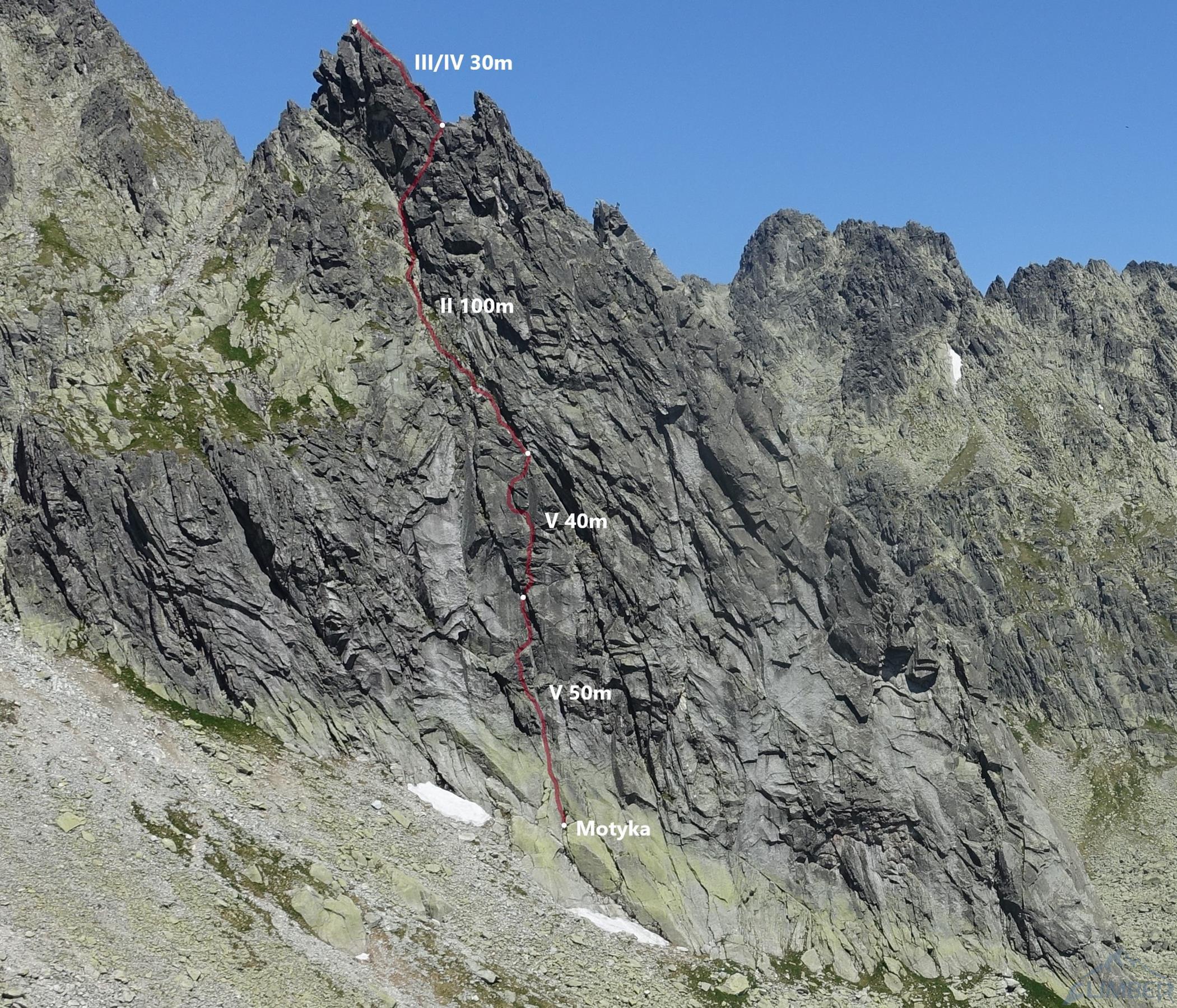 Wspinanie zaczynamy wymytmi skałami kierując się do ewidentnego zacięcia, z którego wychodzimy ścianką w lewo - mimo iż powyże widać kolejnego haka. Po wyminięciu spiętrzenia skalnego na filarku wracamy do zacięcia i kontynuujemy do półki pod przewieszką (stare haki) – cały odcinek ma około 50 metrów i kilka pięknych piątkowych fragmentów. Niektóre tarciowe fragmenty robią wrażenie pamiętając, że Motyka z Sawickim przechodzili je ponad 90 lat temu. Wyciąg drugi (V, ok. 40m) zaczynamy od efektownego ale łatwego przewinięcia w prawo – zgodnie z opisem pokonujemy kolejne małe przewieszki i docieramy do zacięcia. Tutaj (w miejscu gdy na drodze staje nam przewieszka z rysą) podobnie jak na pierwszym wyciągu uciekamy w lewo – po tarciowym fragmencie na filarku możemy od razu wrócić do zacięcia lub zrobić to kilka metrów dalej i zyskać kawałek ładnego wspinania w litej skale.