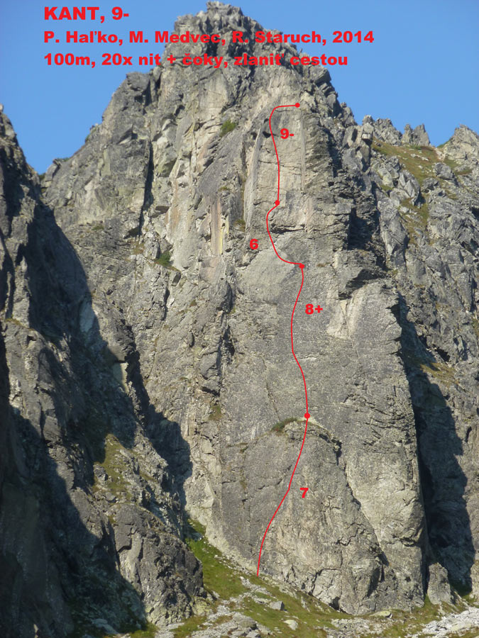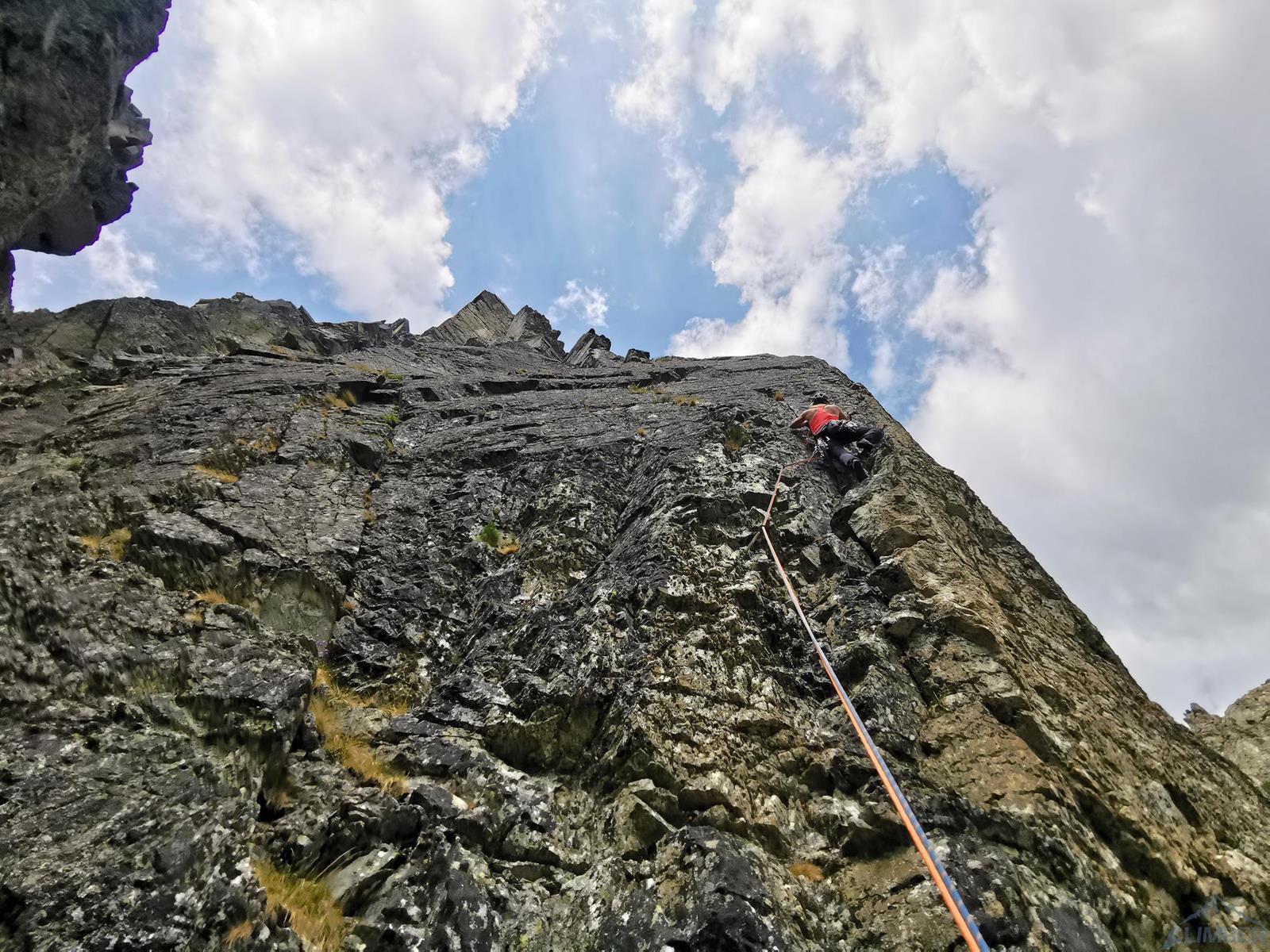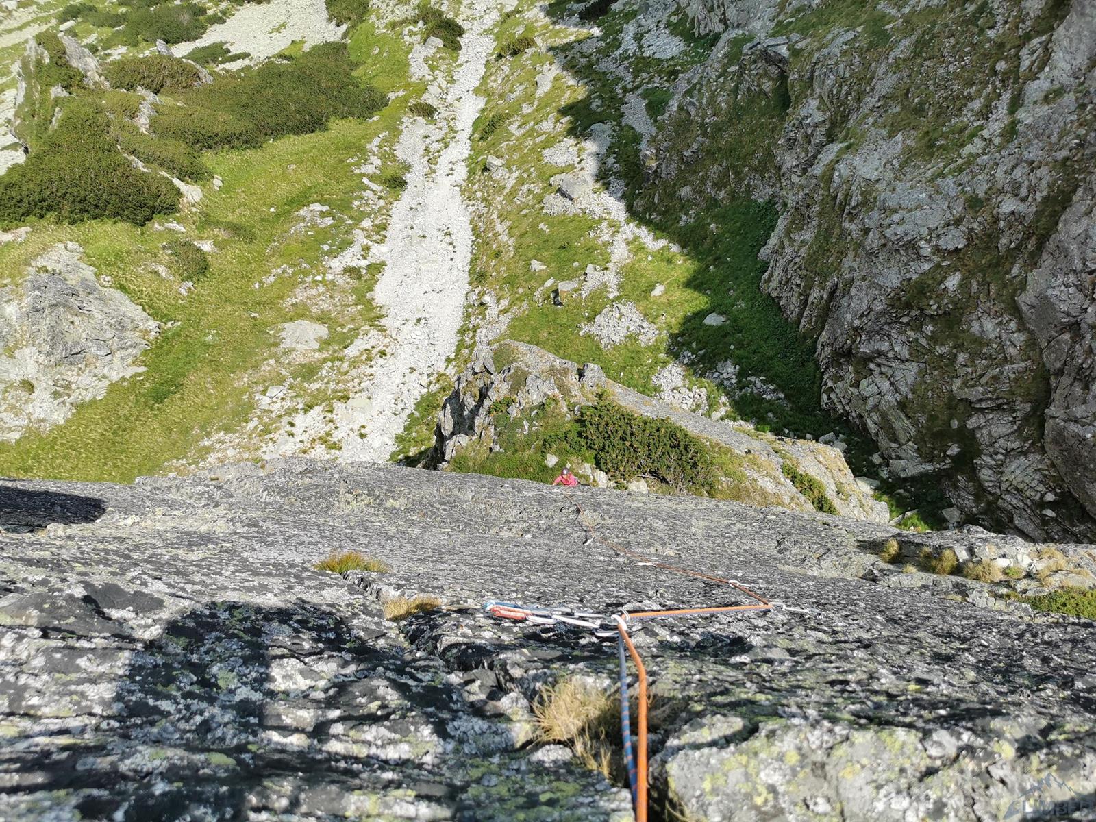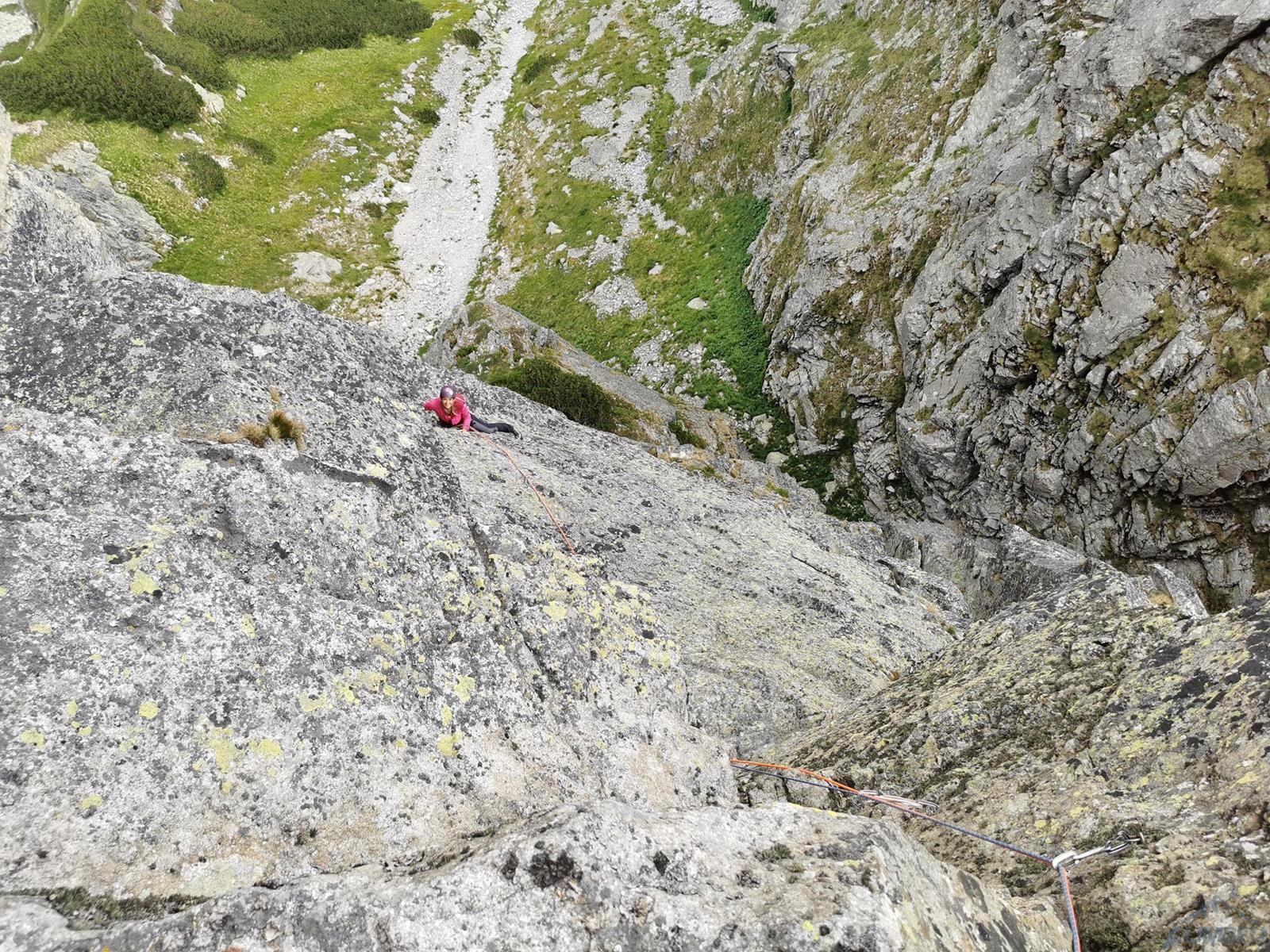 W związku z zapowiadanymi na wczesne popołudnie burzami postanawiamy podziałać na nisko położonej i szybko dostępnej ścianie. Po powrocie z Filara Walkera nie mam zresztą ochoty na chodzenie, przydałoby się za to podszlifować formę sportową 😊. Finalnie lądujemy w Dolinie Młynickiej, na kolejnej ciekawej ospitowanej linii w okolicy – Kancie na Skrajnym Solisku (słow. Solisko Predné). Droga choć niedługa jest warta zrobienia – oferuje bardzo ładne i zróżnicowane wspinanie. Klasycznego przejścia spokojnie próbować mogą wspinacze robiący ósemki– oryginalne wyciągi poszczególnych wyciągów są bowiem zawyżone o ok. pół stopnia/stopień (autorzy pierwszego przejścia wspinali się przy bardzo niskiej temperaturze).