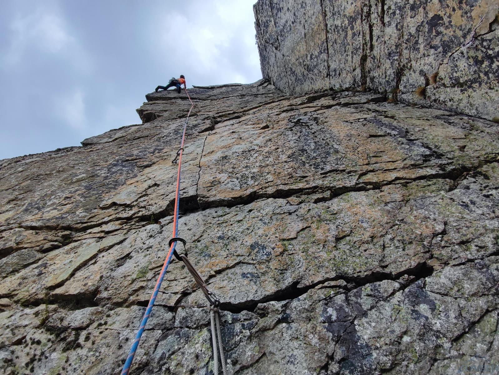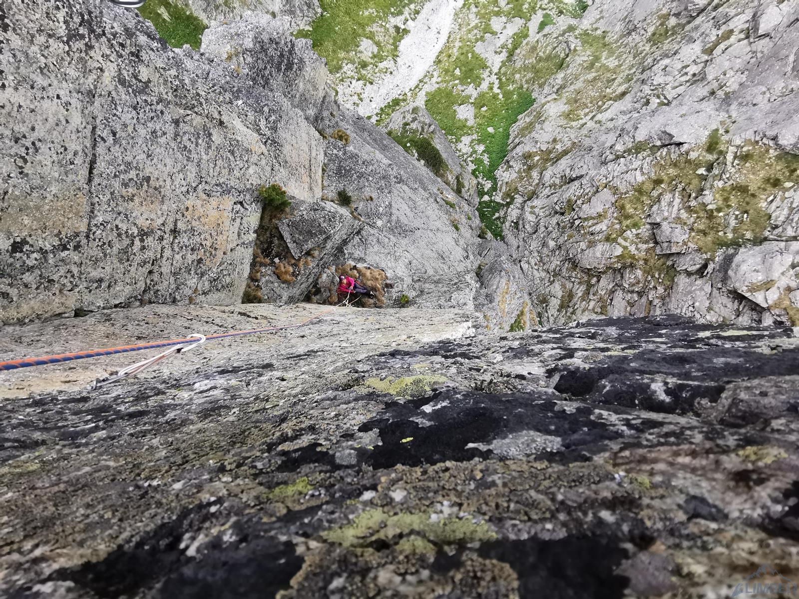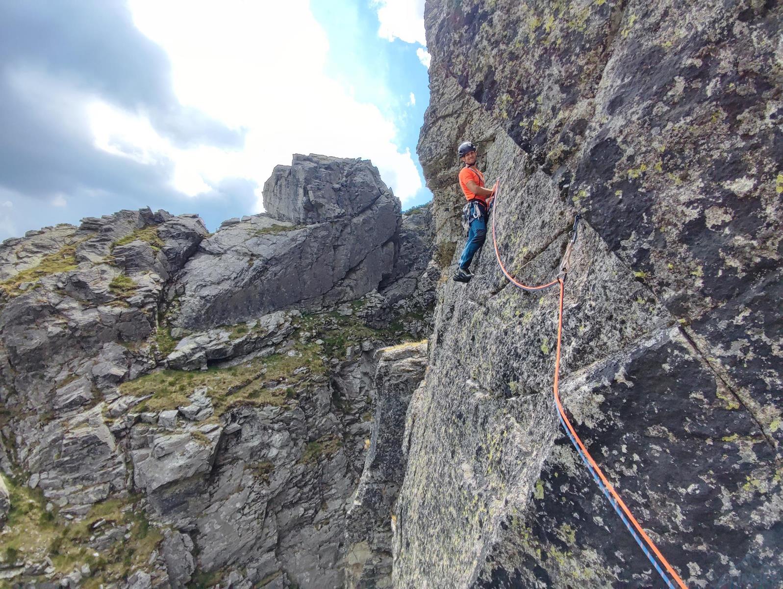 Pierwszy wyciąg prowadzi Ania - zaczynamy blisko kantu ściany, po dużych ale mocno porośniętych chwytach. Wyżej wchodzimy na ładną płytkę, pod koniec której czeka trochę trudniejszy fragment – wycena VII jest jednak na wyrost, bardziej pasowałoby VI+/VII-. Stanowisko znajdziemy po ok. 30 metrach na trawiastej półce. Zmieniamy się na prowadzeniu i ruszam na kolejny wyciąg (35 m) – prowadzący środkiem wielkiej płyty. Pierwsze metry są przystępne, dobrych chwytów i stopni nie brakuje, nie przeszkadzają nawet porosty (przydałoby się więcej powtórzeń!) – jedynie w dwóch, trzech miejscach trzeba się mocniej spiąć. Pod koniec wyciągu dochodzimy jednak do mocno bulderowego miejsca, którego nie odczytuję prawidłowo za pierwszym razem – po kilku minutach próbowania i wracania do restowych klamek w końcu zawisam. Chwilę później wiem już co zrobić – wracam na dół, przewiązuję się i druga próba jest już skuteczna. Wyciąg bardzo fajny i techniczny, ale wycena ponownie do korekty – zamiast VIII+ postawiłbym tutaj VIII-.