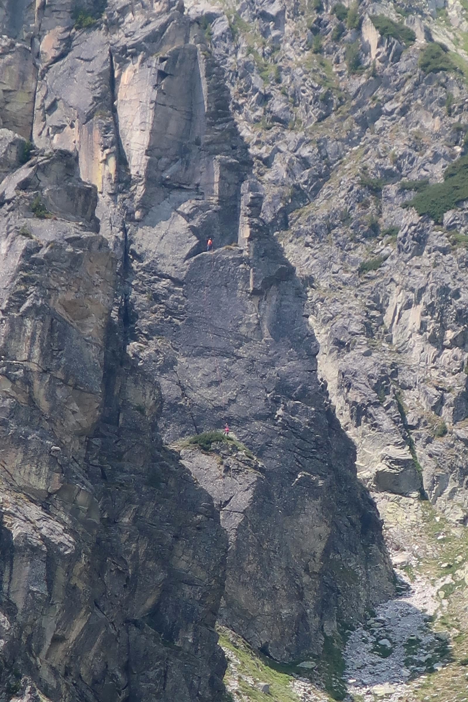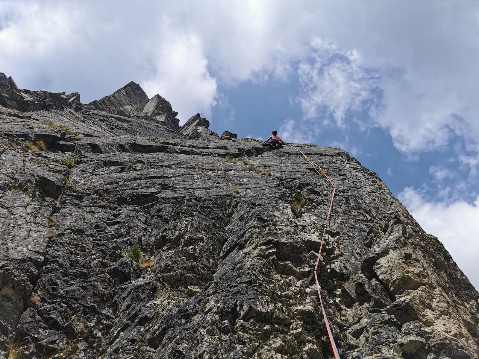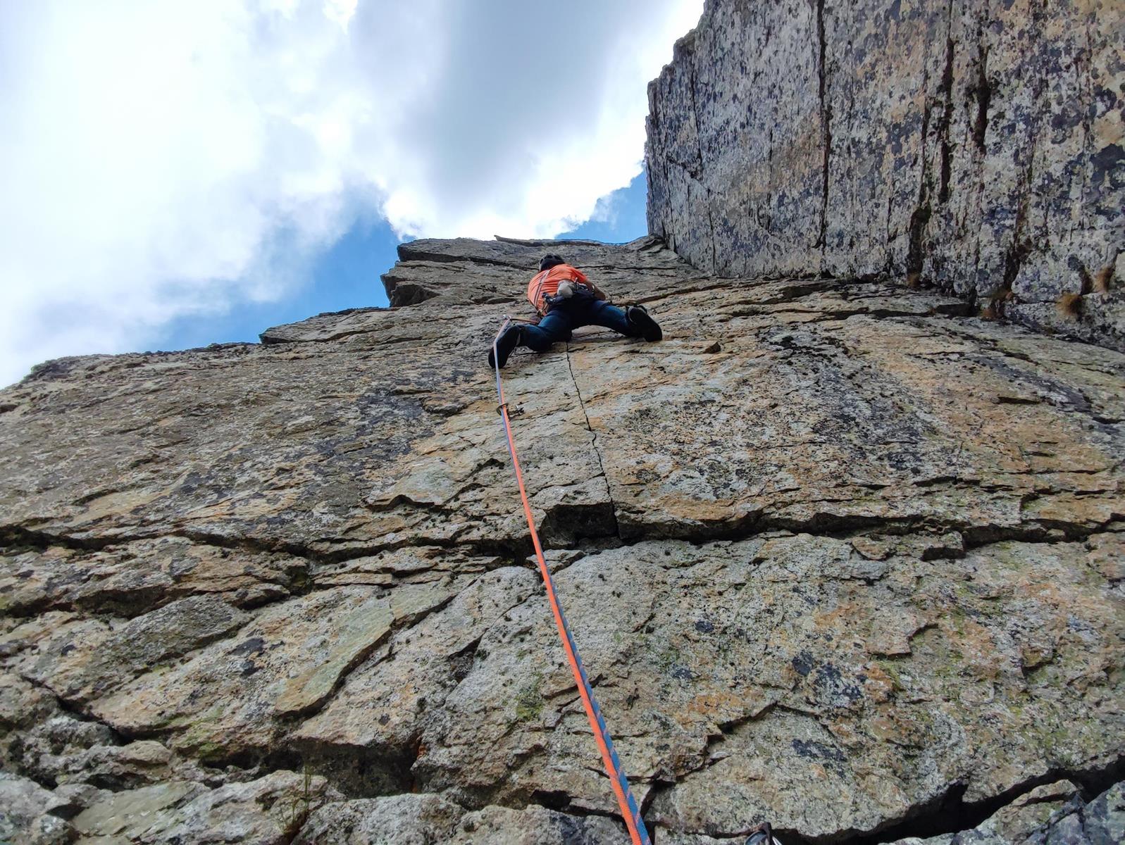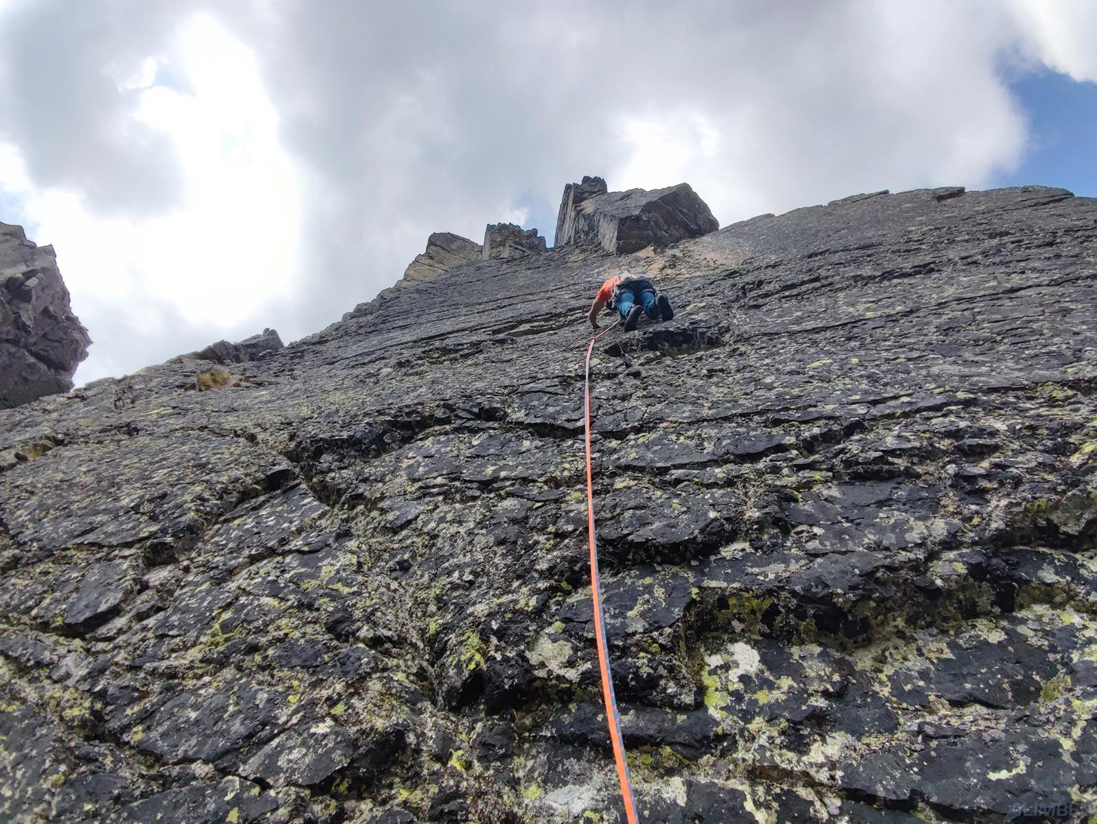 Pierwszy wyciąg prowadzi Ania - zaczynamy blisko kantu ściany, po dużych ale mocno porośniętych chwytach. Wyżej wchodzimy na ładną płytkę, pod koniec której czeka trochę trudniejszy fragment – wycena VII jest jednak na wyrost, bardziej pasowałoby VI+/VII-. Stanowisko znajdziemy po ok. 30 metrach na trawiastej półce. Zmieniamy się na prowadzeniu i ruszam na kolejny wyciąg (35 m) – prowadzący środkiem wielkiej płyty. Pierwsze metry są przystępne, dobrych chwytów i stopni nie brakuje, nie przeszkadzają nawet porosty (przydałoby się więcej powtórzeń!) – jedynie w dwóch, trzech miejscach trzeba się mocniej spiąć. Pod koniec wyciągu dochodzimy jednak do mocno bulderowego miejsca, którego nie odczytuję prawidłowo za pierwszym razem – po kilku minutach próbowania i wracania do restowych klamek w końcu zawisam. Chwilę później wiem już co zrobić – wracam na dół, przewiązuję się i druga próba jest już skuteczna. Wyciąg bardzo fajny i techniczny, ale wycena ponownie do korekty – zamiast VIII+ postawiłbym tutaj VIII-.