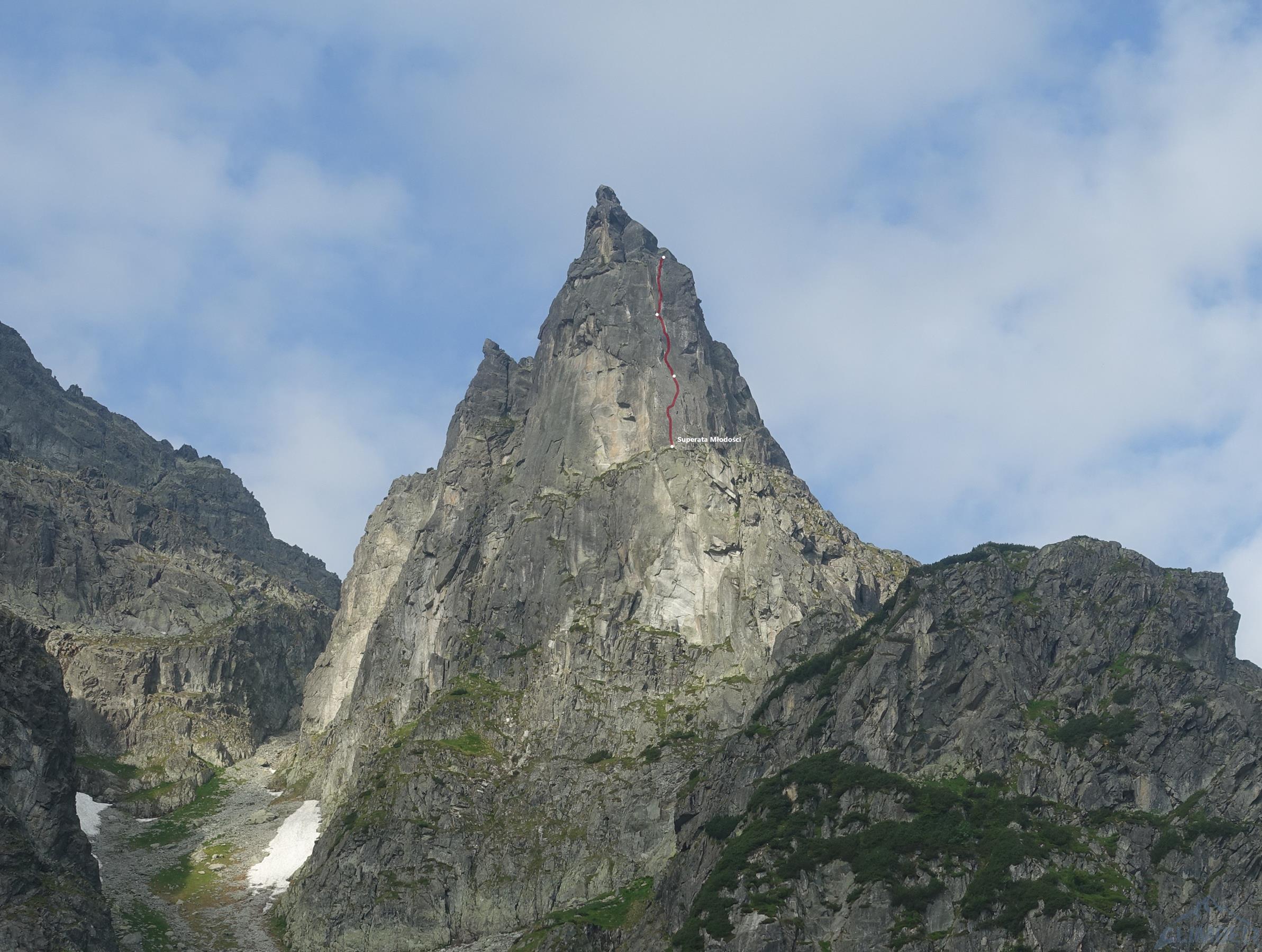 Superata Młodości została wytyczona i kompletnie ubezpieczona spitami w 2003 roku przez słynne trio Korczak-Marcisz-Opozda. Pod drogę dostajemy się idąc trawersem Dolnymi Półkami spod północnej ściany – stanowisko znajdziemy kilkanaście metrów po przewinięciu na stronę wschodnią. Startujemy w kierunku zatrawionej ryski, przecinamy ją i wchodzimy na tarciową płytkę z kilkoma technicznymi ruchami (ok. VII-/VII), końcówka jest już bardziej połoga – stanowisko znajdziemy po ok. 30 metrach na skośnej półce, którą dalej w lewo prowadzi dochodząca z dołu Międzymiastowa.