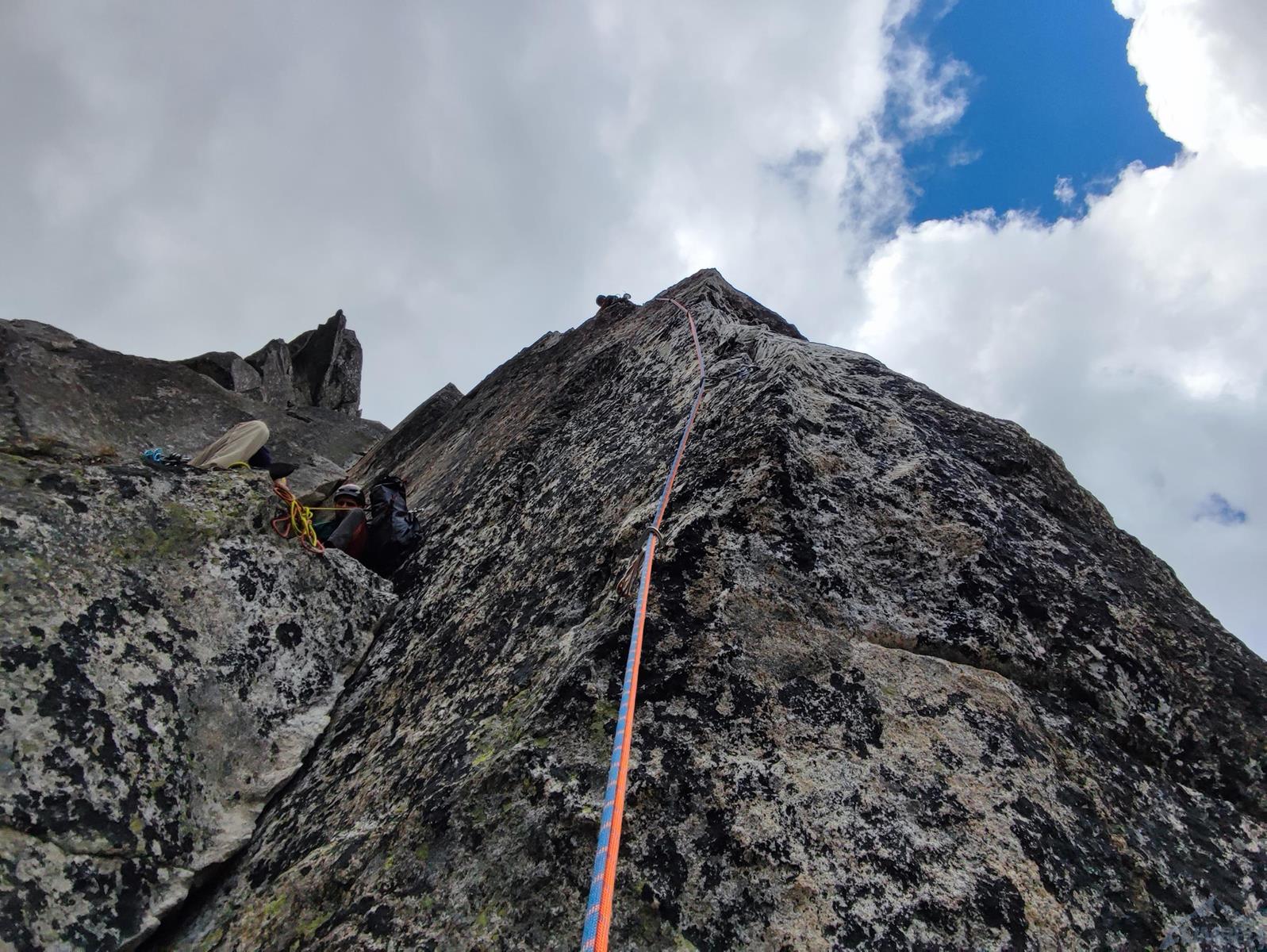 Wyciąg drugi (ok. 30 m) zaczyna się nietrudnym (ok. VI) ale fajnym zacięciem po lewej stronie (rysami na kancie obok biegnie Międzymiastowa), z którego wychodzimy na restową półeczkę. Wyżej robi się trudniej (VIII-) – zaczynamy od technicznego bulderka po małych chwytach (potrzebuję drugiej próby by go rozpracować), wchodzimy do cienkiej rysy z podchwytami, a gdy zanika – przechodzimy skośnie w lewo na licho urzeźbioną płytkę i skręcamy do w stronę stanowiska.