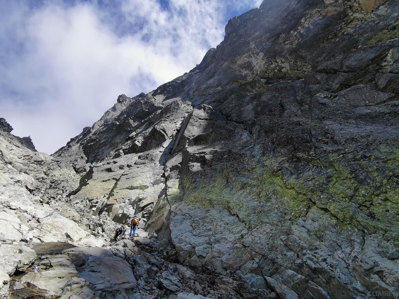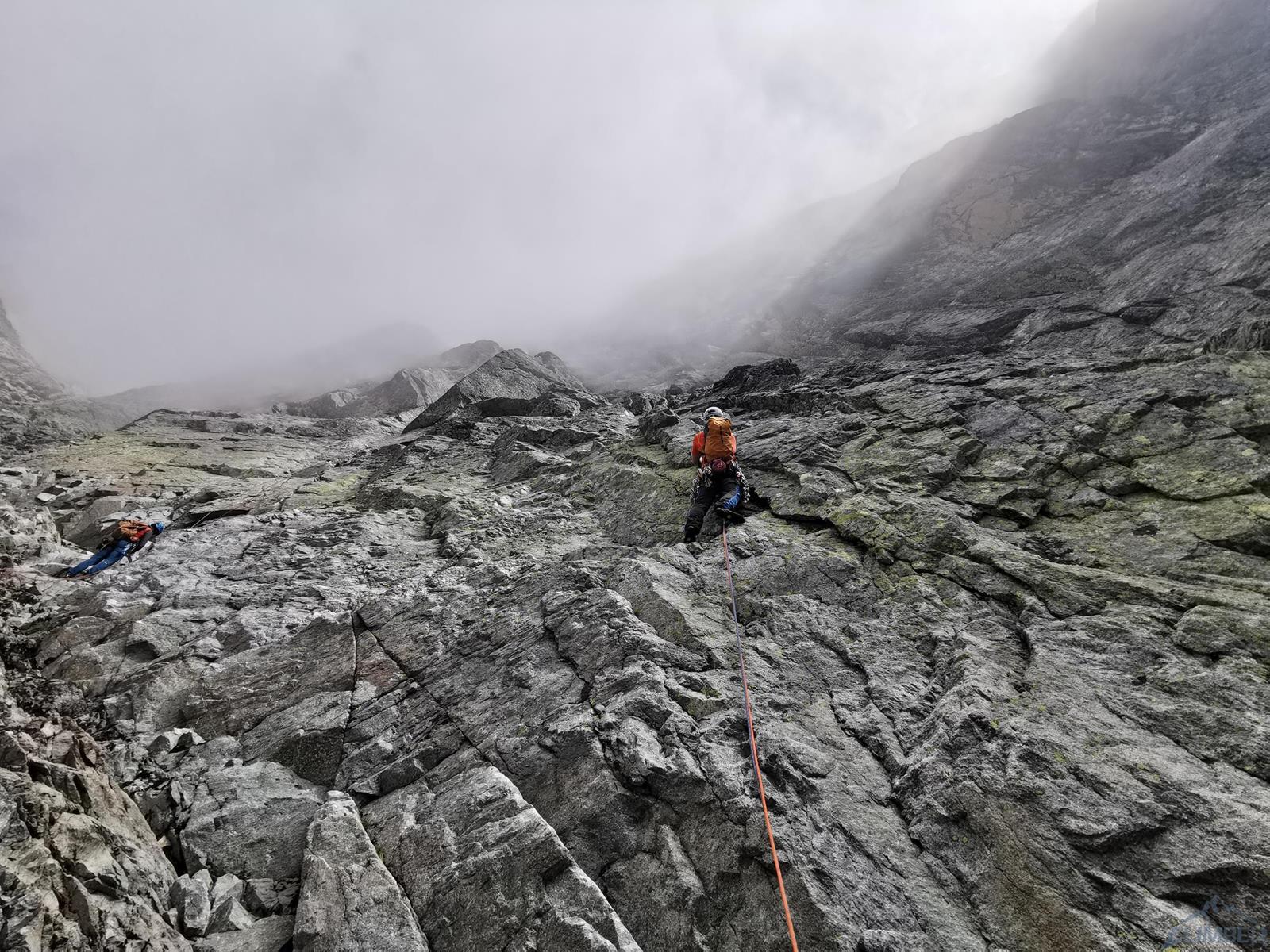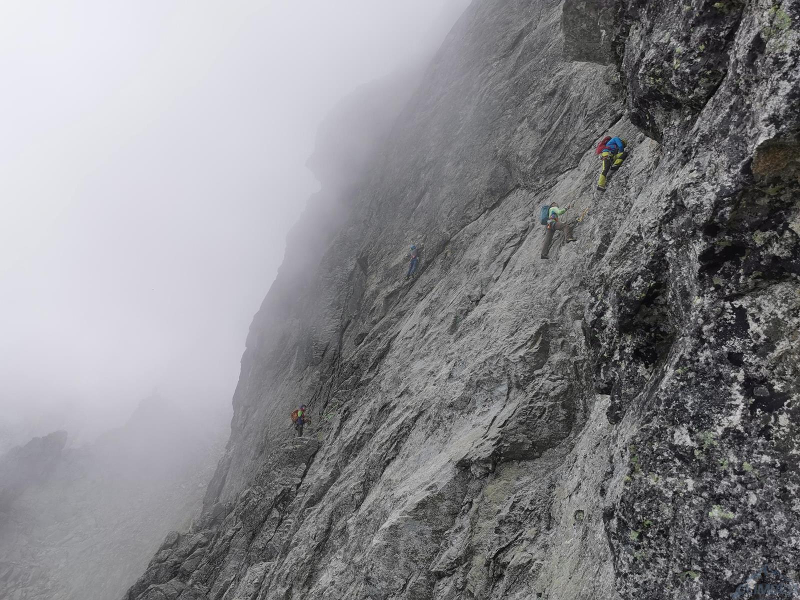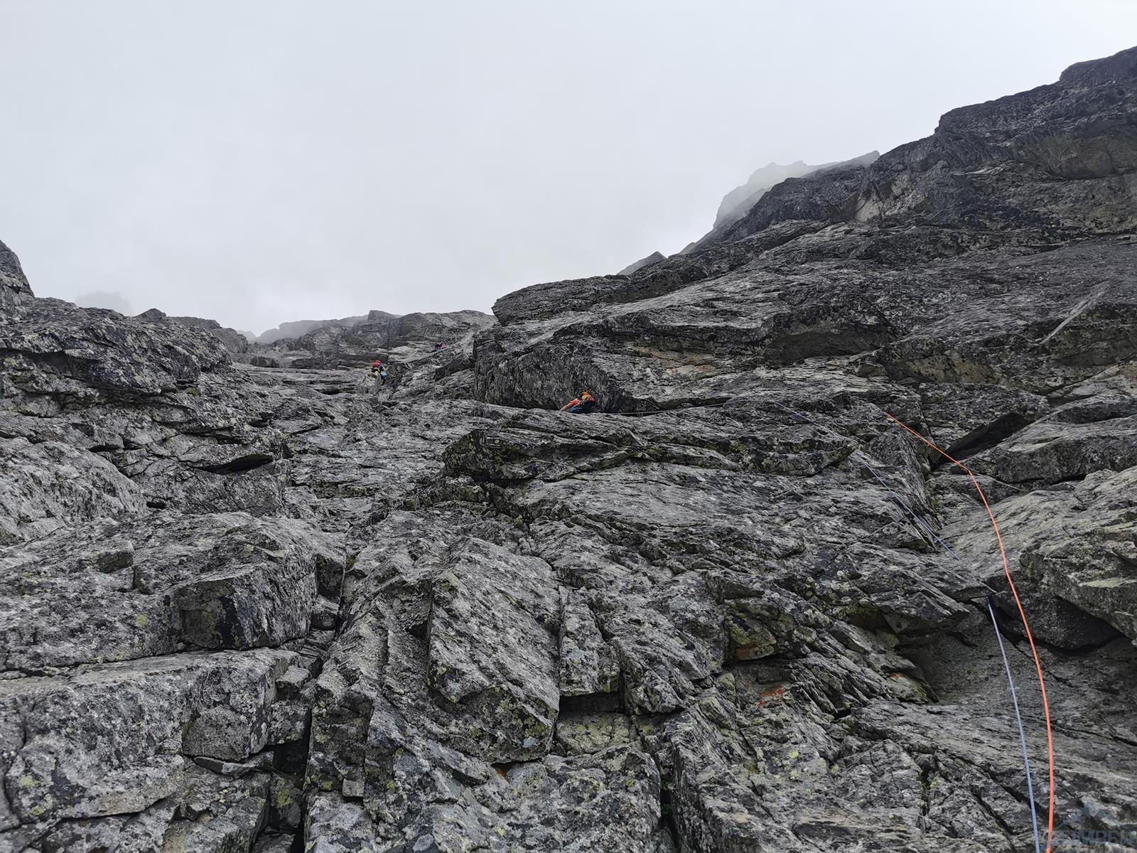 Po komfortowym (przy korzystaniu z kolejek) dotarciu na Łomnicką Przełęcz idziemy dalej do grani i schodzimy feratką pod ścianę. Jesteśmy dziś dość późno, na miejscu jest już kilka zespołów – większość (cztery) idzie oczywiście na Hokejkę, jeden na Patagonské léto, jeden na Puškáša. Na naszą drogę, co nie dziwi – chętnych nie ma. Czeka jednak inna przykra niespodzianka - skała jest mokra, rysy zalane, do tego zamiast zapowiadanej lampy ścianę aż do popołudnia (z krótkimi przerwami) oblepia chmura – to sprawia, że wspinanie w kilku miejscach nie jest tak przyjemne jak być powinno, a trudności mogą wydawać się wyższe. Skoro są stany można jednak w razie problemów zjechać i iść na coś łatwiejszego – próbujemy więc. Pierwsze trzy wyciągi poprowadzi Łukasz, mi przypadną kolejne.