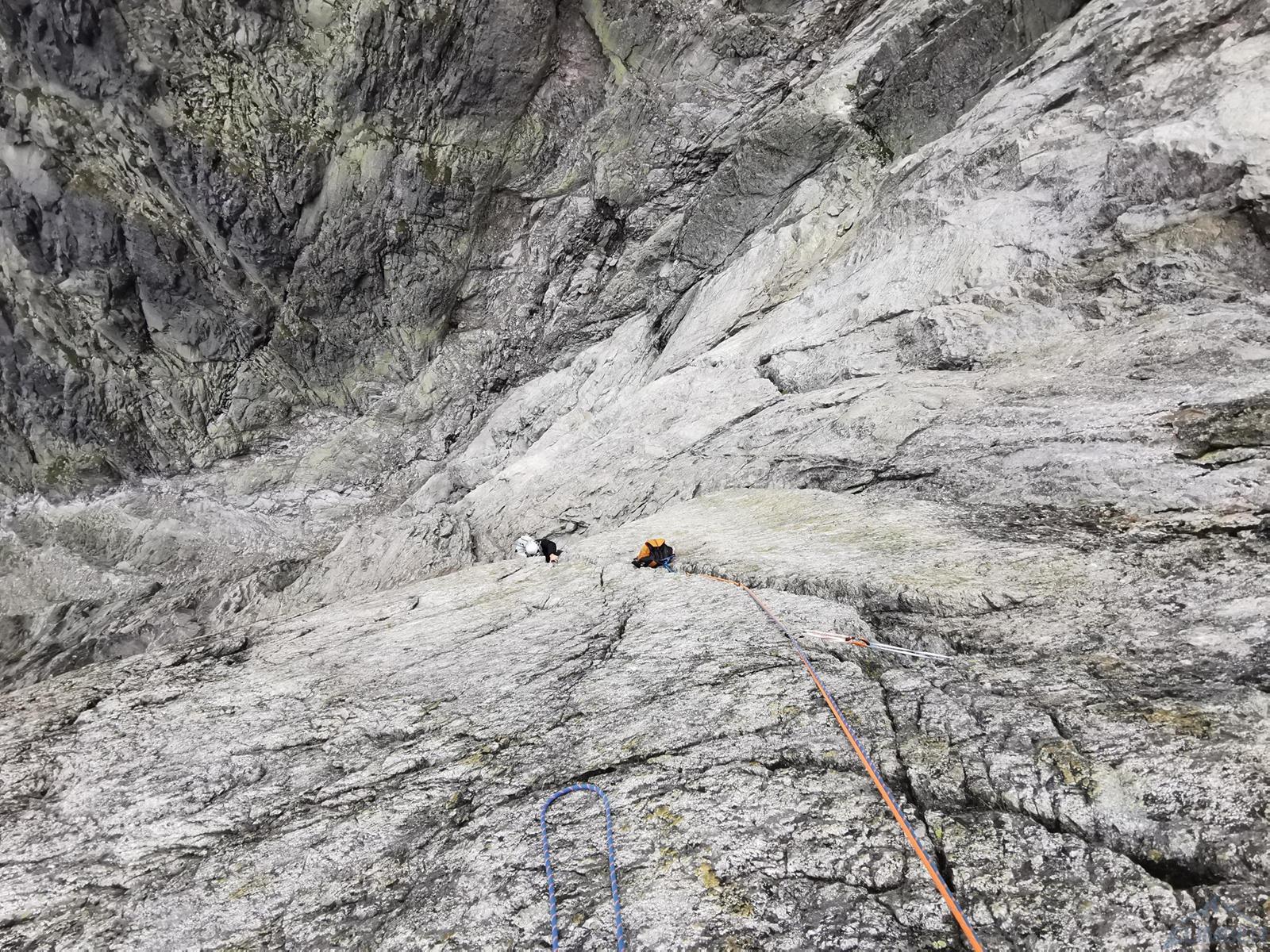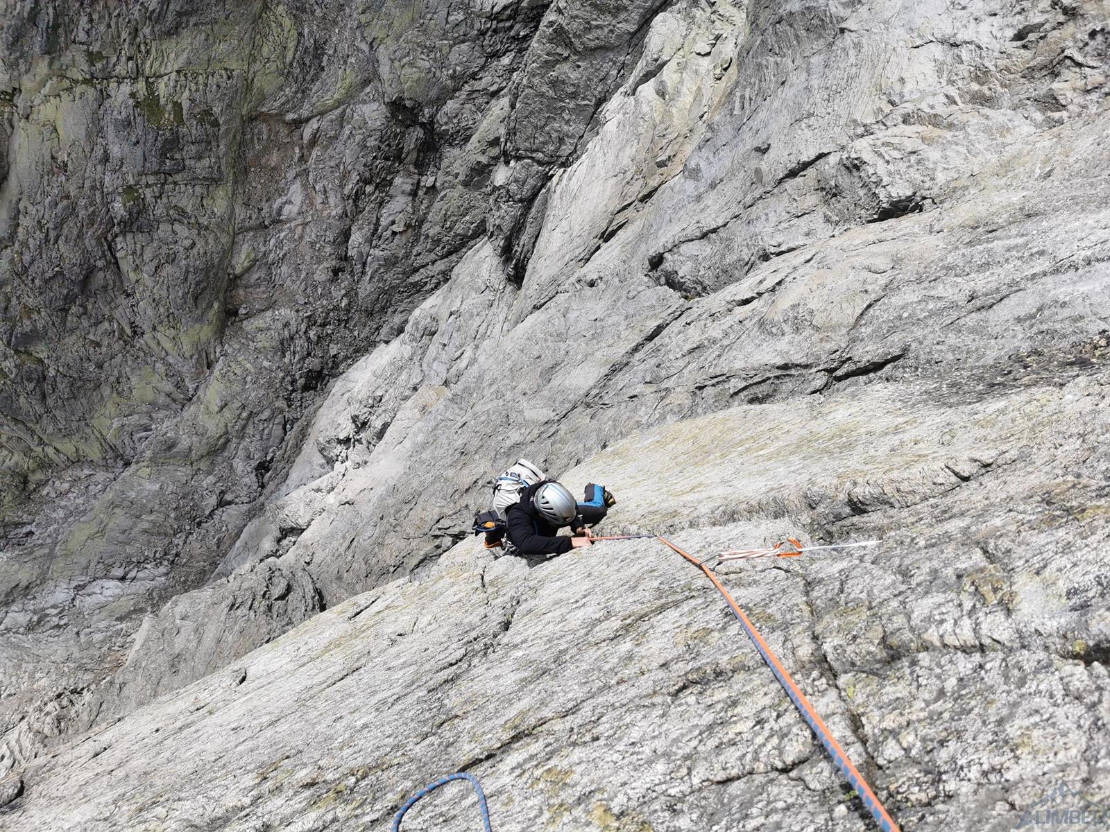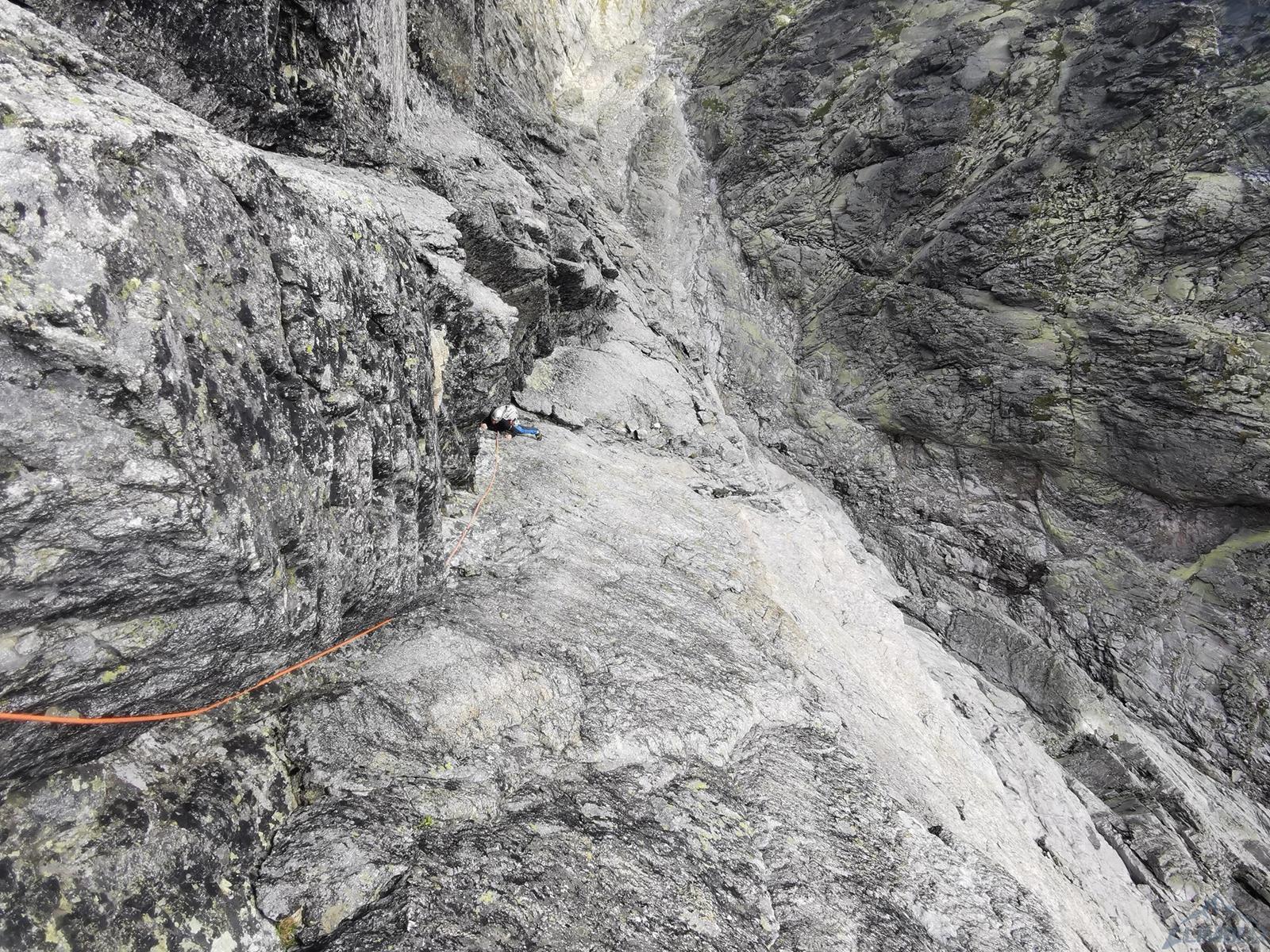 Druga próba kończy się niepowodzeniem i kosztuje mnie sporo sił – jestem bardzo zaskoczony tym co się tutaj wyrabia, nie ma co zwalać na mokre rysy i wilgotne stopnie 😊. Łukasz marznie na stanowisku ponad godzinę i zaczyna naciskać by odpuścić klasykę lub jechać na dół – wypraszam jeszcze jedną próbę i ze smutkiem ale godzę się, że jeżeli spalę to pójdę dalej AF lub A0. Całe szczęście udaje się, nie zdradzam jednak jak by nie psuć zabawy – jeżeli ktoś jednak przejdzie ten odcinek OS-em to chylę czoła, jeżeli z plecakiem – kłaniam się w pas 😉. Według mnie VII, a i porównując do wielu innych dróg stawiając VII+ nikt by się raczej nie obraził. Kolega tylko przez chwilę próbuje iść klasycznie i stwierdza, że takiego czegoś jeszcze w Tatrach nie robił, po czym ładuje po przelotach – co jest dość męczące, do tego dochodzi walka z zaklinowaną kostką.