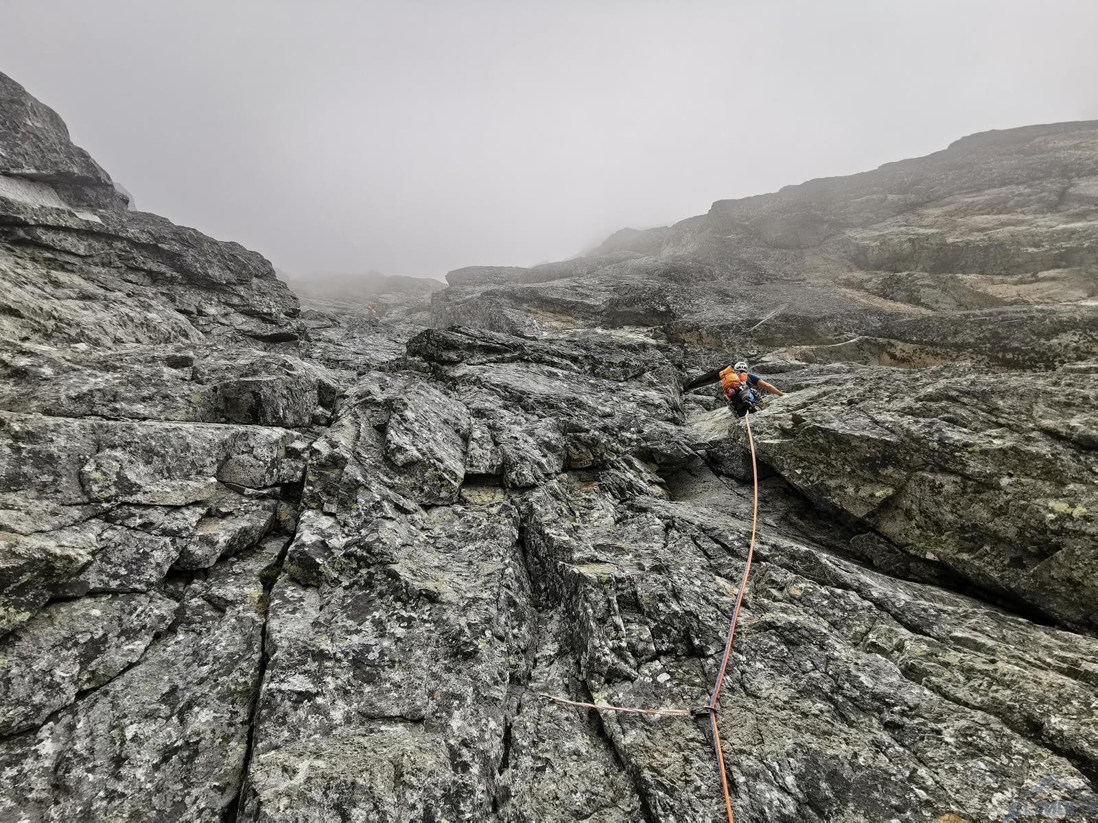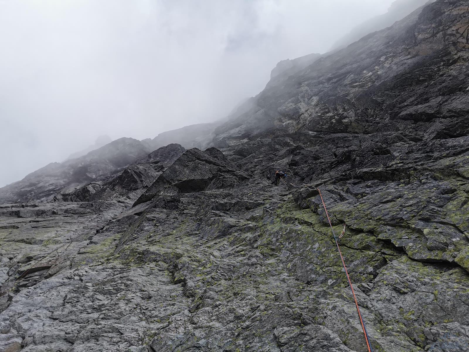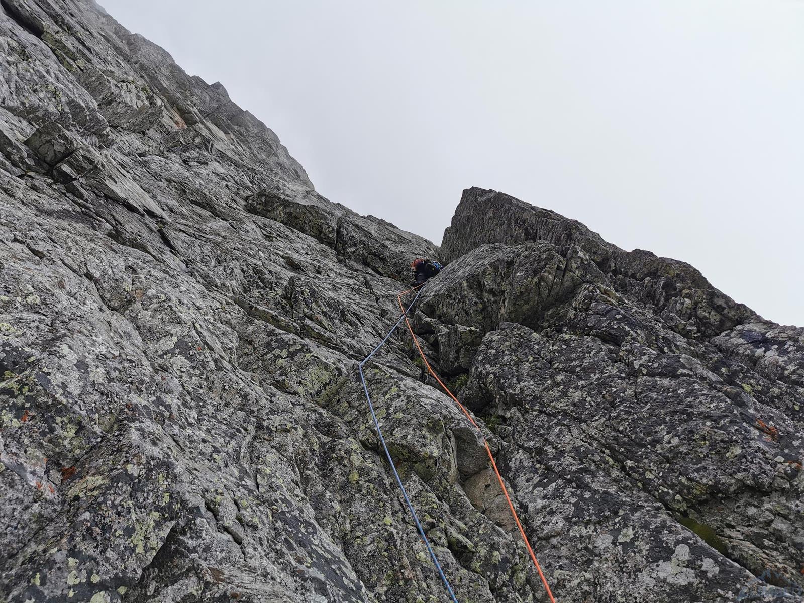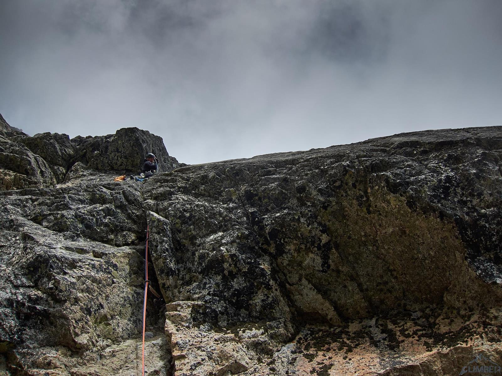 Druga próba kończy się niepowodzeniem i kosztuje mnie sporo sił – jestem bardzo zaskoczony tym co się tutaj wyrabia, nie ma co zwalać na mokre rysy i wilgotne stopnie 😊. Łukasz marznie na stanowisku ponad godzinę i zaczyna naciskać by odpuścić klasykę lub jechać na dół – wypraszam jeszcze jedną próbę i ze smutkiem ale godzę się, że jeżeli spalę to pójdę dalej AF lub A0. Całe szczęście udaje się, nie zdradzam jednak jak by nie psuć zabawy – jeżeli ktoś jednak przejdzie ten odcinek OS-em to chylę czoła, jeżeli z plecakiem – kłaniam się w pas 😉. Według mnie VII, a i porównując do wielu innych dróg stawiając VII+ nikt by się raczej nie obraził. Kolega tylko przez chwilę próbuje iść klasycznie i stwierdza, że takiego czegoś jeszcze w Tatrach nie robił, po czym ładuje po przelotach – co jest dość męczące, do tego dochodzi walka z zaklinowaną kostką.
