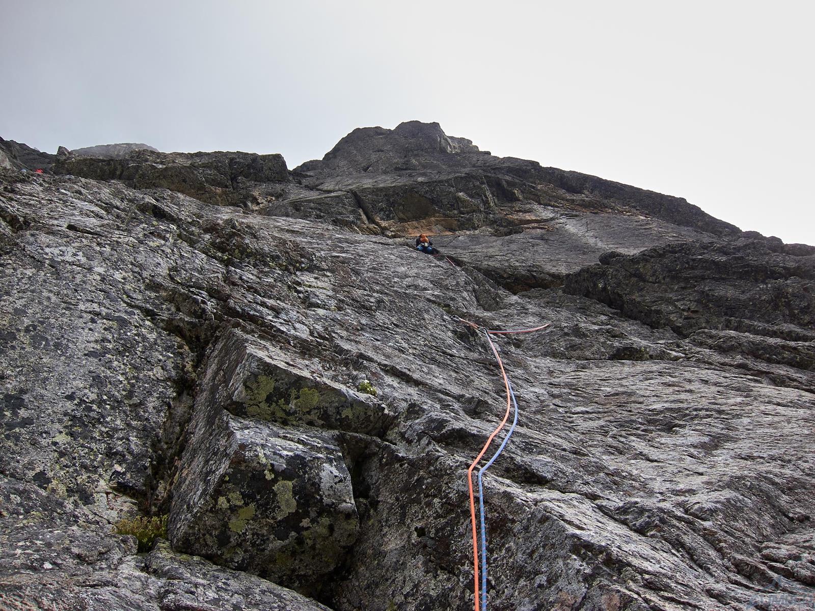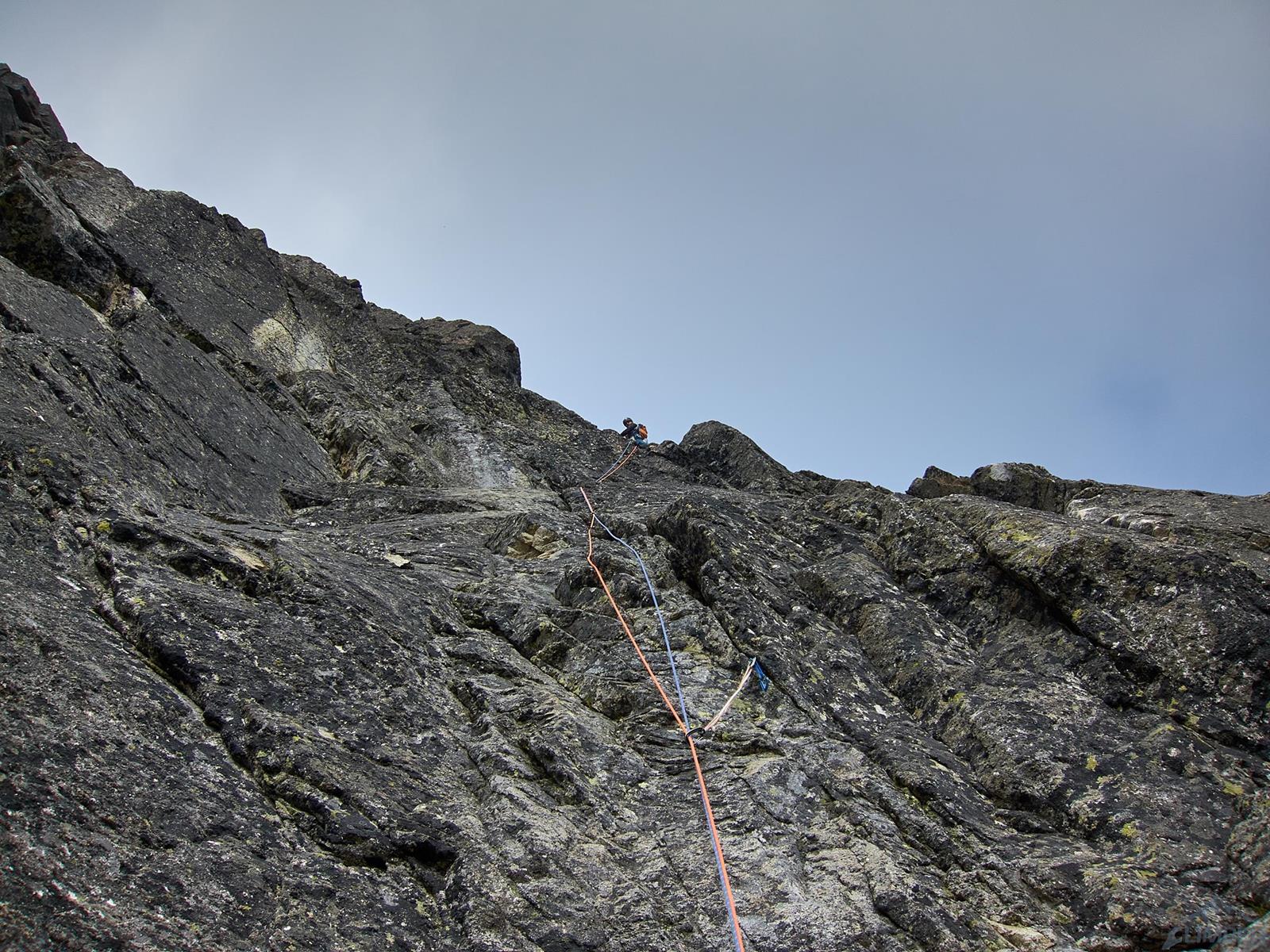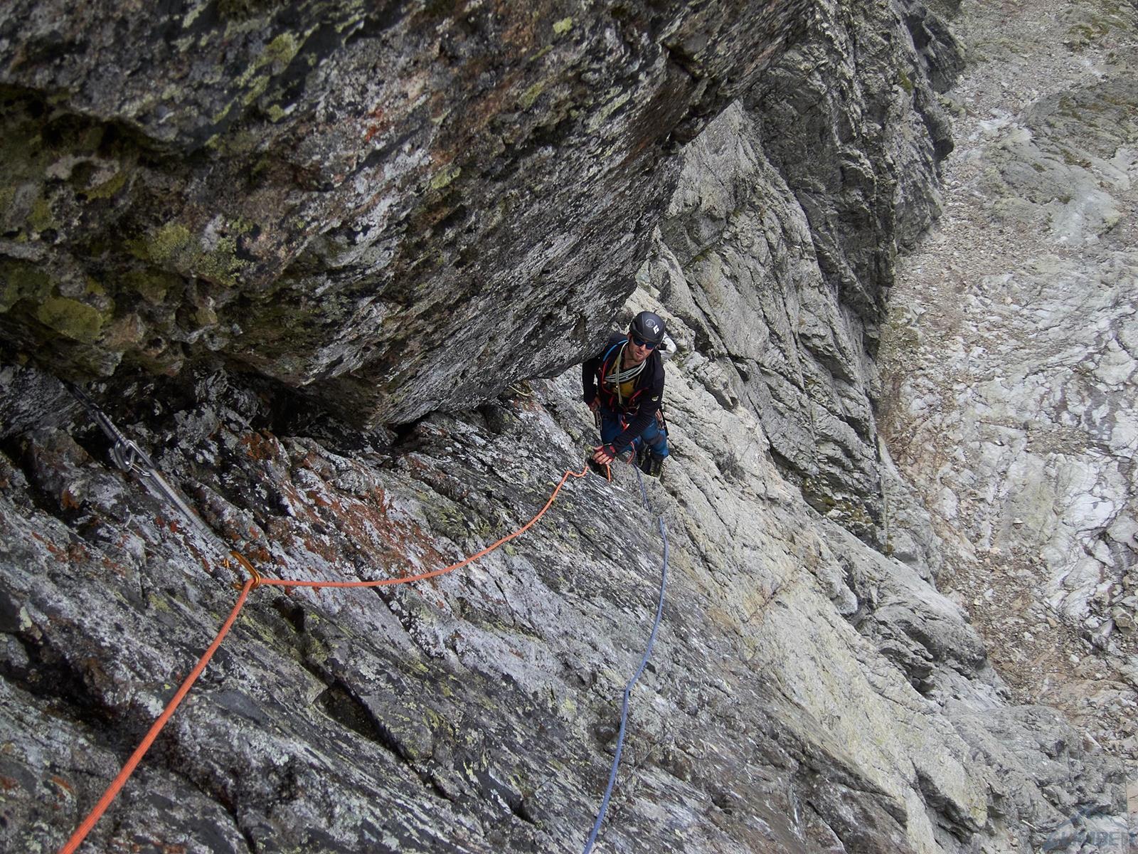 Wyciąg piąty (VII-, 30m) okazuje się bowiem bardzo wymagający – pęknięcie w okapie już z dołu wygląda podejrzanie, a rzeczywistość okazuje się jeszcze gorsza i szybko łapię blok nie potrafiąc się poustawiać. Do starych haków (drewniany kołek raczej się nie przydaje) dorzucam swój sprzęt (średnie friendy i kości), po czym bardzo długo próbuję wymyślić jak wyjść z przewieszenia. Jeden fragment jest naprawdę niebanalny, do tego wyżej jest jeszcze kilka ciekawych ruchów. Po wyjściu z trudności na dojściu do stanowiska czeka jeszcze rysa w płycie, jest jednak łatwiejsza, nie idę więc dalej tylko zostawiam tu plecak (który przeszkadza w komino-rysie) i wracam na dół.
