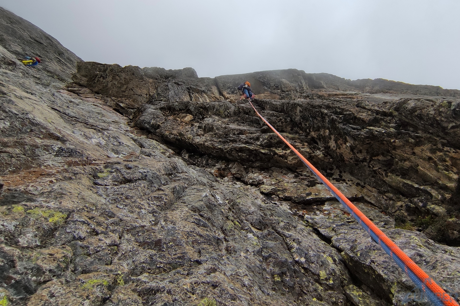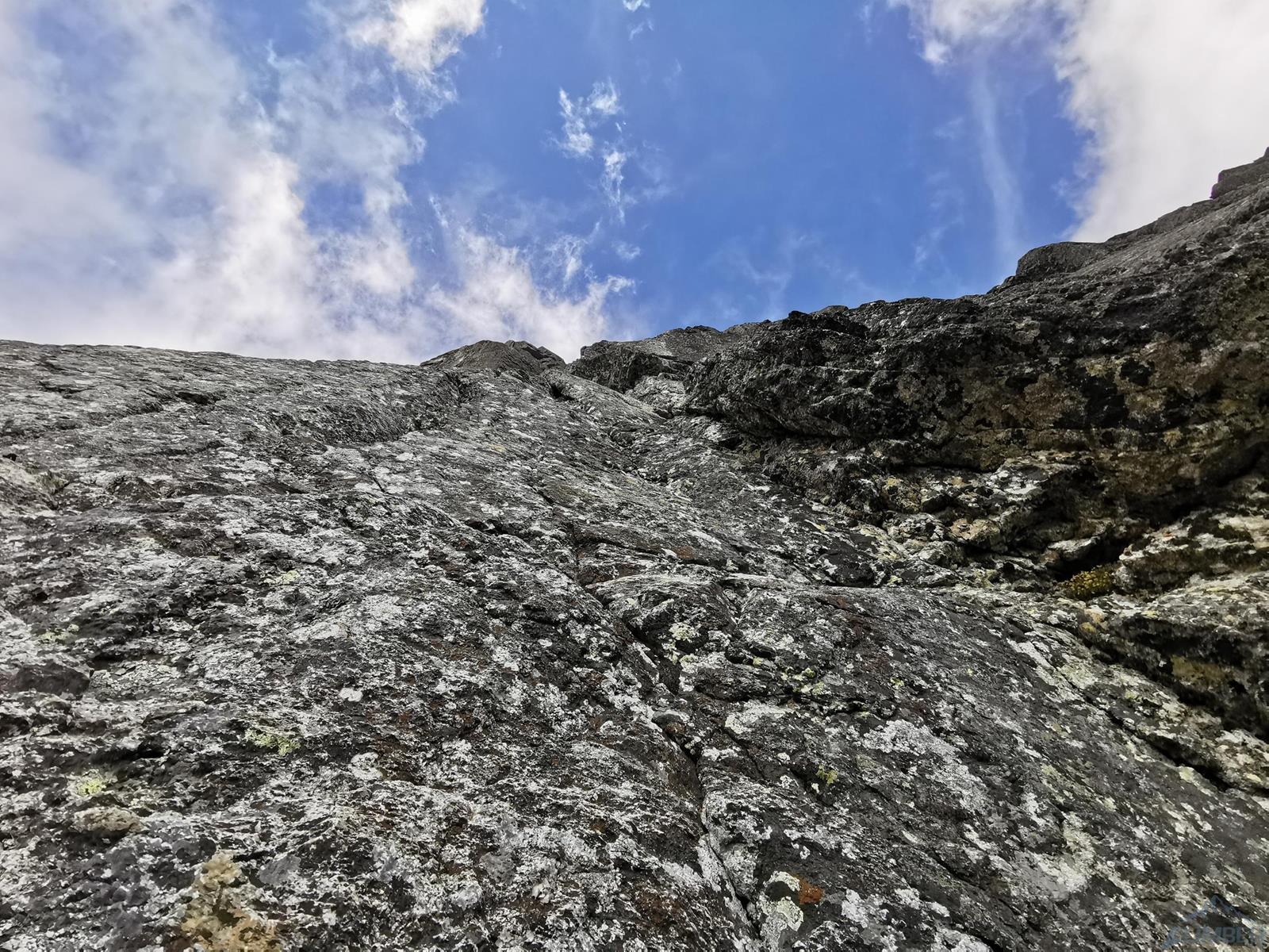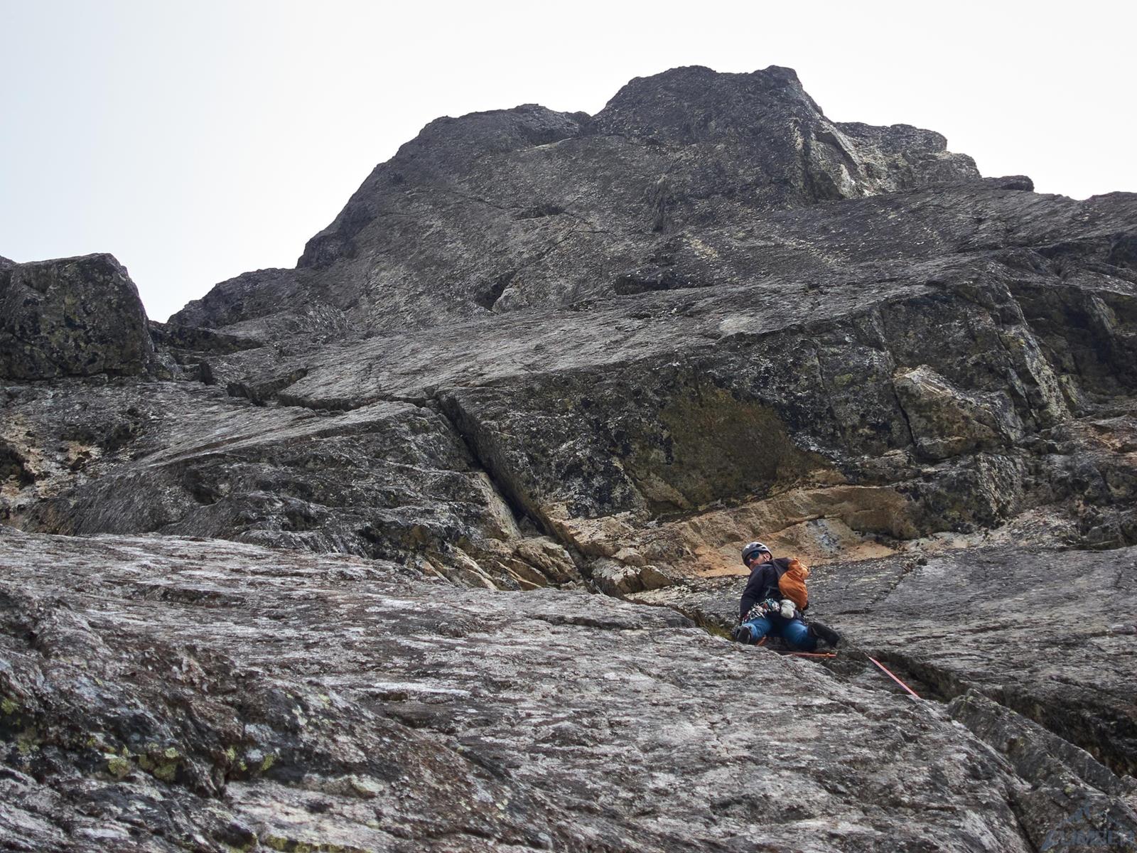 Wyciąg piąty (VII-, 30m) okazuje się bowiem bardzo wymagający – pęknięcie w okapie już z dołu wygląda podejrzanie, a rzeczywistość okazuje się jeszcze gorsza i szybko łapię blok nie potrafiąc się poustawiać. Do starych haków (drewniany kołek raczej się nie przydaje) dorzucam swój sprzęt (średnie friendy i kości), po czym bardzo długo próbuję wymyślić jak wyjść z przewieszenia. Jeden fragment jest naprawdę niebanalny, do tego wyżej jest jeszcze kilka ciekawych ruchów. Po wyjściu z trudności na dojściu do stanowiska czeka jeszcze rysa w płycie, jest jednak łatwiejsza, nie idę więc dalej tylko zostawiam tu plecak (który przeszkadza w komino-rysie) i wracam na dół.