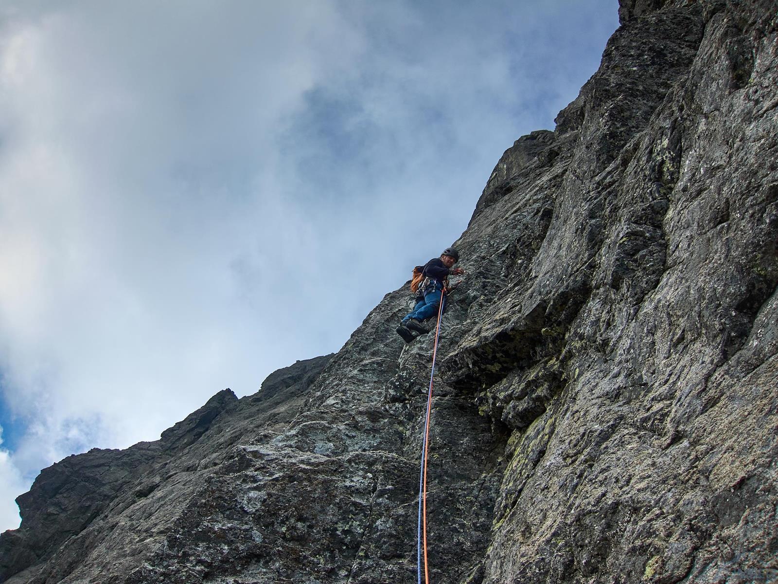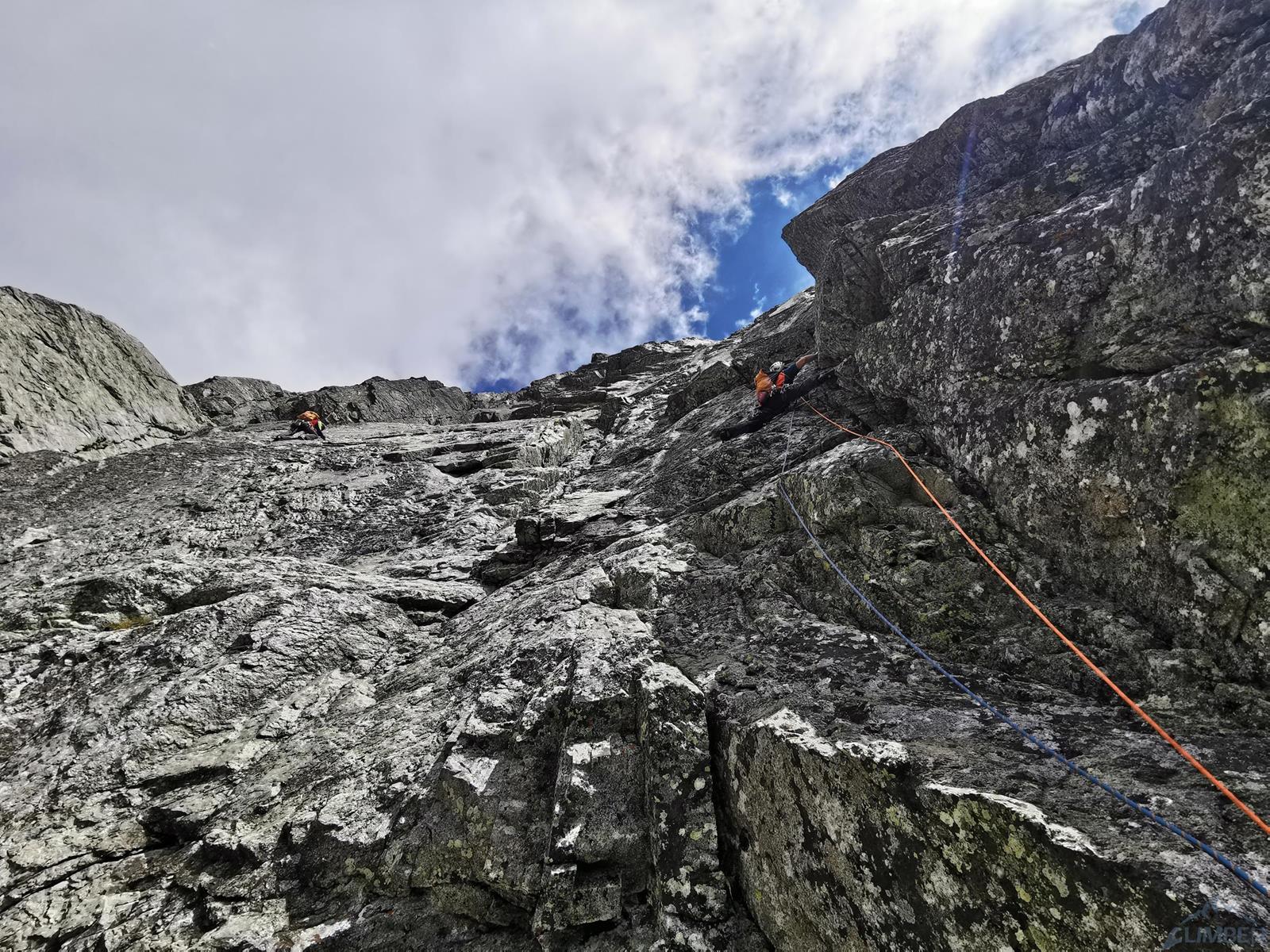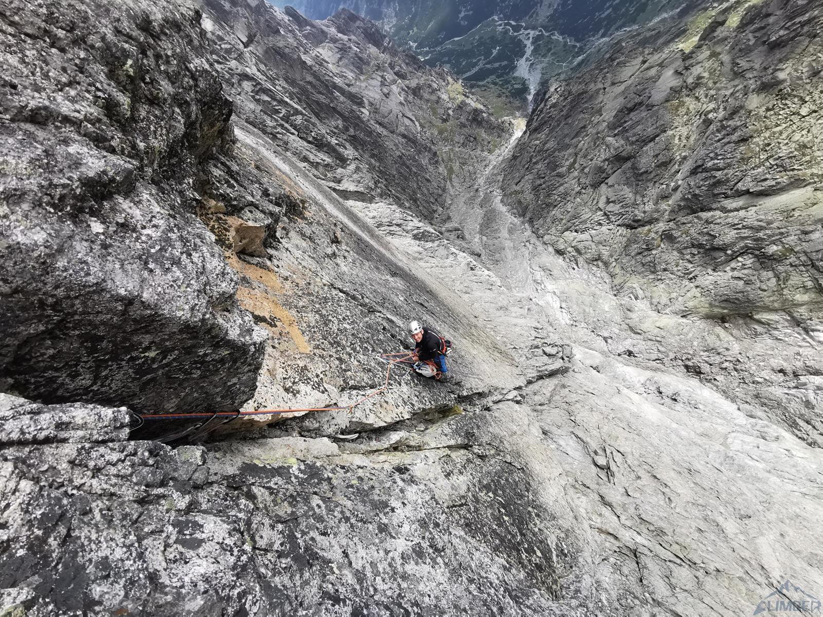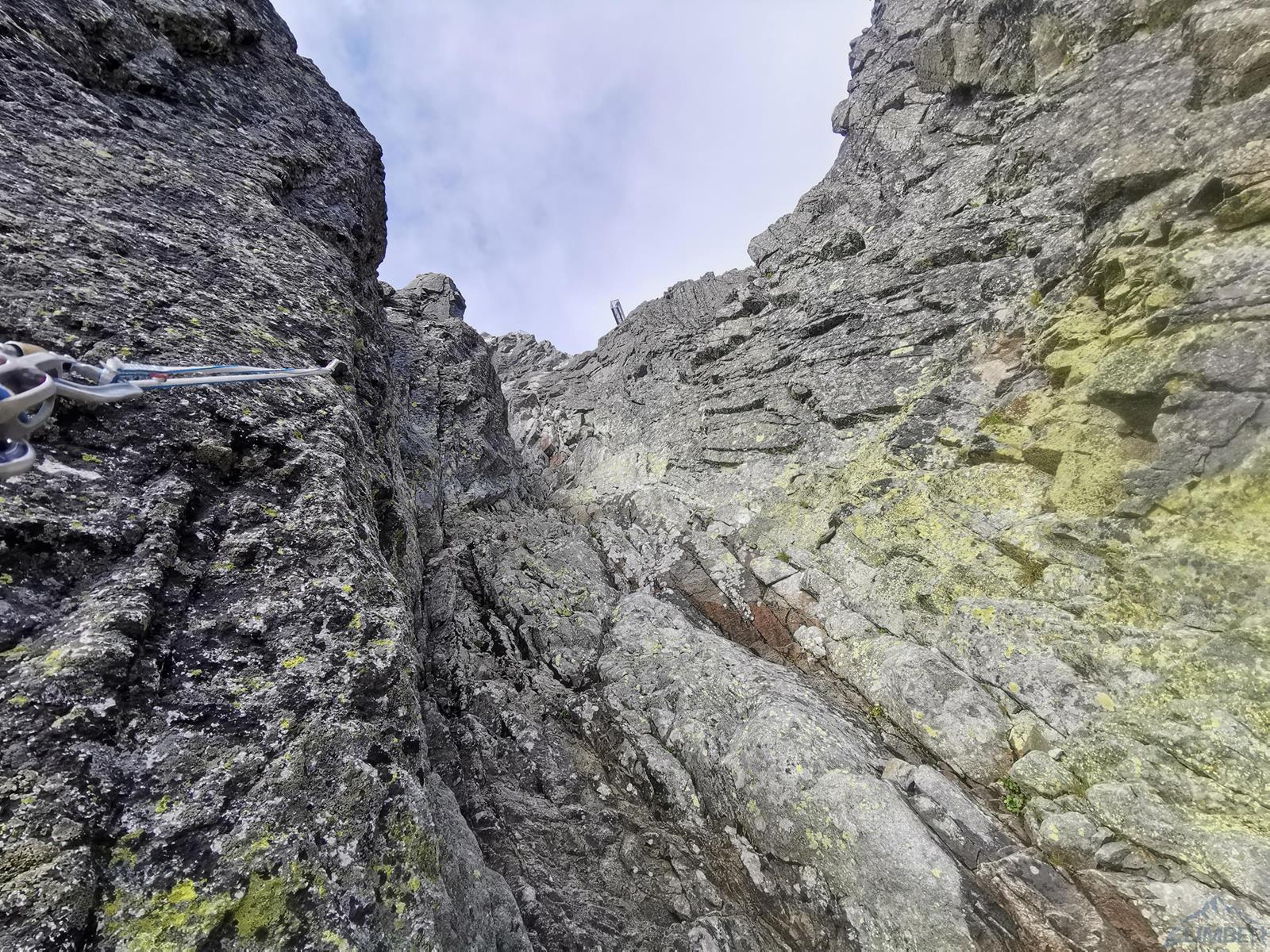 Niebo w końcu robi się niebieskie i pojawia się Słońce, czas mamy jednak bardzo słaby i trzeba się sprężać by mieć szansę wyrobienia się na kolejkę. Szósty wyciąg (IV/V, 50m) staram się więc przejść jak najszybciej – początek prowadzi zacięciem i pięknym filarkiem, potem czeka jeszcze ładniejsza ale dość słabo asekurowalna płyta oraz niebanalne zacięcie i wyjście do stanowiska na prawo, naprawdę kawał fajnego wspinania! Siódmy wyciąg startujemy ciekawą płytką, po czym uciekamy w prawo za przełamanie ściany – w ten sposób wyciąg zrobimy za III/IV, prosto lepiej się nie pchać – kolega miał tak linę i musiał się sporo napocić by wyjść z przewieszki, która z dołu wyglądała niewinnie. Po przewinięciu w łatwy teren (z dołu dochodzi Birkenmajer) nie robię stanowiska tylko ruszam dalej – łatwy komin i zagruzowany żlebik wyprowadzają na duża półkę nad Hokejką, dalej w kociołku znajdziemy ringa stanowiskowego z tej drogi, udaje się dociągnąć do niego na 60 metrów. Gdy dołącza do mnie kolega, chowamy sprzęt i liny, przebieramy buty i ruszamy w kierunku widocznego metalowego tarasu na szczycie (II, ok. 80 m).