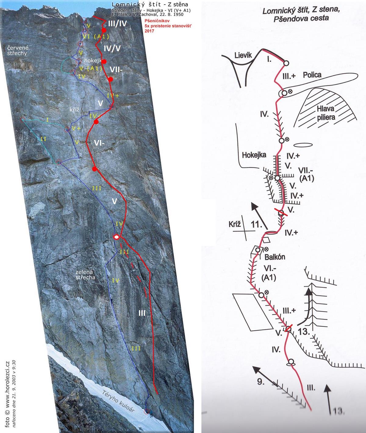 Pšendova cesta (opisywana też nazwiskiem autora - Pšeničnikov) wchodzi w ścianę na prawo od zacięcia startowego Stanisławskiego/Hokejki – wspinamy się w płycie po dużych chwytach (III), kontynuujemy wyraźną rampą w lewo powyżej i pokonujemy lekko przewieszoną ściankę na lewo od komina (tu raczej IV) – po równo 60 metrach docierając do stanowiska wspólnego z Hokejką. Na drugim wyciągu (V, 30 m) zaczynamy w prawo trochę kruchym kominkiem i po przejściu przewieszki z rysą (hak) kierujemy się załupą skośnie w lewo aż do błyszczącego stanu z ringów - ładny odcinek ale lepszy byłby suchy. Na trzecim wyciągu (VI-, 20 m) startujemy wprost do góry i wchodzimy do zacięcia po prawej (haki) – tutaj kolega z powodu mokrych chwytów przeżywa ciężkie chwile i myśli o wycofie, w końcu jednak zbiera się na odwagę i rusza – wychodzi z zacięcia za kant w prawo, gdzie na balkoniku czeka stanowisko.