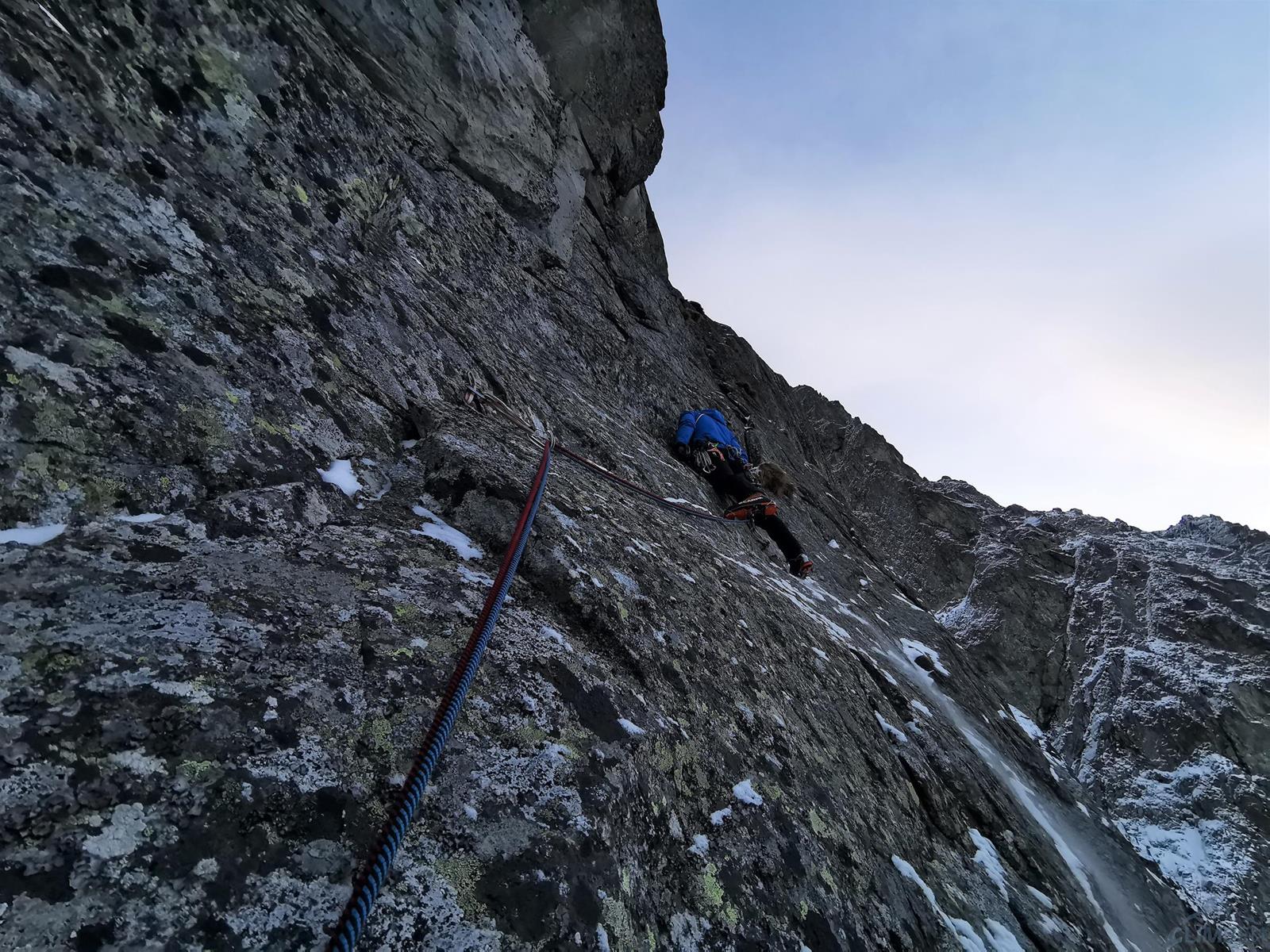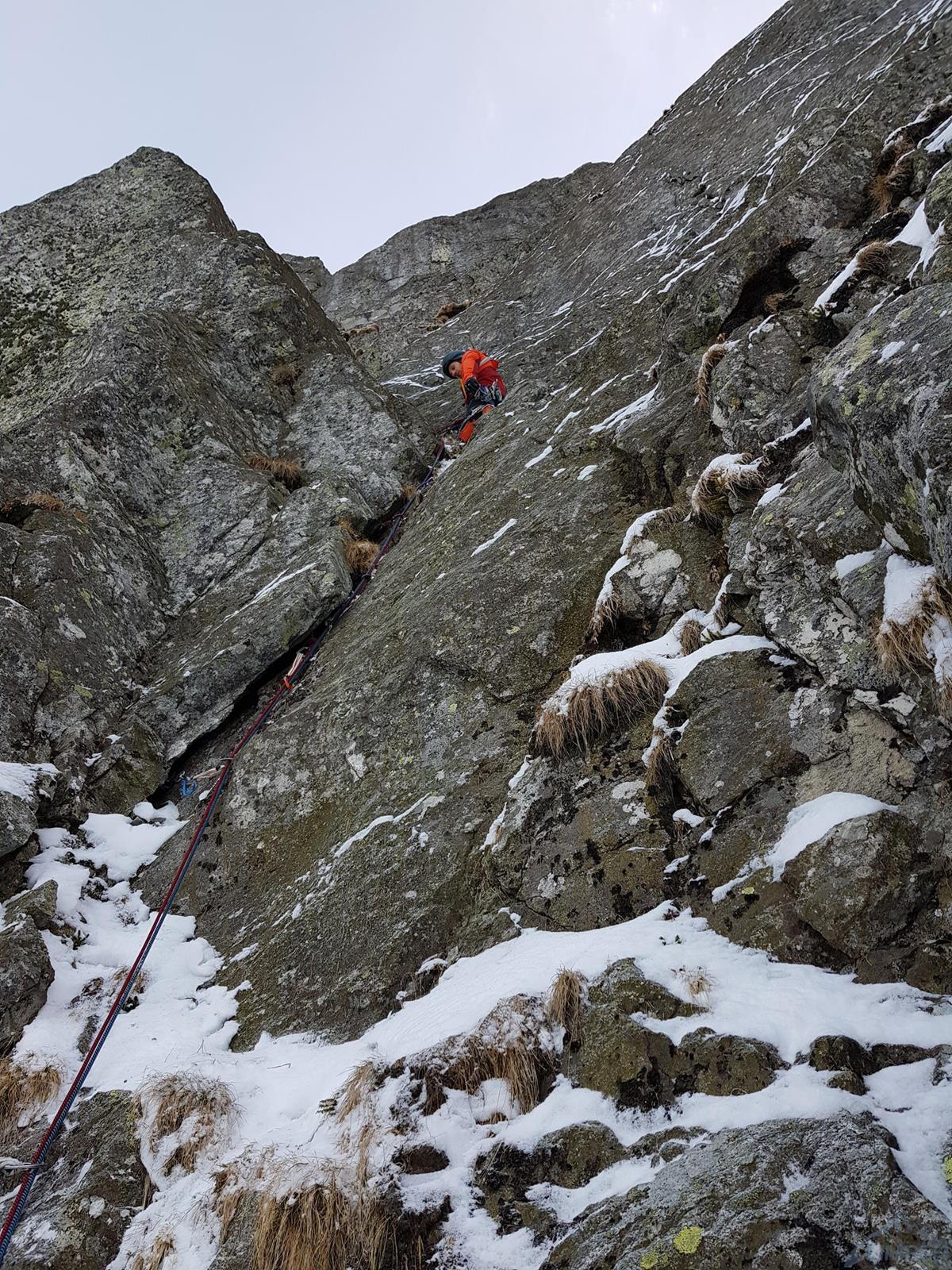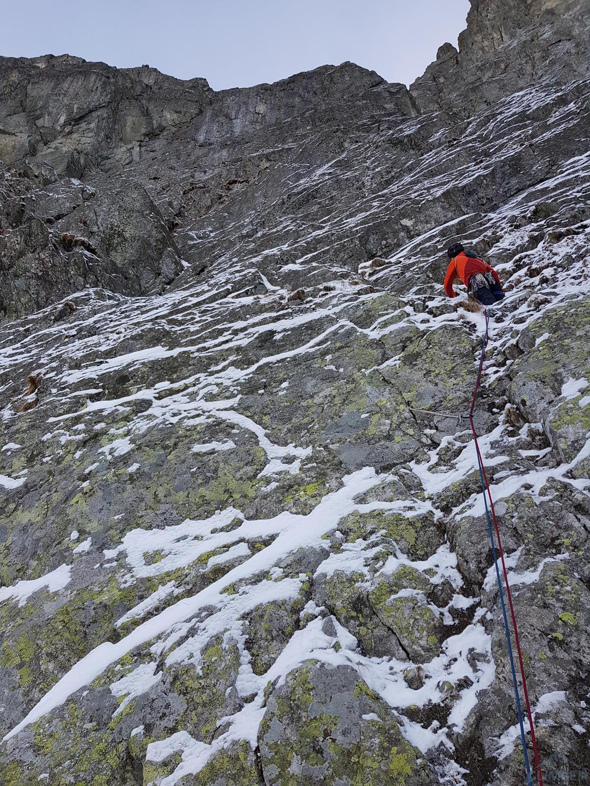 Na rozpoczęcie sezonu zimowego wybieramy się z Michałem do Doliny Kieżmarskiej – stwierdzamy, że idąc na kolejną z krótkich „piątkowych” dróg niedaleko schroniska będzie blisko, szybko i nie za trudno. Tym razem wybór pada na drogę Veliča (ok. M5+) na Kieżmarskiej Buli – dodatkową zachętą jest opis na Drytoolingu, według którego jest ciekawie i ewidentnie. Tak też jest, jednak jak wiadomo zima rządzi się swoimi prawami i przy słabych warunkach oraz zbyt luźnym podejściu akcja zajmuje nam dużo więcej niż planowaliśmy. Drogę polecamy ale mimo niewielkiej długości należy raczej do kategorii poważniejszych w tej wycenie - zarówno jeśli chodzi o wspinanie jak i asekurację.