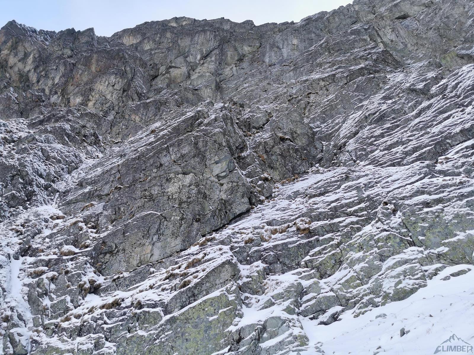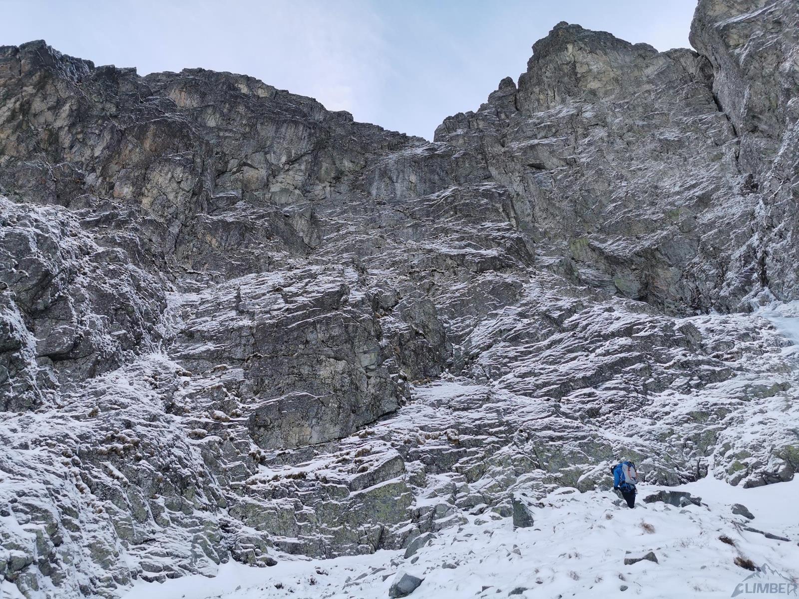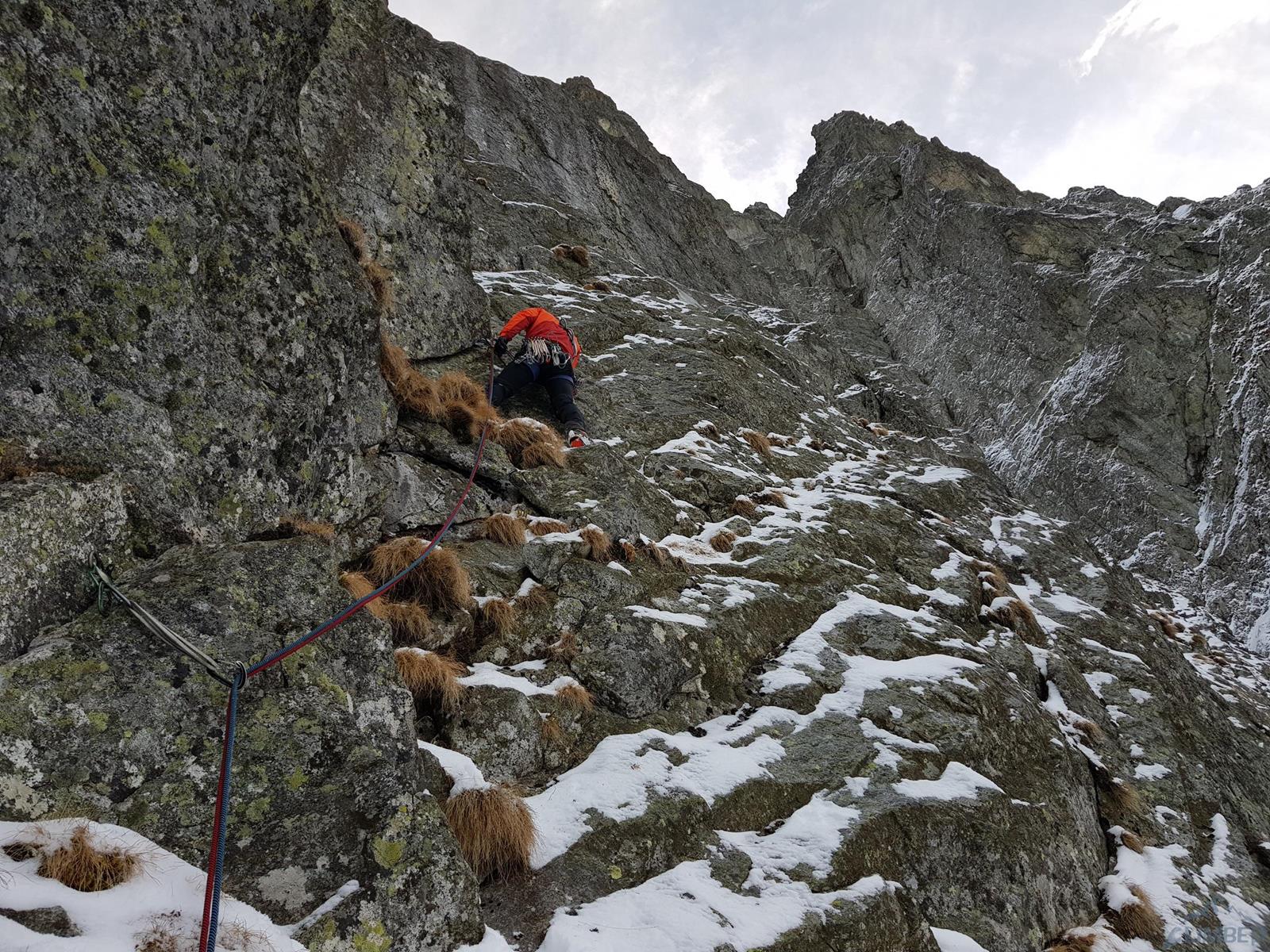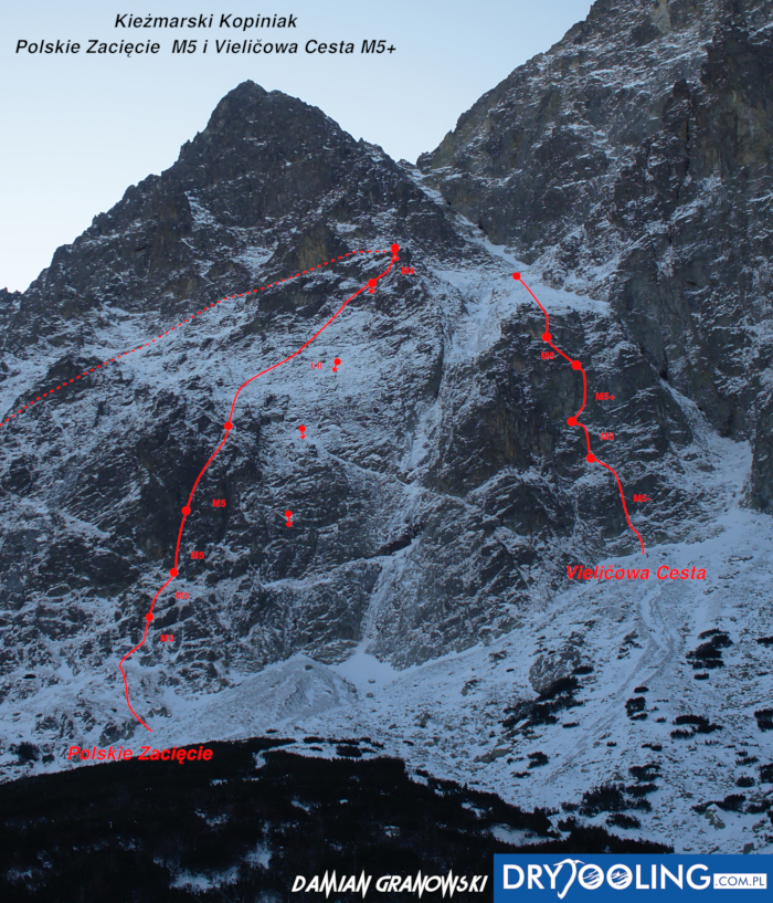 Na rozpoczęcie sezonu zimowego wybieramy się z Michałem do Doliny Kieżmarskiej – stwierdzamy, że idąc na kolejną z krótkich „piątkowych” dróg niedaleko schroniska będzie blisko, szybko i nie za trudno. Tym razem wybór pada na drogę Veliča (ok. M5+) na Kieżmarskiej Buli – dodatkową zachętą jest opis na Drytoolingu, według którego jest ciekawie i ewidentnie. Tak też jest, jednak jak wiadomo zima rządzi się swoimi prawami i przy słabych warunkach oraz zbyt luźnym podejściu akcja zajmuje nam dużo więcej niż planowaliśmy. Drogę polecamy ale mimo niewielkiej długości należy raczej do kategorii poważniejszych w tej wycenie - zarówno jeśli chodzi o wspinanie jak i asekurację.