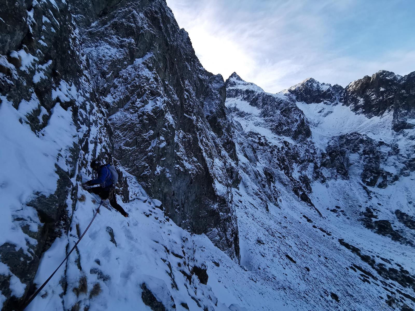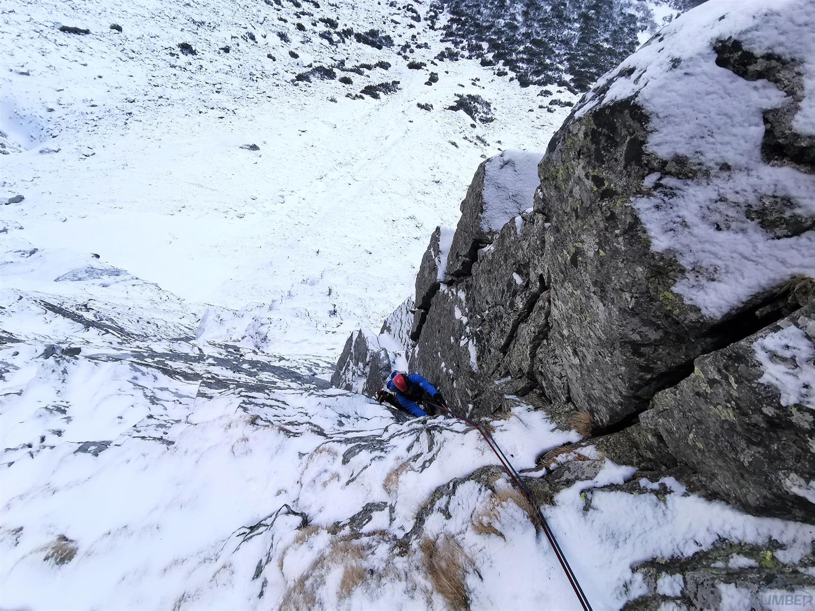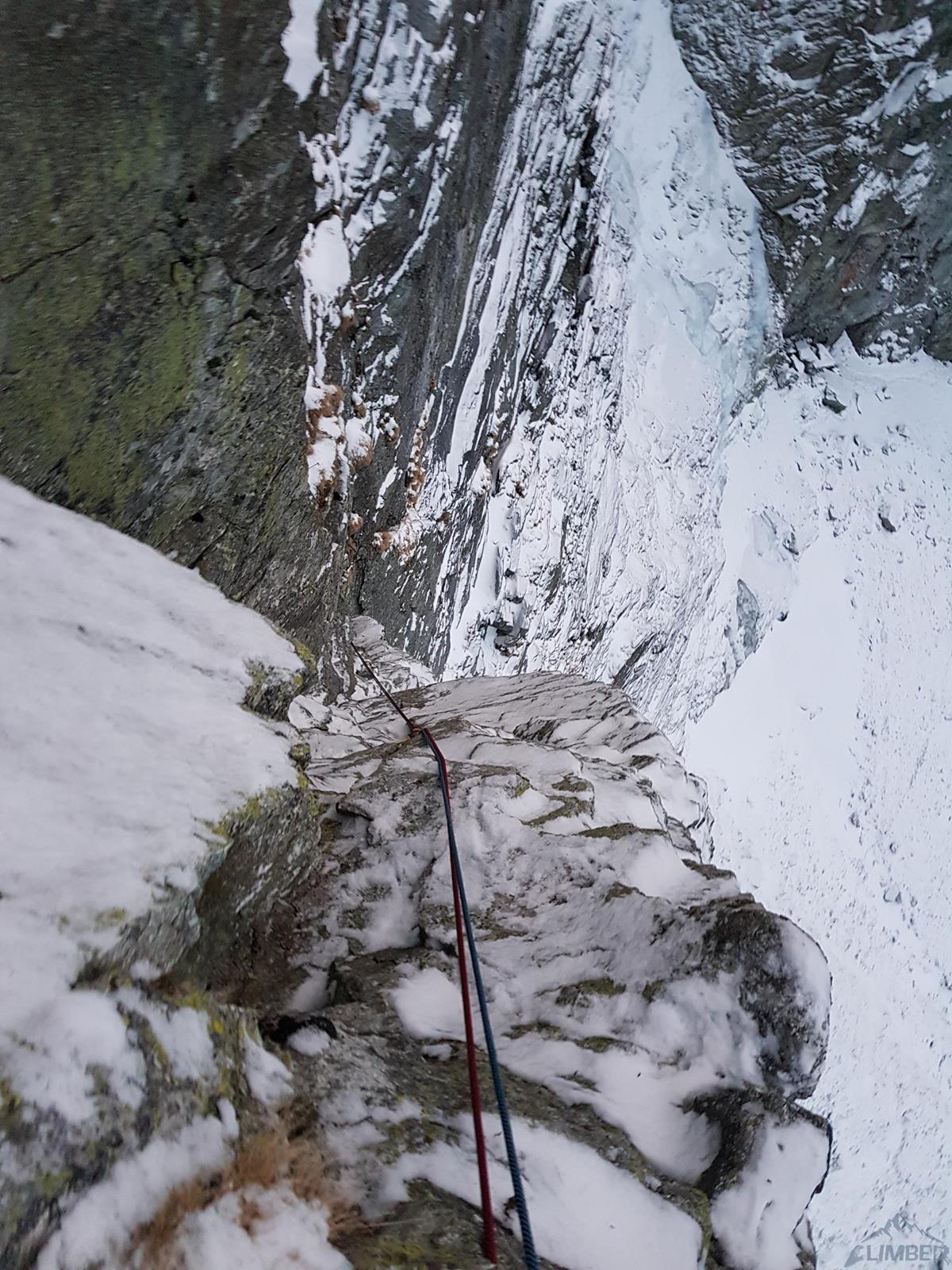 Kolejny wyciąg (M4) to fajne mikstowe wspinanie – idziemy skośnie w lewo i docieramy do ostatniego skalnego spiętrzenia (po ok. 40 metrach), kolega robi tu stanowisko by lina nie skończyła się w płaskim terenie. Dzięki temu po ok. 30 metrach dojść można do łańcucha zlokalizowanego na skraju galerii po prawej stronie (zjazdy jak opisywałem TUTAJ), a w przypadku gdy schodzimy - zrobić stanowisku przy skałach powyżej lub od razu przejść na lotną. My postanawiamy przedłużyć sobie przygodę (jakby była za krótka 😉) i wychodzimy na Kieżmarski Kopiniak (Turnię Szczepańskiego), z której schodzimy Niemiecką Drabiną – śnieg jest bardzo kiepski a skalne i trawiaste progi niepodsypane dlatego trwa to bardzo długo. Zamiast lekkiego rozruchu skończyło się więc na nieplanowanych zmaganiach w ścianie i męczącym zejściu. Słowem – zima!