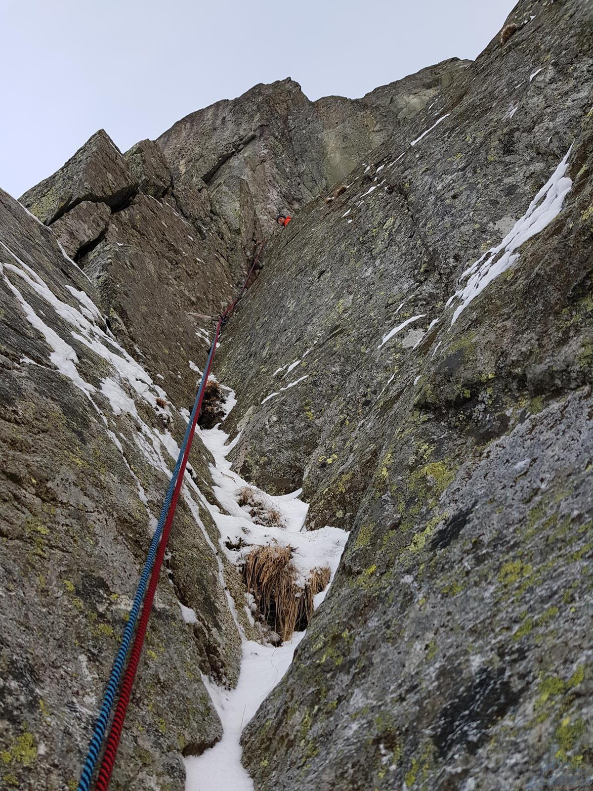 Po bardzo niespiesznym podejściu do Zielonego Stawu i długiej przerwie w schronisku ruszamy w kierunku naszej ściany. Jest prawie dwunasta ale to przecież tylko pięć wyciągów i szybkie zjazdy do Kotła albo spacer Drabiną – po co nam druga czołówka, waży przecież tak wiele 😉. Pod drogą konsternacja – płyta na starcie jest zasypana luźnym śniegiem i nie wygląda na M3, a powyżej dwa zacięcia zamiast jednego jak w topo, a zdjęcia z tego odcinka brak. Po kilku przymiarkach wybieram w końcu optymalne miejsce do wejścia w drogę, trzy metry wyżej robi się łatwiej i już wiadomo o co chodzi – gdy śniegu pod ścianą jest mało start jest trudniejszy. Po łatwiejszych trawkach czeka czujny w tych warunkach trawers po przyprószonej płycie w lewo i decyzja czy wchodzić w zacięcie bliższe czy dalsze. Foto-topo z przewodnika sugeruje dalsze ale wygląda paskudnie, poza tym pod tym bliższym widać haka – a więc mimo wszystko tam. By lina lepiej szła robię tutaj stanowisko (stary hak wypada ale wbijam go w lepsze miejsce, teraz powinien siedzieć) i wg mnie to dobra opcja i wtedy pominąć można kolejny stan ze schematu.