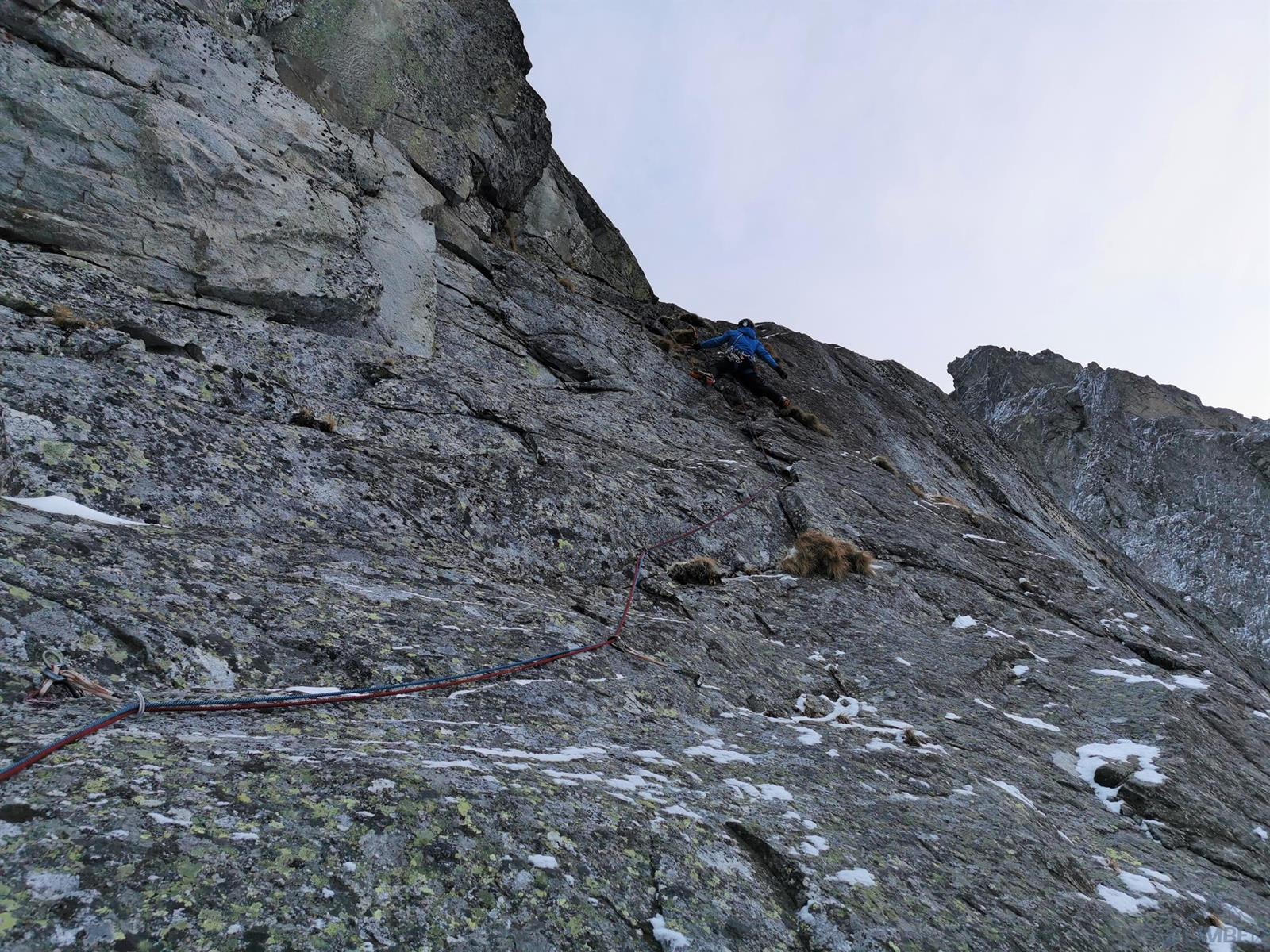 Kolejny odcinek (M5+, 50m) w dolnej części oferuje bardzo ciekawe i ciągowe wspinanie, przydaje się więcej średnich friendów. Zaczynamy od pięknej poziomej rysy na dziaby (raki na tarcie), delikatnie wchodzimy na kępkę trawy i kontynuujemy wzdłuż pionowych pęknięć do góry. Na koniec trawersujemy w lewo przez płytowe podchwyty i dochodzimy pod kruchą załupę. Ekipa Damiana robiła w tym miejscu półwiszący stan, Michał jednak ciągnie dalej zgodnie z oryginalnym schematem - lina idzie dość ciężko ale da radę. Odcinek jest dość czujny (M4+) i kruchy, po jego przejściu docieramy do wygodnej półki i robimy stan. Gdy idę w ślady kolegi robi się ciemno – długo więc męczę kłopotliwe na drugiego fragmenty i czyszczenie sprzętu. Pomaga patent z latarką w telefonie włożonym do kieszeni na piersi i zablokowanym za pomocą zamka 😊.