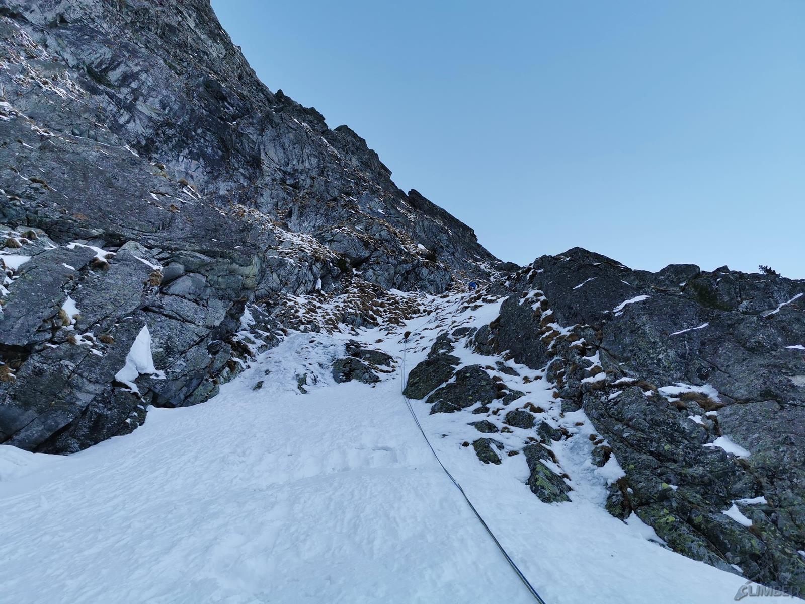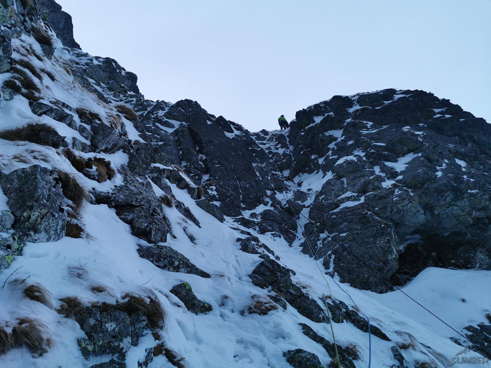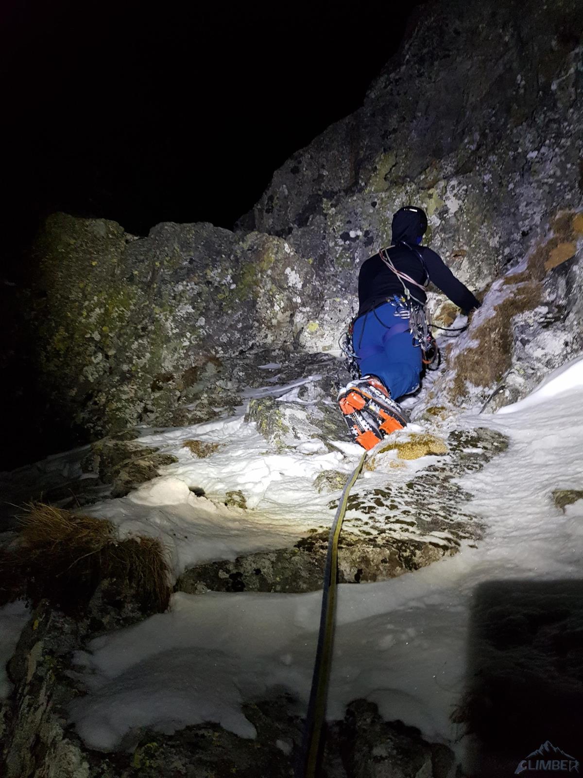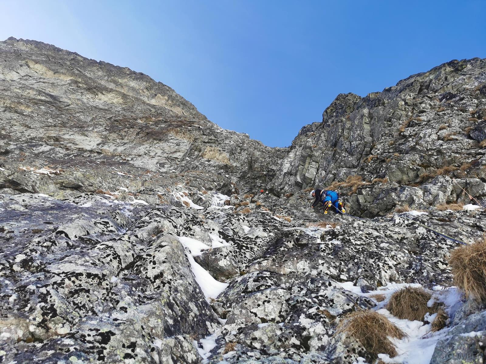 Stąd latem rusza się do góry na Półkę z Blokami i trawersuje płytami (czujna końcówka), my podobnie jak zespół przed nami decydujemy się jednak na bardziej narzucający się zimą wariant. Szymon wspina się poziomo w lewo i po pokonaniu sprężnego kominka (ok. M5, w Mastertopo VI) dociera do półki ze spitem, do której dochodzi oryginalna linia. Stanowisko znajduje się kilka metrów dalej – warto z niego skorzystać, na następnym wyciągu (skałami do góry trzymając się prawej, ok. M4+) wygodnie dotrzemy wtedy pod Dolny Komin. Ten po zmianie na prowadzeniu pokonujemy szybko i bezproblemowo – dzięki polewce lodowej jest łatwiej niż spodziewane M5. Ostatnie metry to już łatwy śnieżny żleb doprowadzający pod kluczowe trudności drogi, Ściankę Problemową (M7-/M7).