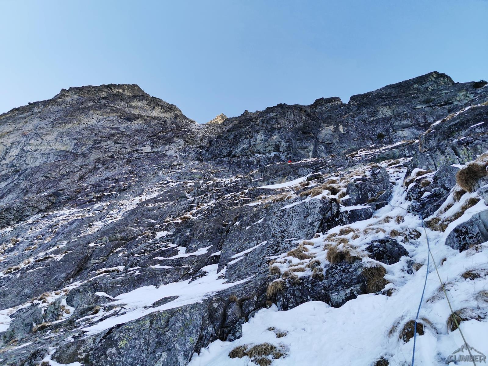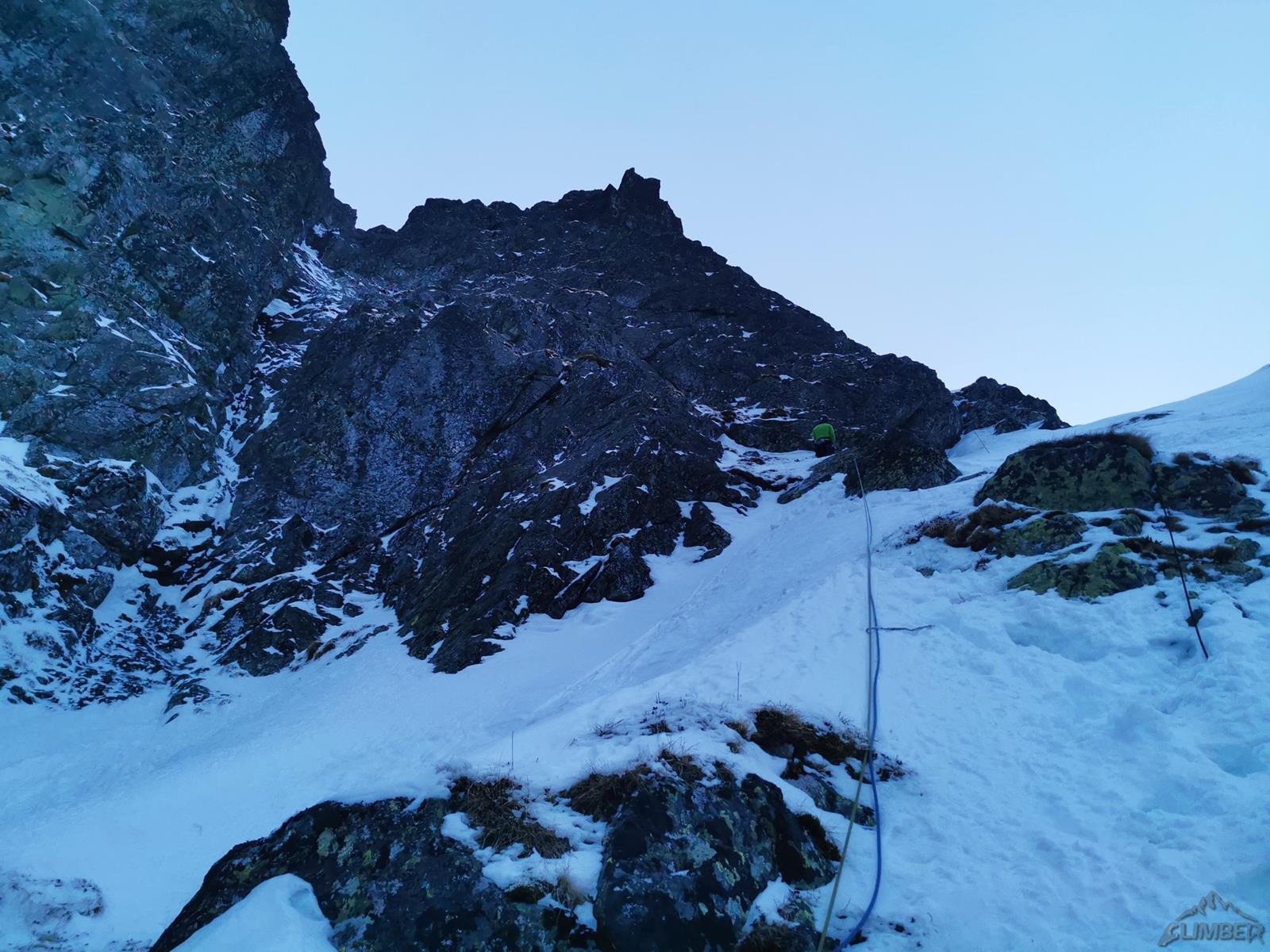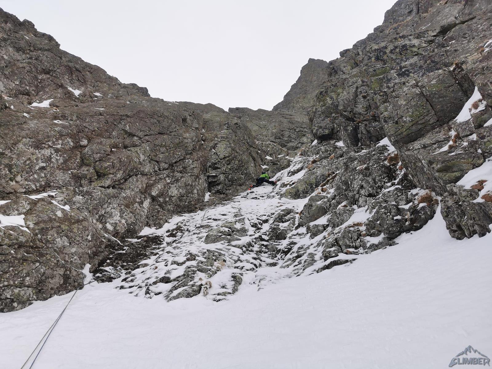 Stąd latem rusza się do góry na Półkę z Blokami i trawersuje płytami (czujna końcówka), my podobnie jak zespół przed nami decydujemy się jednak na bardziej narzucający się zimą wariant. Szymon wspina się poziomo w lewo i po pokonaniu sprężnego kominka (ok. M5, w Mastertopo VI) dociera do półki ze spitem, do której dochodzi oryginalna linia. Stanowisko znajduje się kilka metrów dalej – warto z niego skorzystać, na następnym wyciągu (skałami do góry trzymając się prawej, ok. M4+) wygodnie dotrzemy wtedy pod Dolny Komin. Ten po zmianie na prowadzeniu pokonujemy szybko i bezproblemowo – dzięki polewce lodowej jest łatwiej niż spodziewane M5. Ostatnie metry to już łatwy śnieżny żleb doprowadzający pod kluczowe trudności drogi, Ściankę Problemową (M7-/M7).