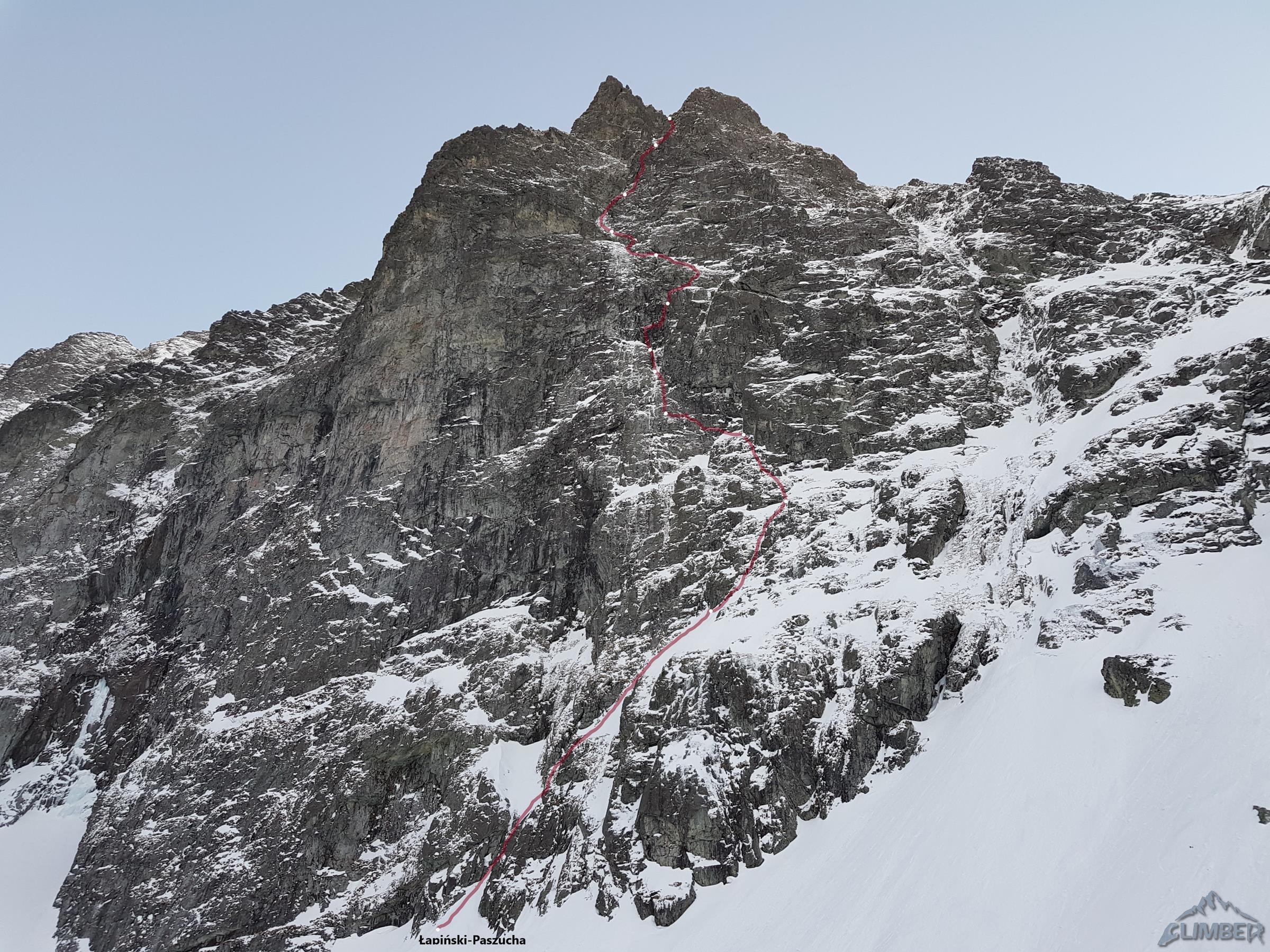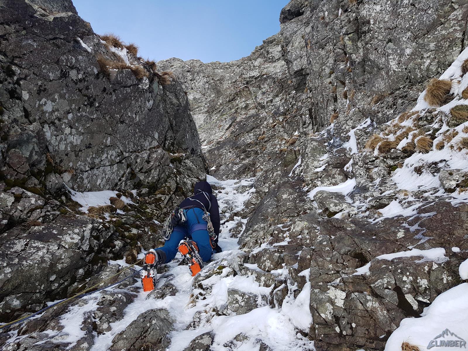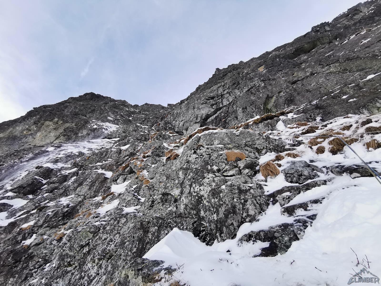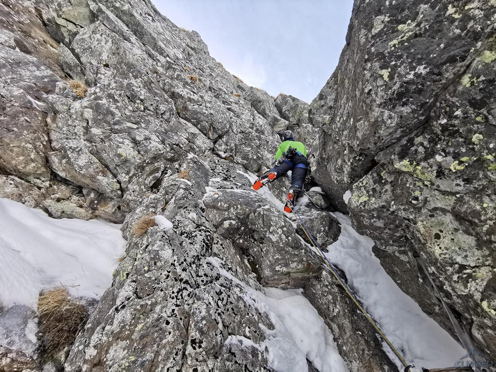 Stąd latem rusza się do góry na Półkę z Blokami i trawersuje płytami (czujna końcówka), my podobnie jak zespół przed nami decydujemy się jednak na bardziej narzucający się zimą wariant. Szymon wspina się poziomo w lewo i po pokonaniu sprężnego kominka (ok. M5, w Mastertopo VI) dociera do półki ze spitem, do której dochodzi oryginalna linia. Stanowisko znajduje się kilka metrów dalej – warto z niego skorzystać, na następnym wyciągu (skałami do góry trzymając się prawej, ok. M4+) wygodnie dotrzemy wtedy pod Dolny Komin. Ten po zmianie na prowadzeniu pokonujemy szybko i bezproblemowo – dzięki polewce lodowej jest łatwiej niż spodziewane M5. Ostatnie metry to już łatwy śnieżny żleb doprowadzający pod kluczowe trudności drogi, Ściankę Problemową (M7-/M7).