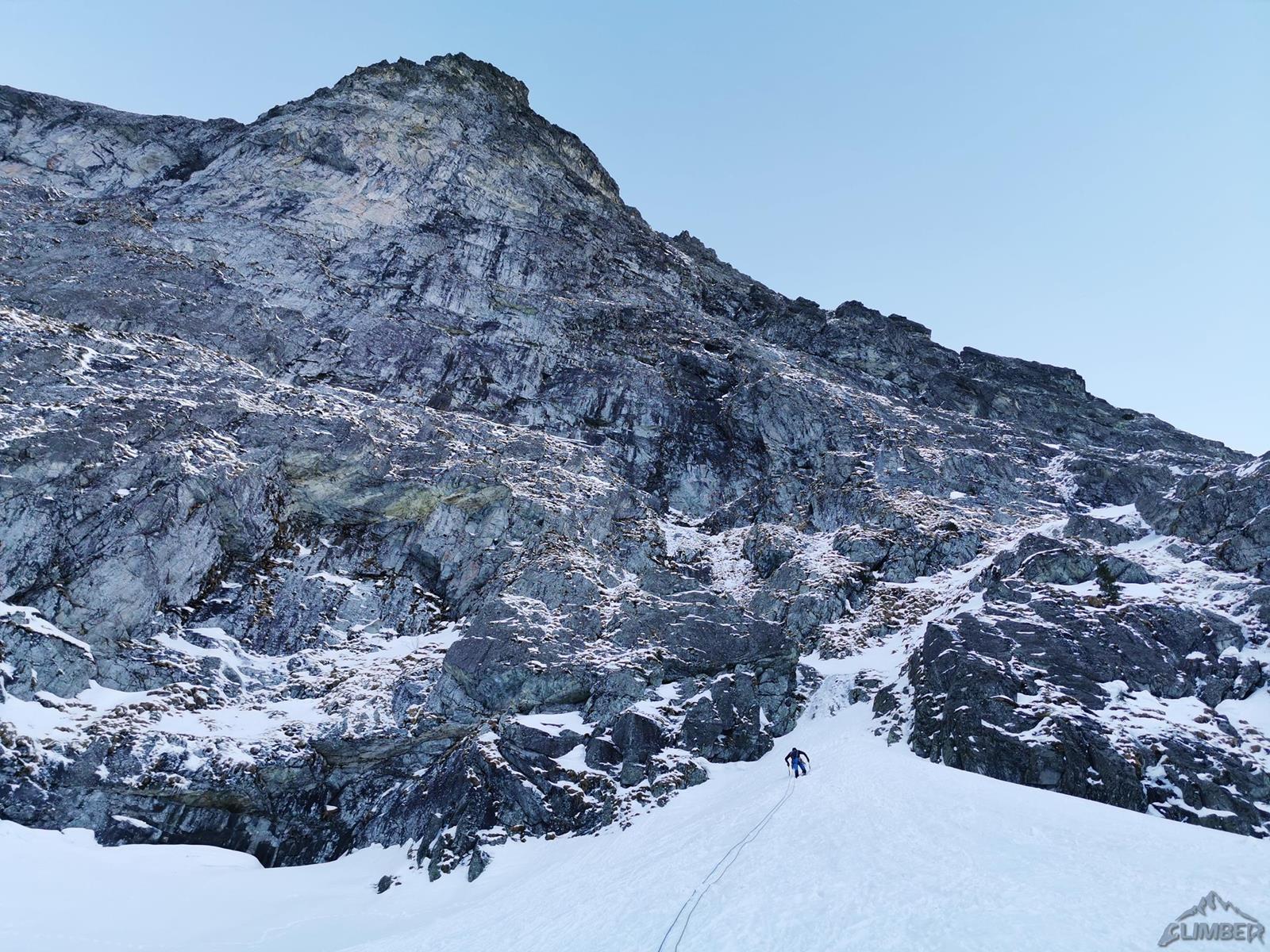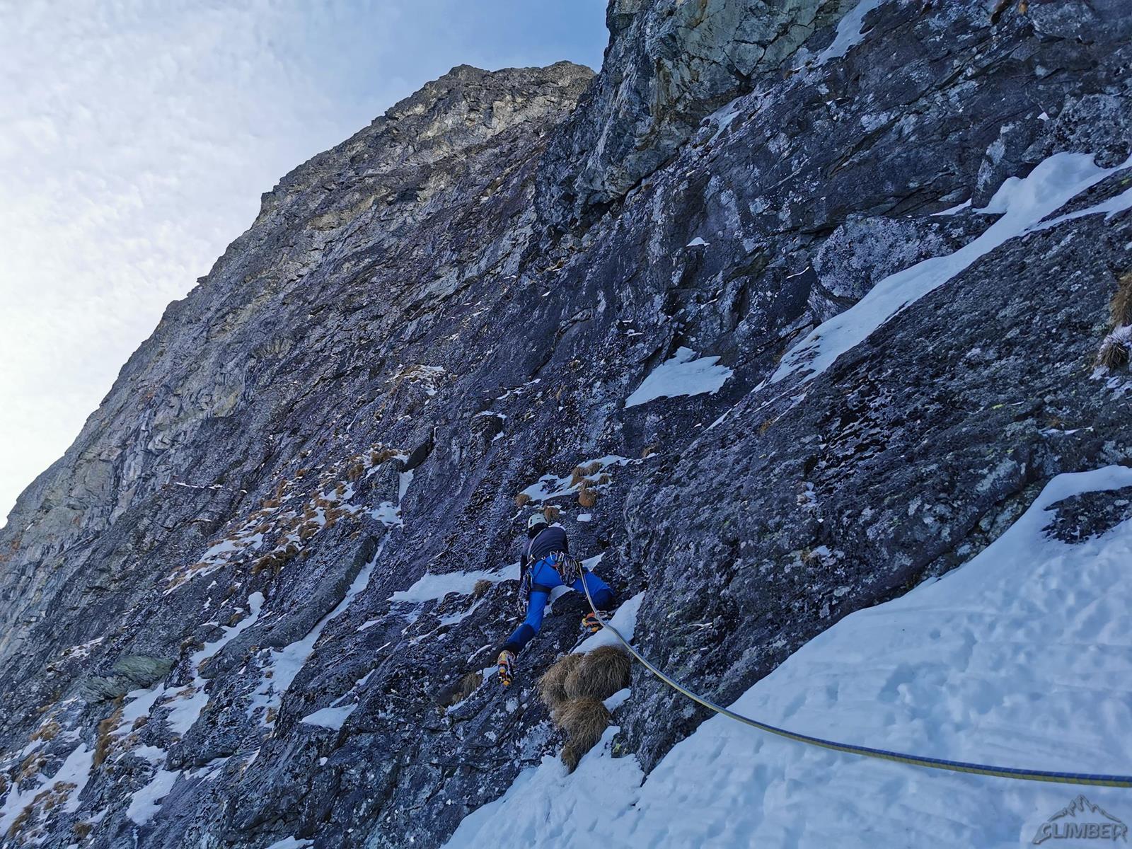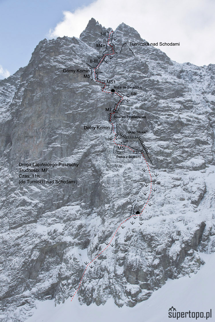 Wycena: M7-   Wycena uzupełniająca: M7-/M7   Asekuracja: R3   Długość [m]: 700   Wyciągi: 13   Czas [h]: 15   Wystawa: NE   Ocena: 8/10   Komentarz: 13 wyc. + lotna 200m