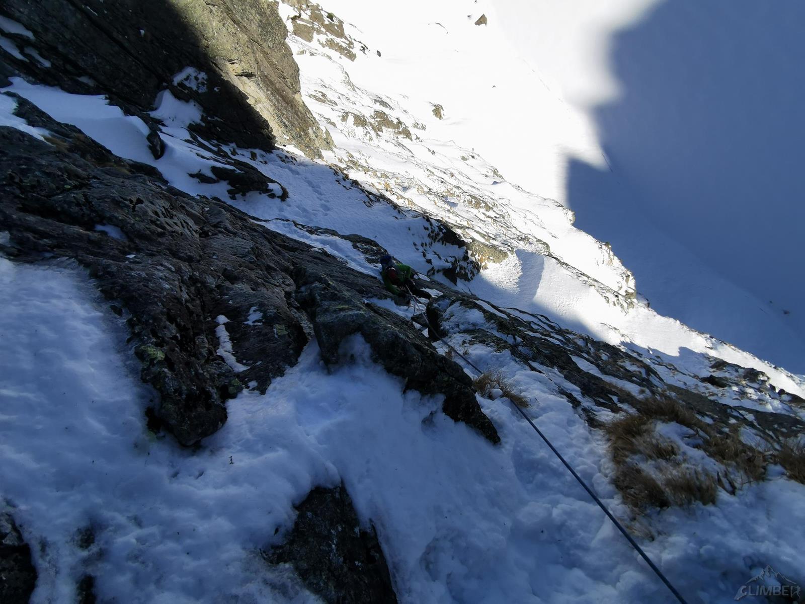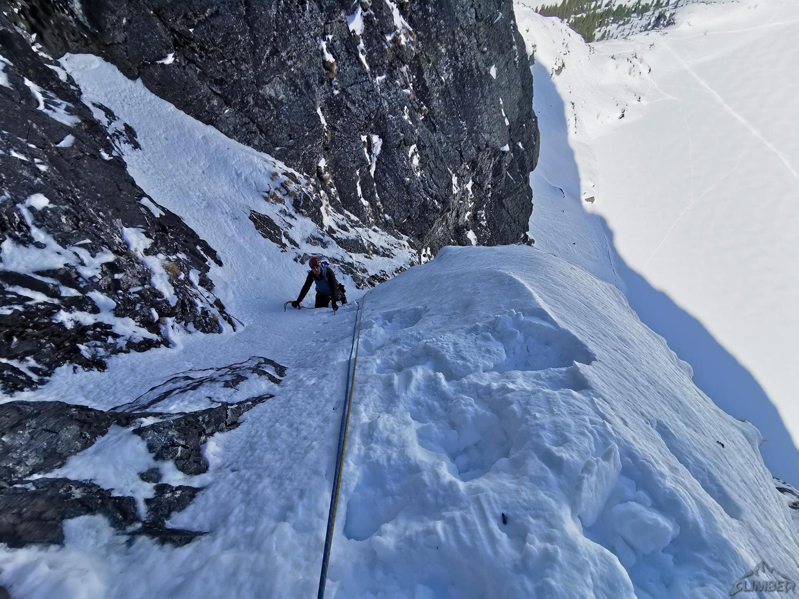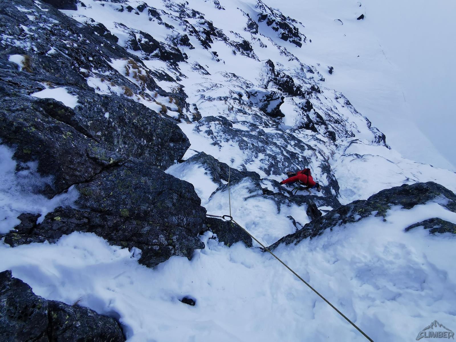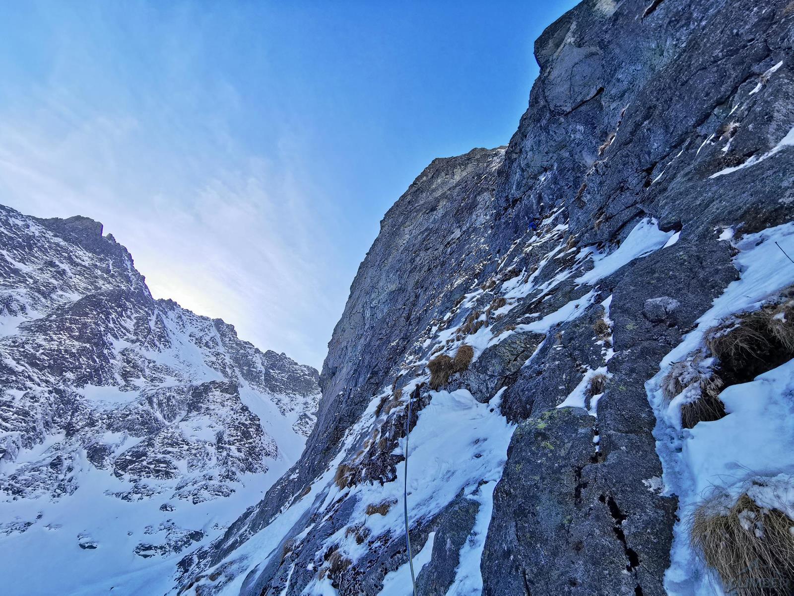Tutaj robimy krótką przerwę i obserwujemy zmagania Łukasza i Maksa – ten drugi ku swojej i naszej uciesze radzi sobie za pierwszym razem, a dzięki dobremu prowadzeniu lin udaje mu się nawet zrobić całość bez rozbijania na dwa wyciągi. Przy naszej trójce rozdzielanie żył nie wchodzi w grę, spróbujemy jednak również przejść całość w ciągu - nastawiając się na OS-a jest to z pewnością bardziej klasowe. Na pierwszych metrach wspinamy się spękanym filarkiem (ok. M6), po czym przewijamy się w niego w prawo i rozpoczynamy poziomy trawers z czujnym obniżeniem (crux), gdzie odwagi dodają liczne haki. Po dotarciu pod okapik (stan pośredni – kilka haków) stwierdzam, że skoro linę nadal da się ciągnąć, idę dalej. Kilka siłowych ruchów wyprowadza z przewieszenia w zacięcie (ok. M5+) – niestety po odbiciu do góry przesztywniam linę i będąc już w łatwiejszym terenie tracę równowagę i w okolicy robi się głośno 😊. Druga próba odbywa się już z niewygodnego stanowiska pośredniego, lina idzie za to dużo lepiej i po przejściu przewieszki oraz zacięcia robię kolejny trawers w prawo i wychodzę na śnieżny taras.