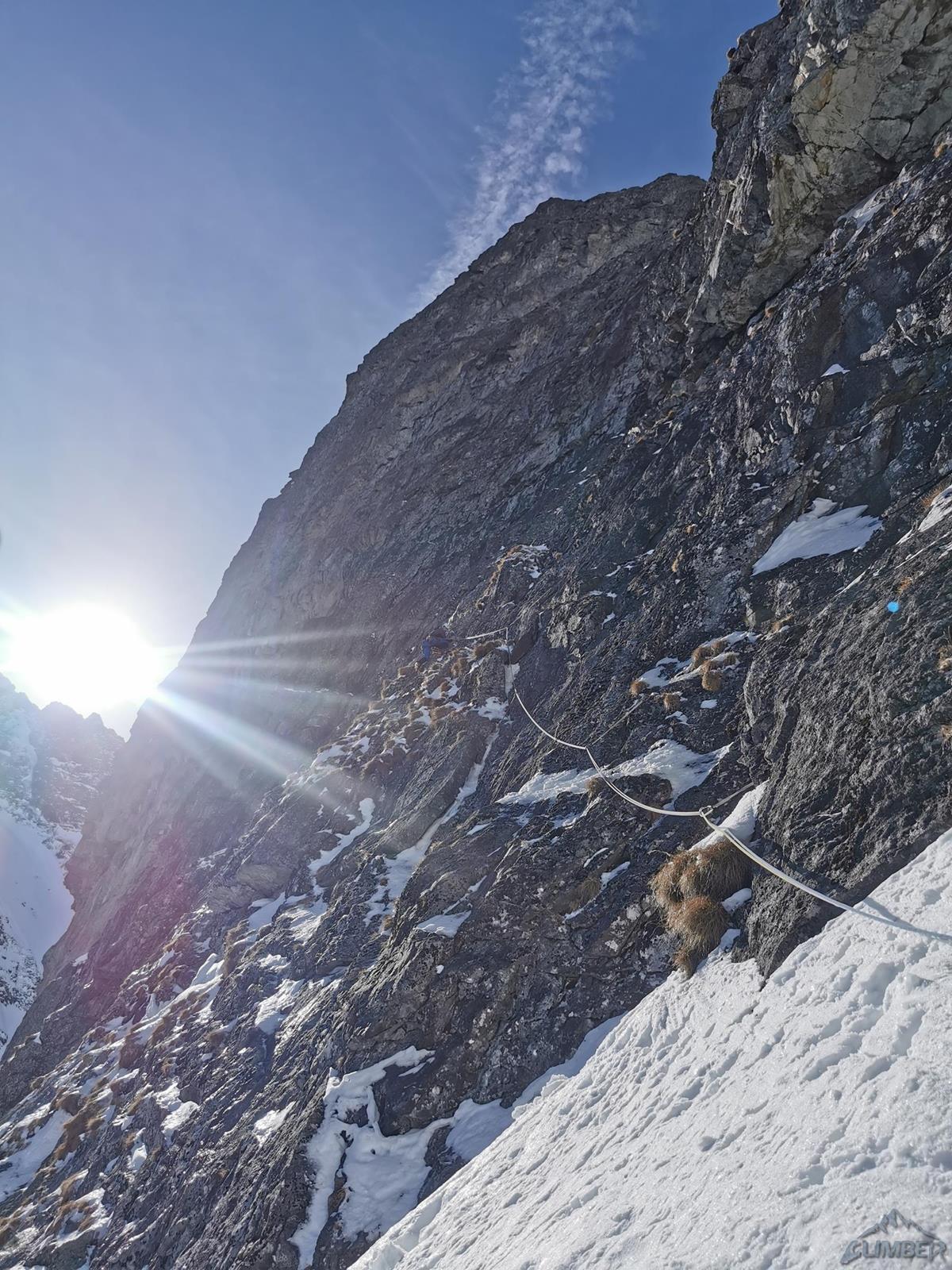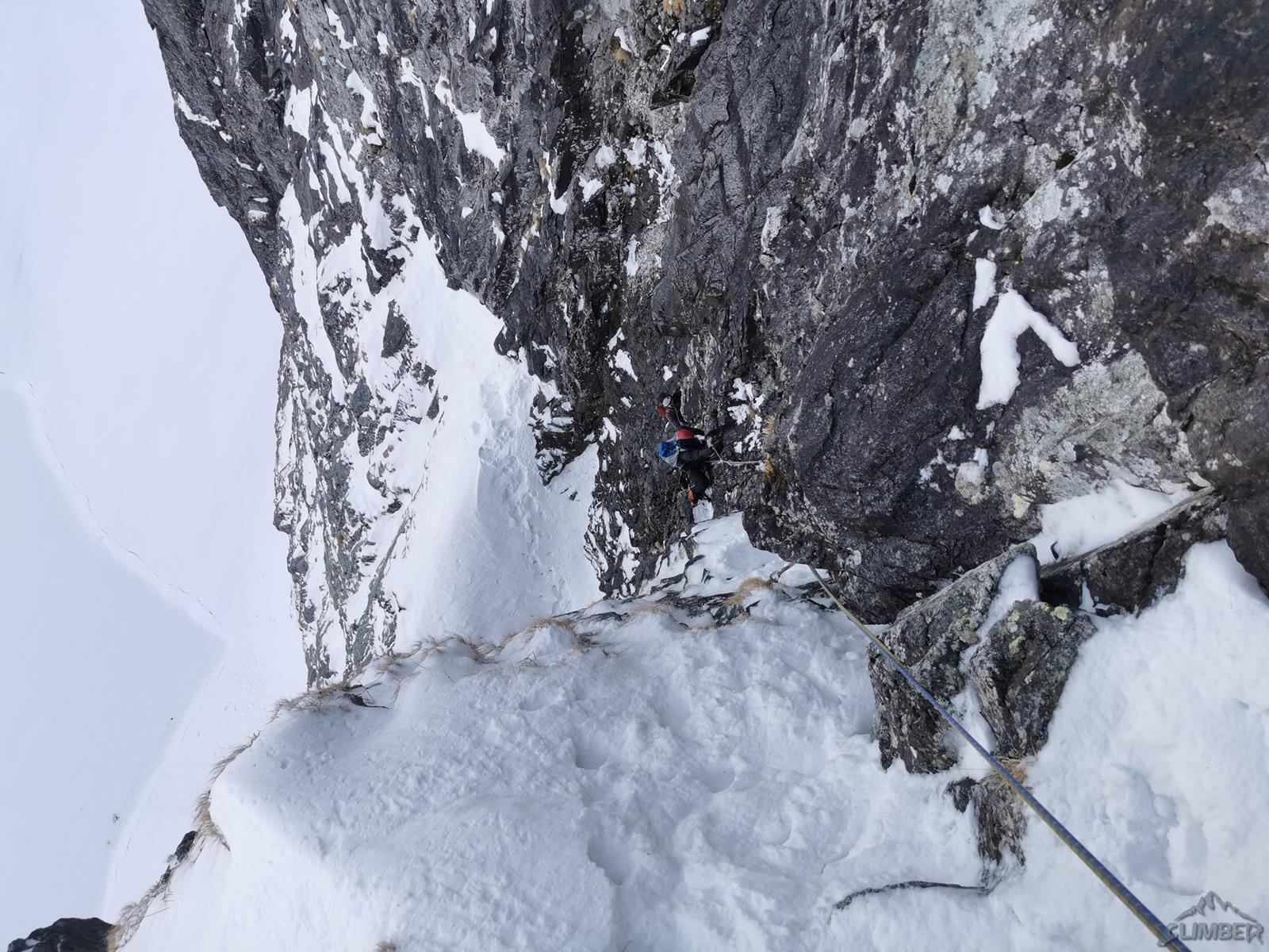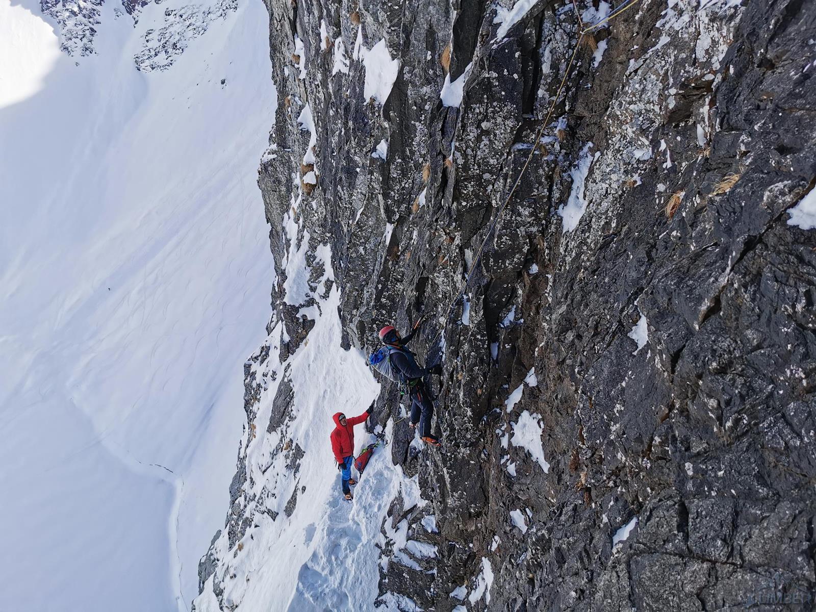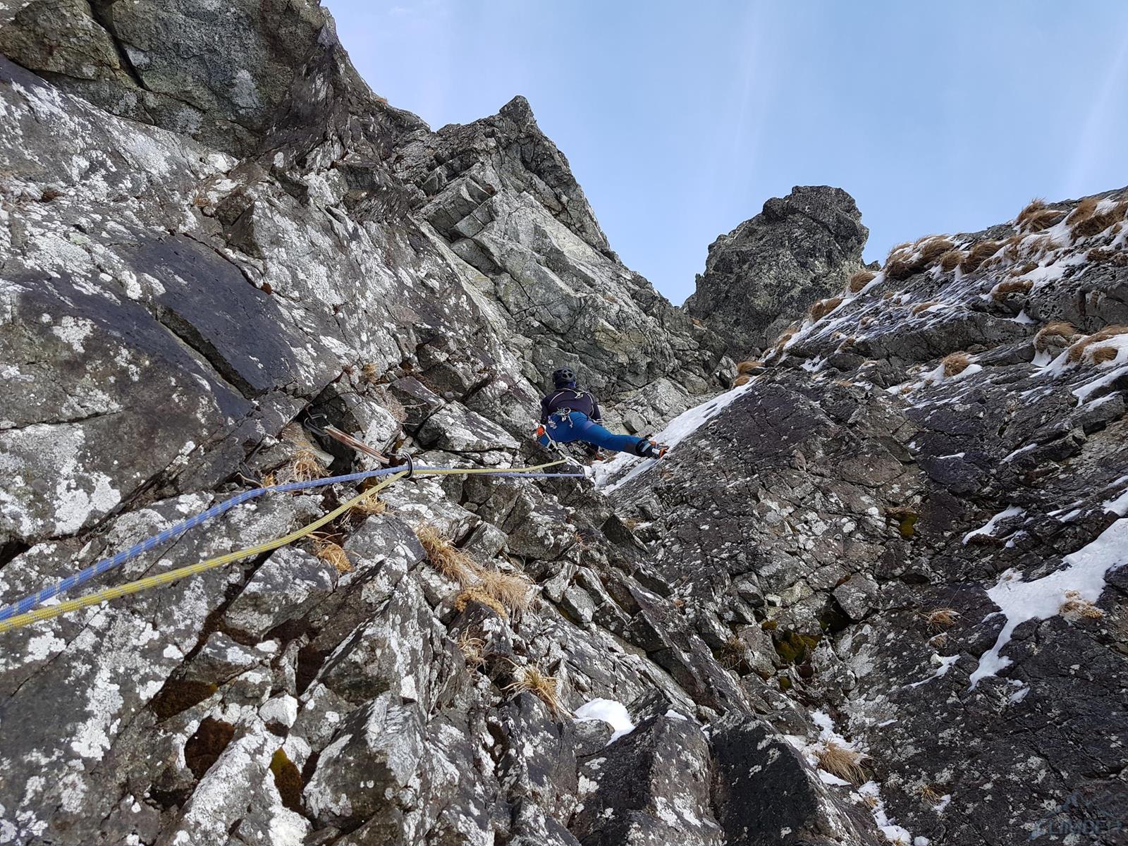 Tutaj robimy krótką przerwę i obserwujemy zmagania Łukasza i Maksa – ten drugi ku swojej i naszej uciesze radzi sobie za pierwszym razem, a dzięki dobremu prowadzeniu lin udaje mu się nawet zrobić całość bez rozbijania na dwa wyciągi. Przy naszej trójce rozdzielanie żył nie wchodzi w grę, spróbujemy jednak również przejść całość w ciągu - nastawiając się na OS-a jest to z pewnością bardziej klasowe. Na pierwszych metrach wspinamy się spękanym filarkiem (ok. M6), po czym przewijamy się w niego w prawo i rozpoczynamy poziomy trawers z czujnym obniżeniem (crux), gdzie odwagi dodają liczne haki. Po dotarciu pod okapik (stan pośredni – kilka haków) stwierdzam, że skoro linę nadal da się ciągnąć, idę dalej. Kilka siłowych ruchów wyprowadza z przewieszenia w zacięcie (ok. M5+) – niestety po odbiciu do góry przesztywniam linę i będąc już w łatwiejszym terenie tracę równowagę i w okolicy robi się głośno 😊. Druga próba odbywa się już z niewygodnego stanowiska pośredniego, lina idzie za to dużo lepiej i po przejściu przewieszki oraz zacięcia robię kolejny trawers w prawo i wychodzę na śnieżny taras.