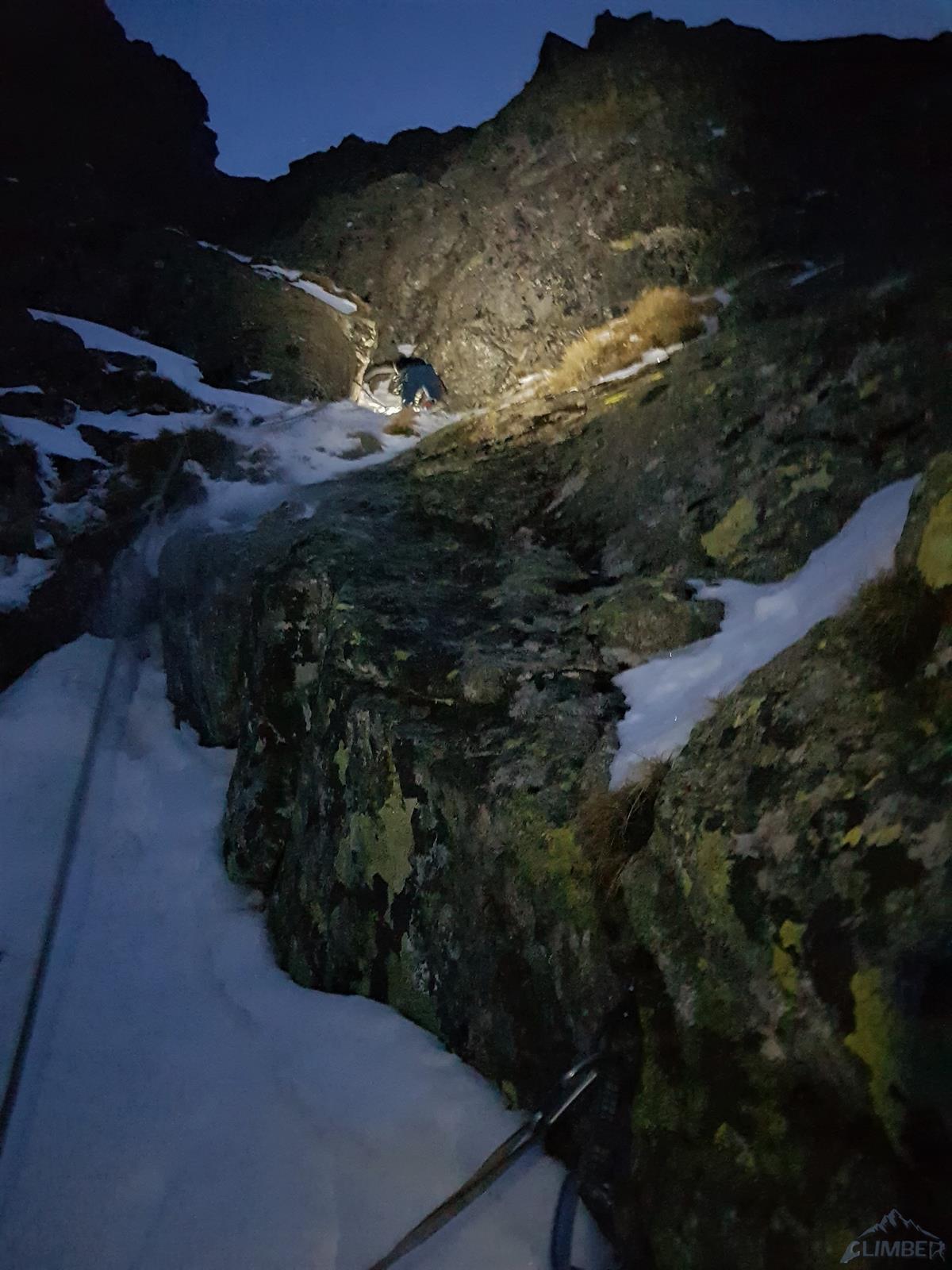 Górny Komin zgodnie z przewidywaniami zastaliśmy na szczęście częściowo wylany lodem – „schematowe” M5 jest co prawda niewinne, płytowy odcinek ze słabą asekuracją w złych warunkach dał jednak popalić niejednemu dobremu zespołowi. U nas czujny okazuje się tylko sam start (M4/WI4), wyżej czeka już bardzo dobry śniego-lód, w którym asekuracja nie jest potrzebna. Następna długość liny to już łatwy żleb, z którego docieramy do kociołka z rozejściem drogi na Siodełko w Filarze (w lewo, raczej na lato) i do Turniczki nad Schodami. Stąd pokonujemy jeszcze wyciąg depresją po prawej (ok. M4) i wychodzimy na taras pod Kominami Wyjściowymi. W tym miejscu możliwe jest wyjście ze ściany (idziemy skośnie w prawo, pokonujemy krótką ściankę za M3 i po dotarciu do stanowiska ze spitów zaczynamy długi trawers do Bańdziocha), my jednak postanawiamy trzymać się planu i kontynuować na szczyt – odpalamy czołówki i ruszam przodem. Na drodze dotąd zeszło nam około 12 godzin, dorzucimy do tego jeszcze prawie trzy.