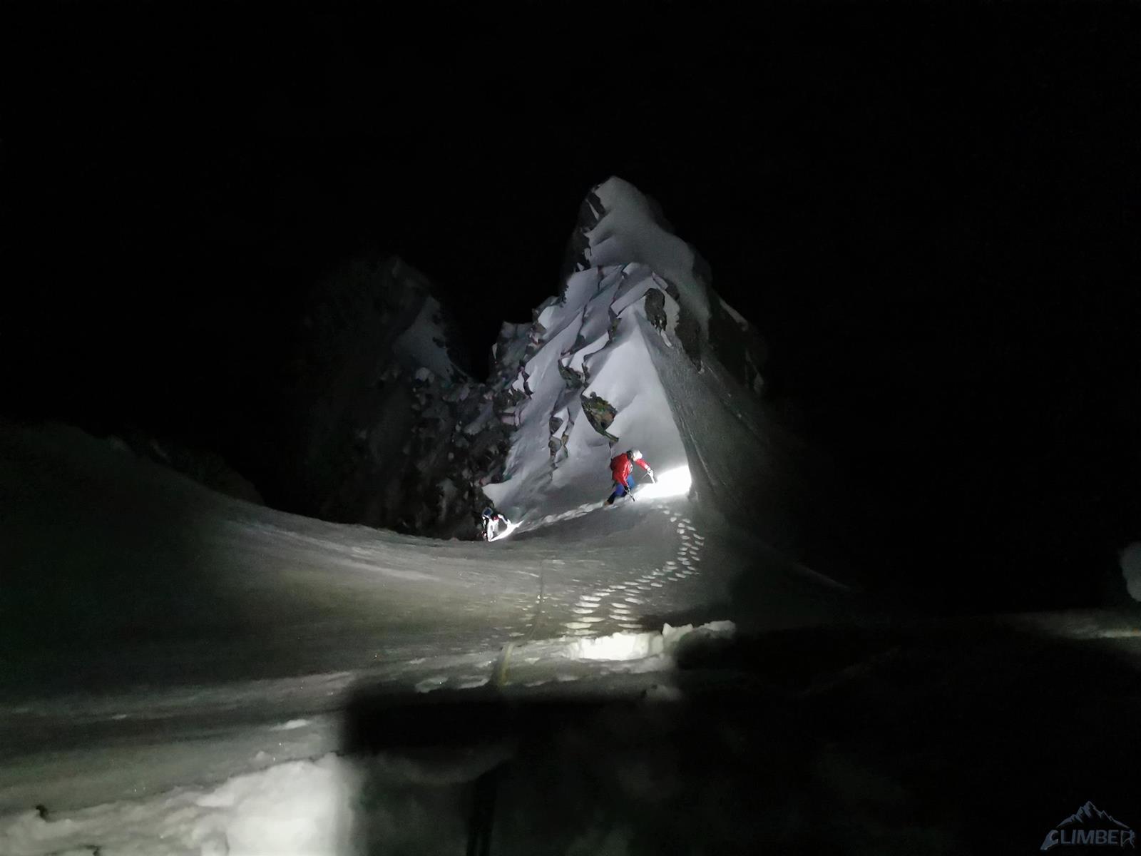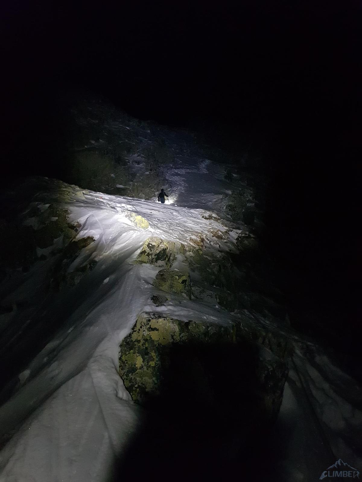 Po przejściu rynny z przewężeniem i płytkich traw powyżej (ok. M3/M4) docieramy pod ostatnią przeszkodę – próg w Kominie. Z dołu wygląda dość niewinnie ale przewinięcie na płytę jest mocno wypychające (ok M5+) i kosztowało mnie trochę nerwów. Jak się potem okazało zespół przed nami wrócił się z tego miejsca i przeszedł bezpośrednio kominem po lewej, który jednak też nie okazał się łatwy. Na szczęście wyżej teren już odpuszcza – ze stanowiska po trudnościach (własnego) idziemy już na lotnej, żlebem dostajemy się na grań, przechodzimy na drugą stronę i trawersujemy zbocza pod turniami w kierunku szczytu. Im wyżej tym śnieg jest coraz gorszy – cieszymy się, że również chłopakom chciało się iść do końca i założyli ślad. Po wyjściu na Kazalnicę ok. 21:00 nie robimy za długiej przerwy, czeka jeszcze zejście i dojazd do domu, a trzeba zdążyć do pracy na rano 😊.
