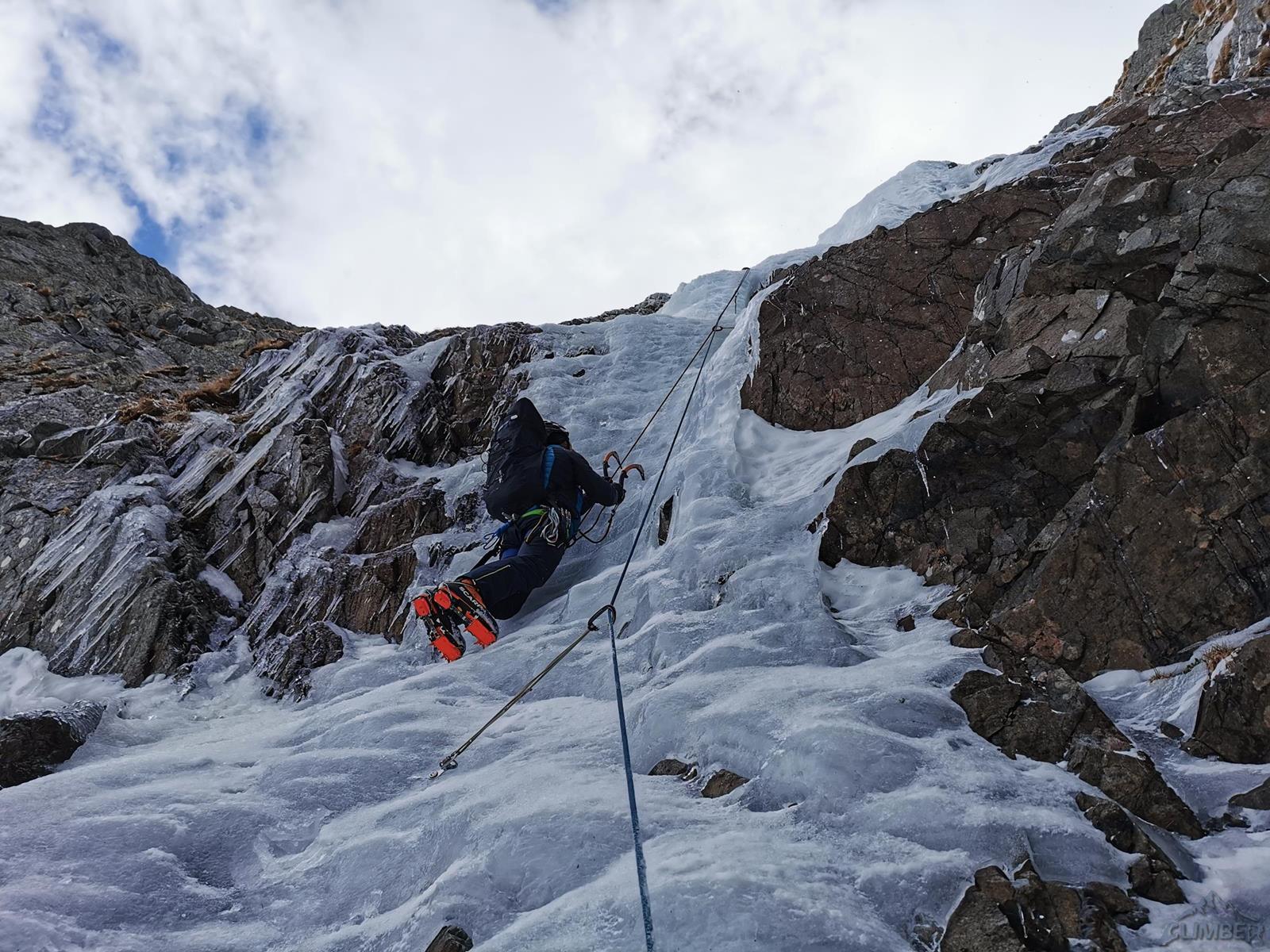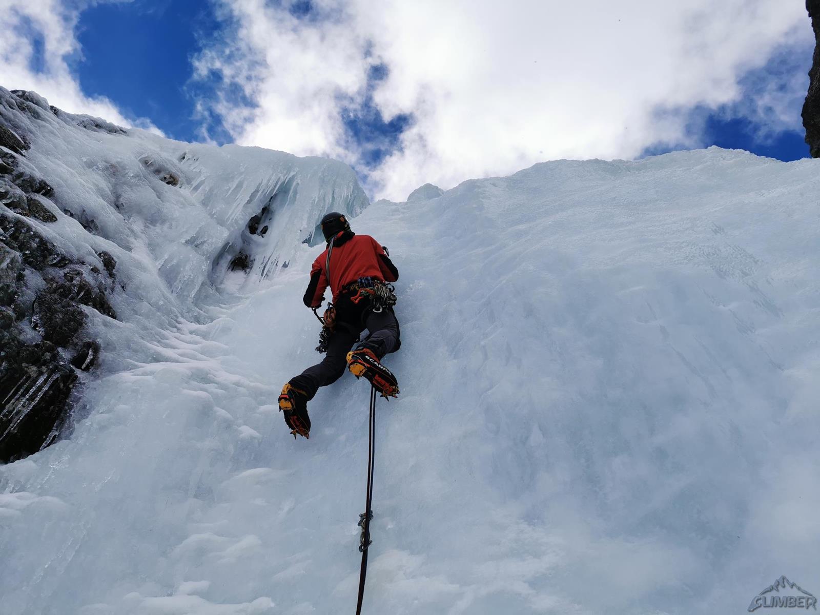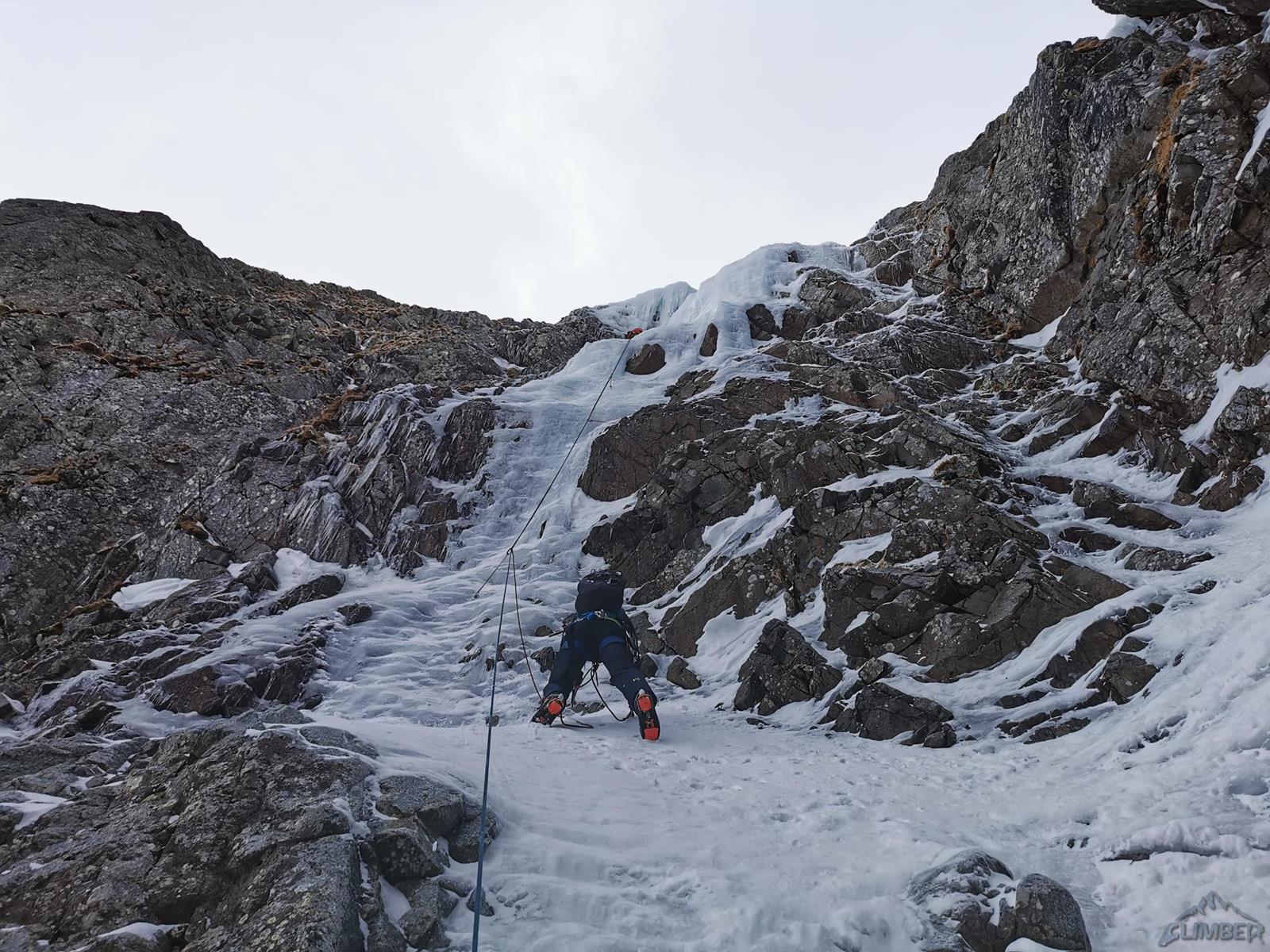 Za dolny odcinek drogi zabiera się Marcin - na pierwszych metrach bardziej stroma ścianka nie jest wystarczająco wylana, kolega rusza więc z prawej (ok. WI3) i przez czujną płytkę powyżej przewija się w lewo do ładnego już pasa stromego lodu (WI4). Po wyjściu na lodową półkę przed kolejnym spiętrzeniem robimy stanowisko ze śrub (wyszło ok. 50 metrów). Drugi wyciąg zaczyna się od pięknego stromego odcinka (WI4), po wyjściu z trudności pozostaje przejście po śniegu na pełną długość liny do lodowej ścianki – można by było zatrzymać się również przy skałach po lewej, pierwsze stanowisko z haków jest jednak kilkanaście metrów wyżej (przyda się do zjazdu).
