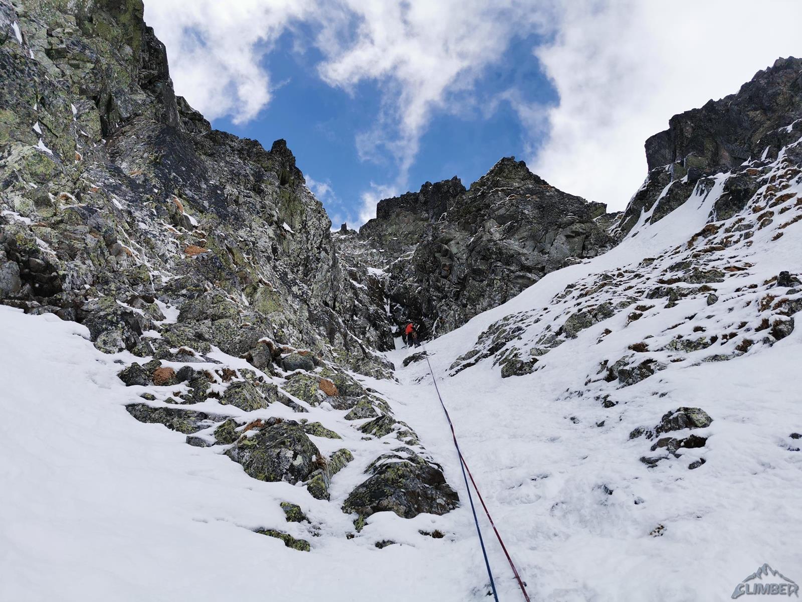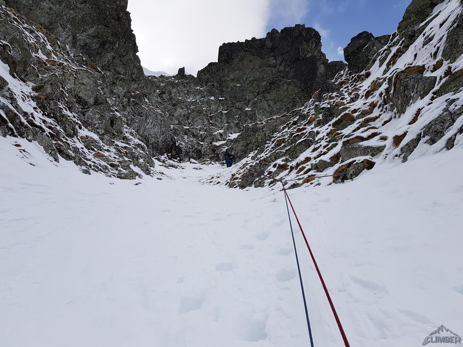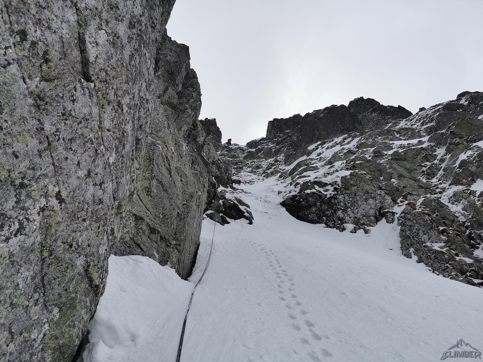 Kolejne 150 metrów pokonujemy na lotnej – idziemy łatwym żlebem, poprzetykanym bardziej stromymi i lekko wylodzonymi fragmentami, mijamy dwa kolejne stanowiska. Po dotarciu do skalnego progu zatrzymujemy się – gdyby był wylodzony nie przysporzyłby trudności (ok. WI3), przy słabym śniegu i braku sensownej asekuracji te kilka metrów kominka okazuje się całkiem sprężne (M4). Po przewinięciu śnieżnym żlebem docieramy do stanowiska pod pierwszym z dwóch kluczowych odcinków mikstowych.