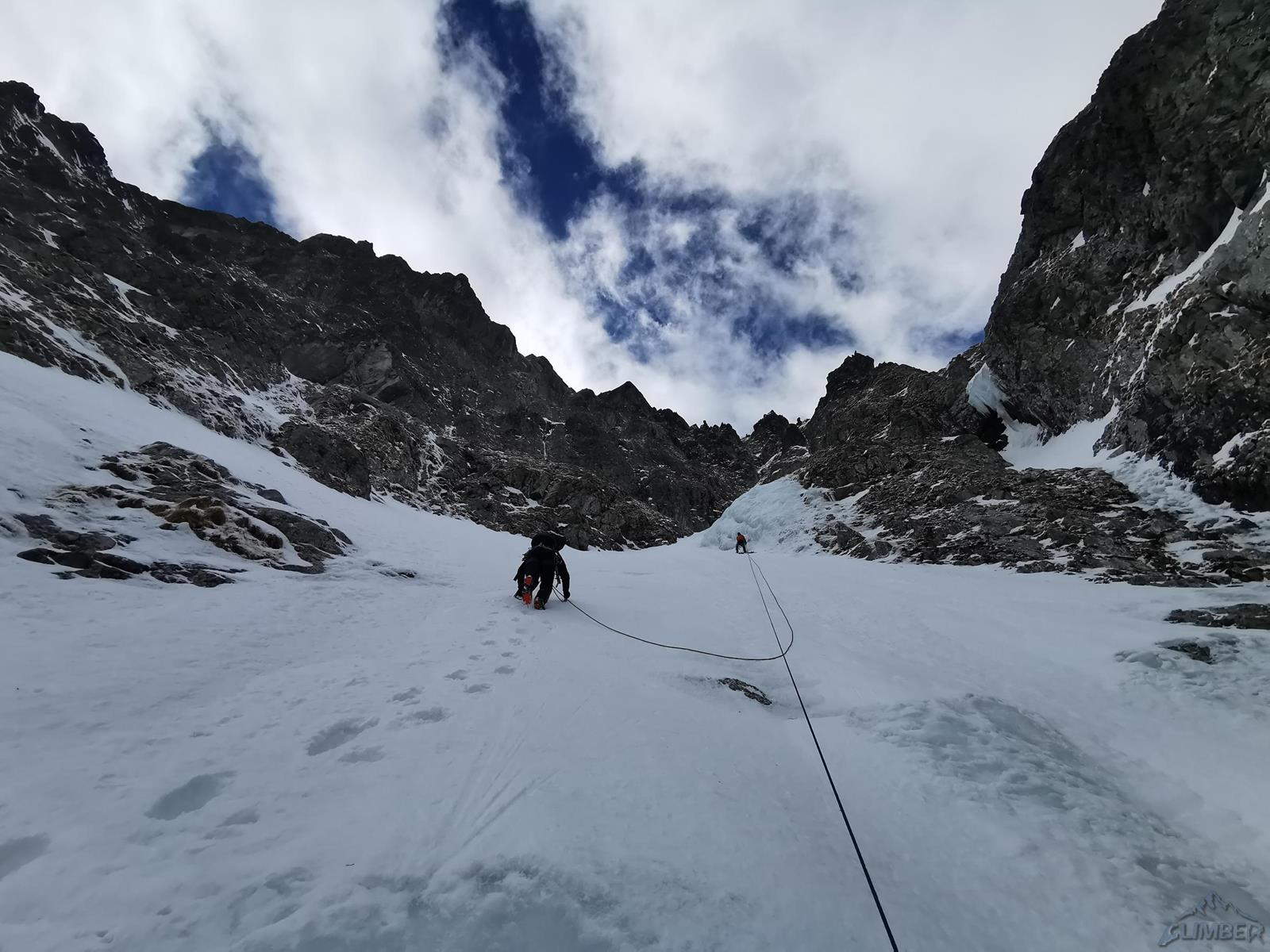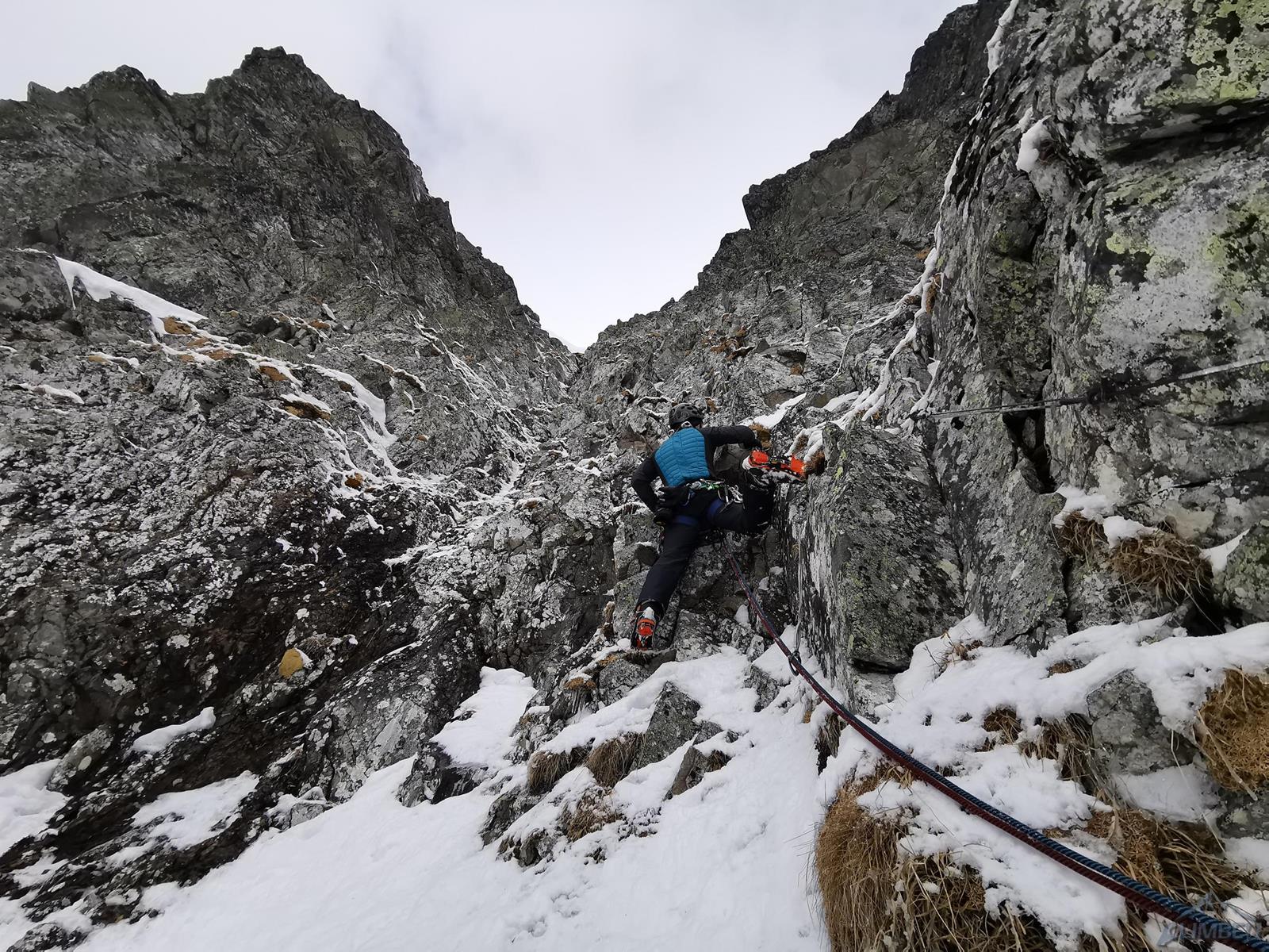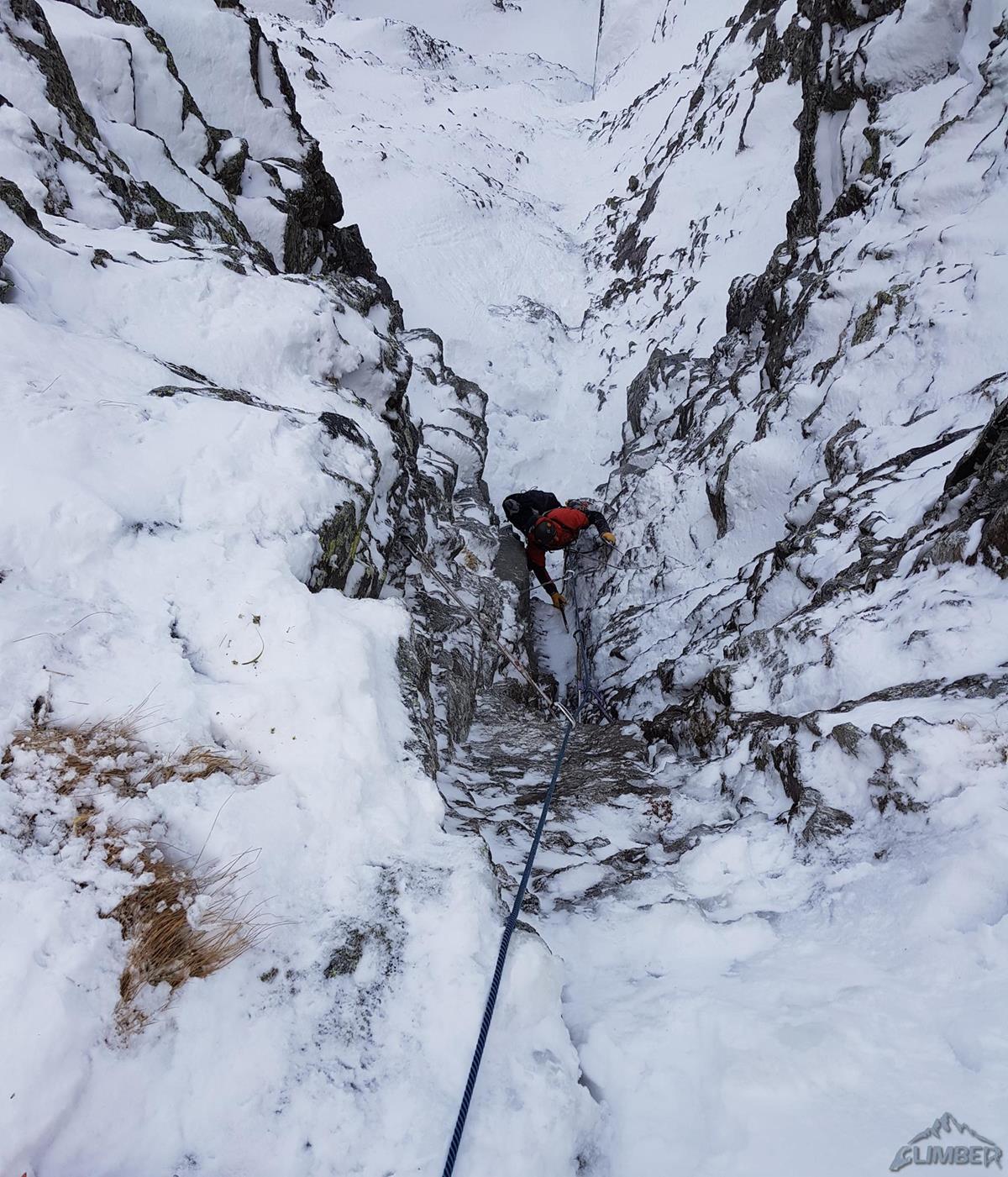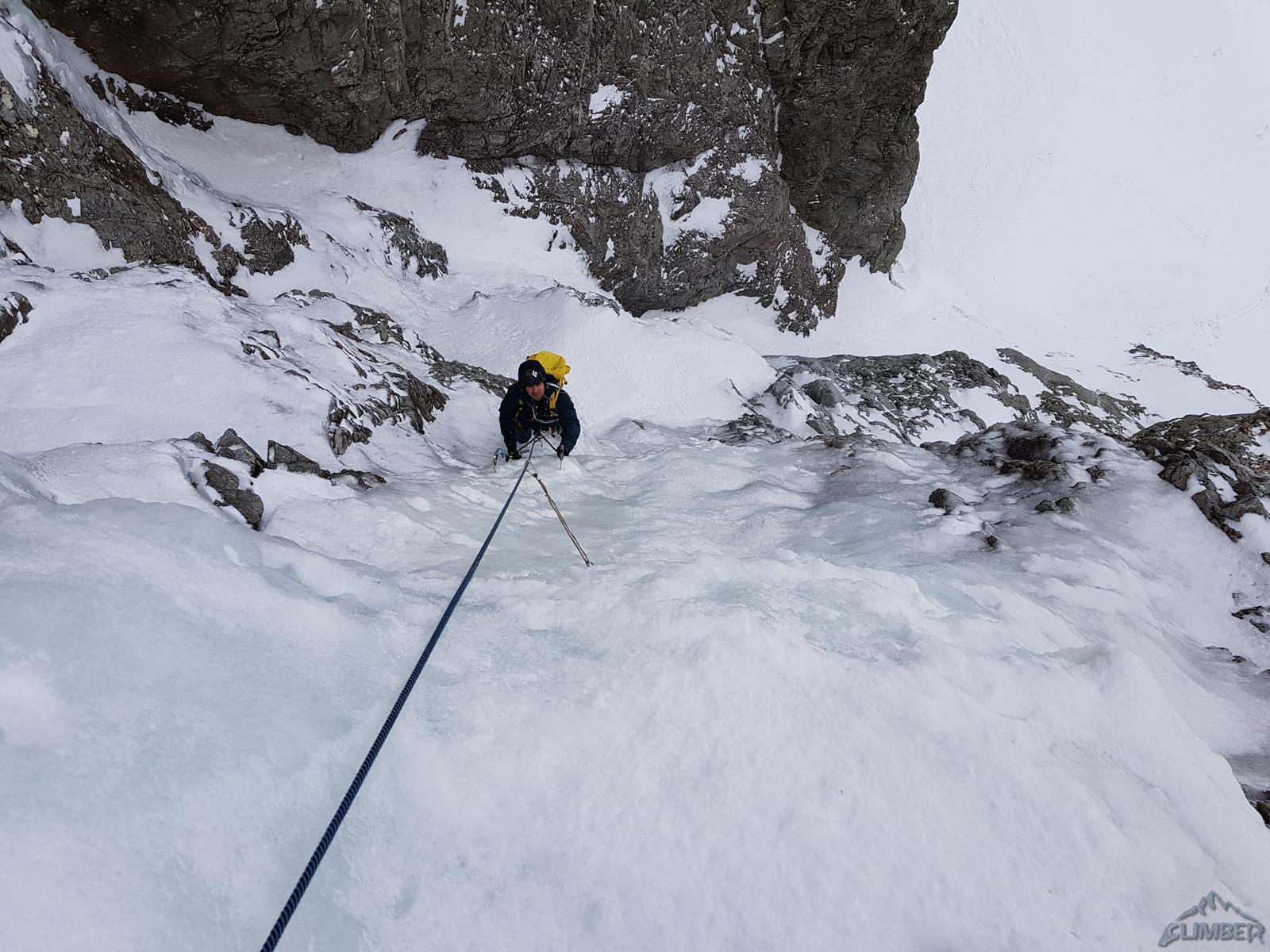 Kolejne 150 metrów pokonujemy na lotnej – idziemy łatwym żlebem, poprzetykanym bardziej stromymi i lekko wylodzonymi fragmentami, mijamy dwa kolejne stanowiska. Po dotarciu do skalnego progu zatrzymujemy się – gdyby był wylodzony nie przysporzyłby trudności (ok. WI3), przy słabym śniegu i braku sensownej asekuracji te kilka metrów kominka okazuje się całkiem sprężne (M4). Po przewinięciu śnieżnym żlebem docieramy do stanowiska pod pierwszym z dwóch kluczowych odcinków mikstowych.