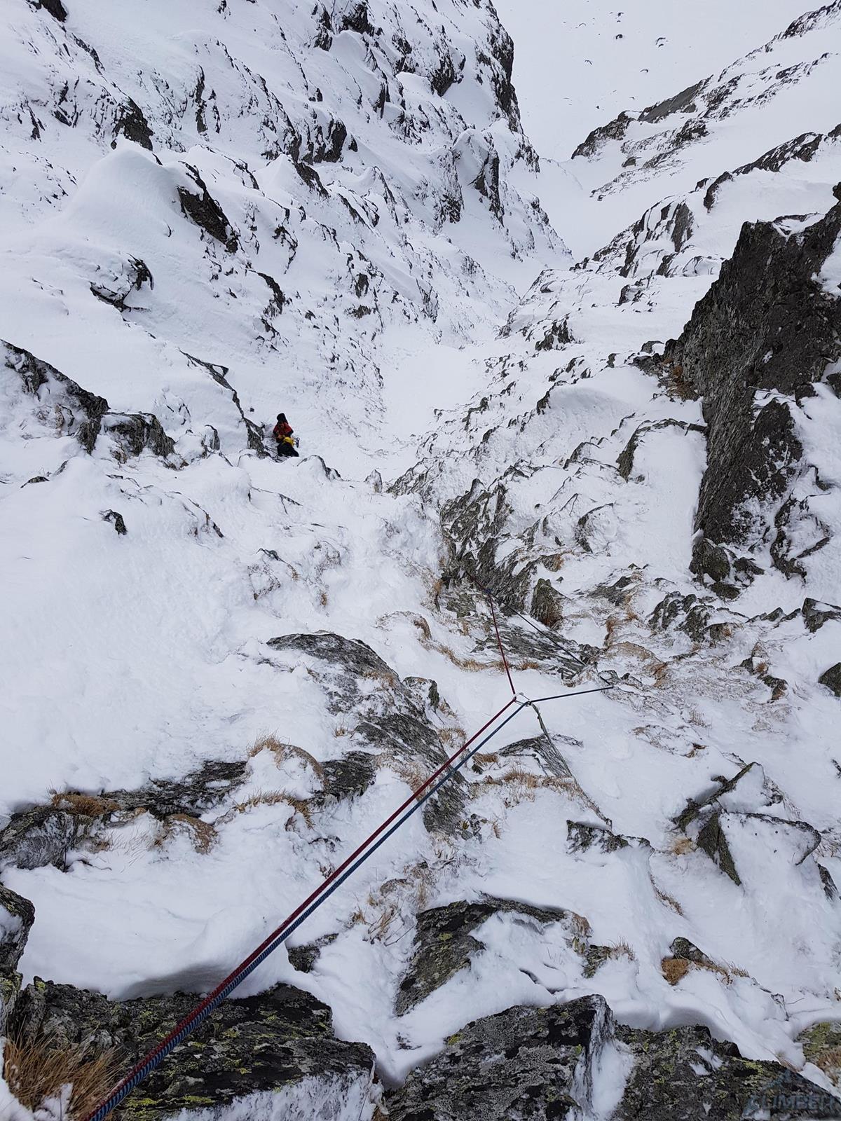 Do zmroku pozostaje godzina, biorąc więc pod uwagę warunki i zapowiadany opad rezygnujemy z włóczenia się po rozległym, nieznanym terenie (po stronie Rówienek) i wracamy w dół wzdłuż sprawdzonych po drodze stanowisk. Większość z nich jest ok (po dobiciu zastanych haków!), w kilku miejscach stosujemy jednak back-up’y. Problem robi się dopiero po dojechaniu do stanowiska przedostatniego – zlokalizowanego nad wyjściem z wariantu oryginalnego po prawej stronie (zaznaczone na topo). Hak wypada po lekkim stuknięciu, a stara kostka obok się rusza – mocujemy całość z powrotem ale nie wygląda to za dobrze. Skała wkoło okazuje się totalnie przegnita, próba wbicia własnego haka za każdym razem kończy się jej rozwarstwieniem. W końcu jadę z tego co jest, zaraz poniżej wkręcając jednak dwie śruby – stan finalnie wytrzymuje ale zdecydowanie lepszym pomysłem byłby zjazd z abałakowa w dobrym lodzie znajdującym się kilka metrów powyżej. Ostatni stan na półce w kominie po prawej (2 haki) jest już ok, do ziemi docieramy więc bez stresu.