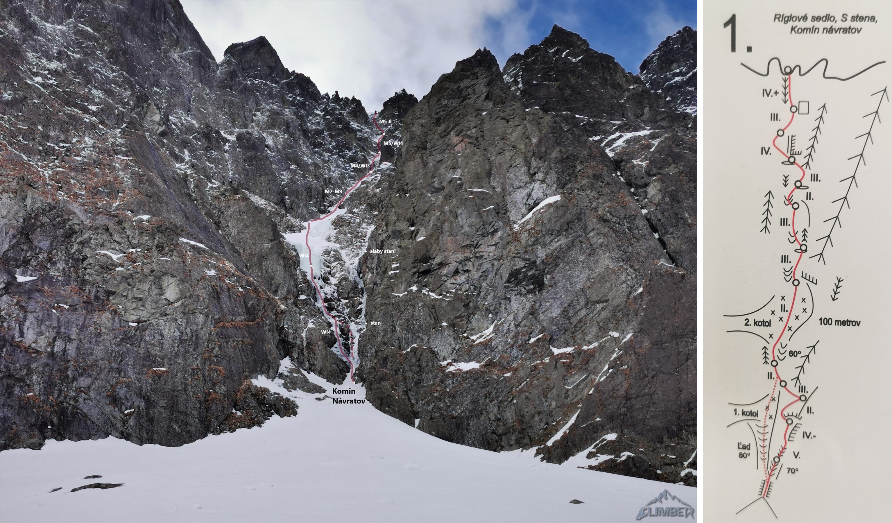 Wycena: M5   Wycena uzupełniająca: M5 WI4   Asekuracja: R3   Długość [m]: 400   Wyciągi: 6   Czas [h]: 6   Wystawa: N   Ocena: 7/10   Komentarz: