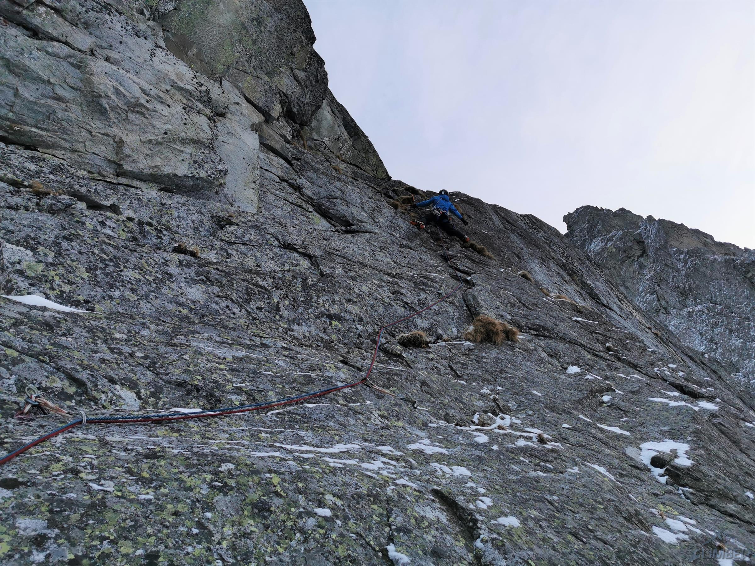 STYCZEŃ. Po powrocie trzeba ponownie wdziać raki i wrócić z Michałem w Tatry – warunki jednak kiepskie, pozostaje zadowolić się jedynie niezbyt ciekawym wariantem Filara Tivadara (ok. M5 OS) na Tępej i dwoma krótkim liniami na Ścianie pod Skokiem – mikstowym Svrcek-Styk (M5+ OS) i skalnym Covid-19 (M6+ RP). Pod koniec miesiąca mrozi, szukamy więc z Słońca i trafiamy w końcu na coś ładnego – drogę Mączki (M6 OS) na Wielkiej Wielickiej Strażnicy.