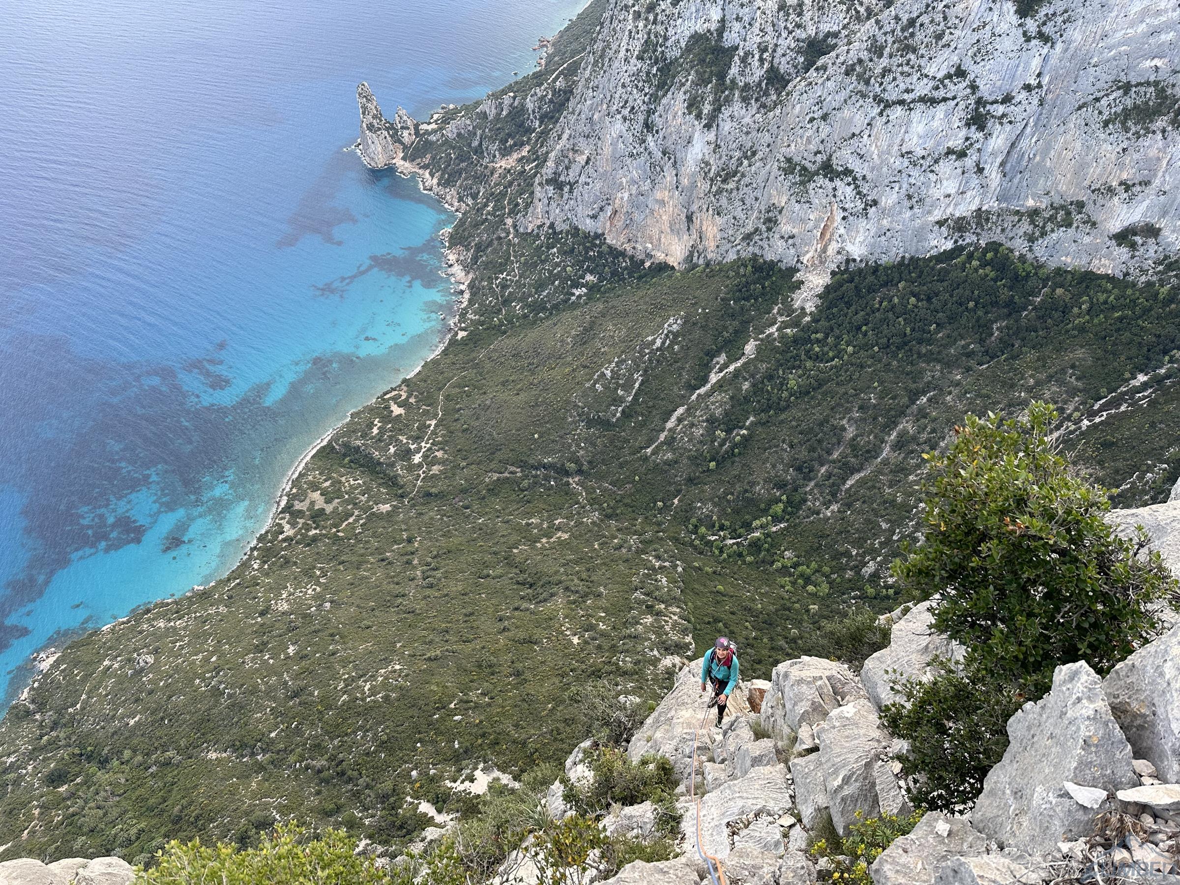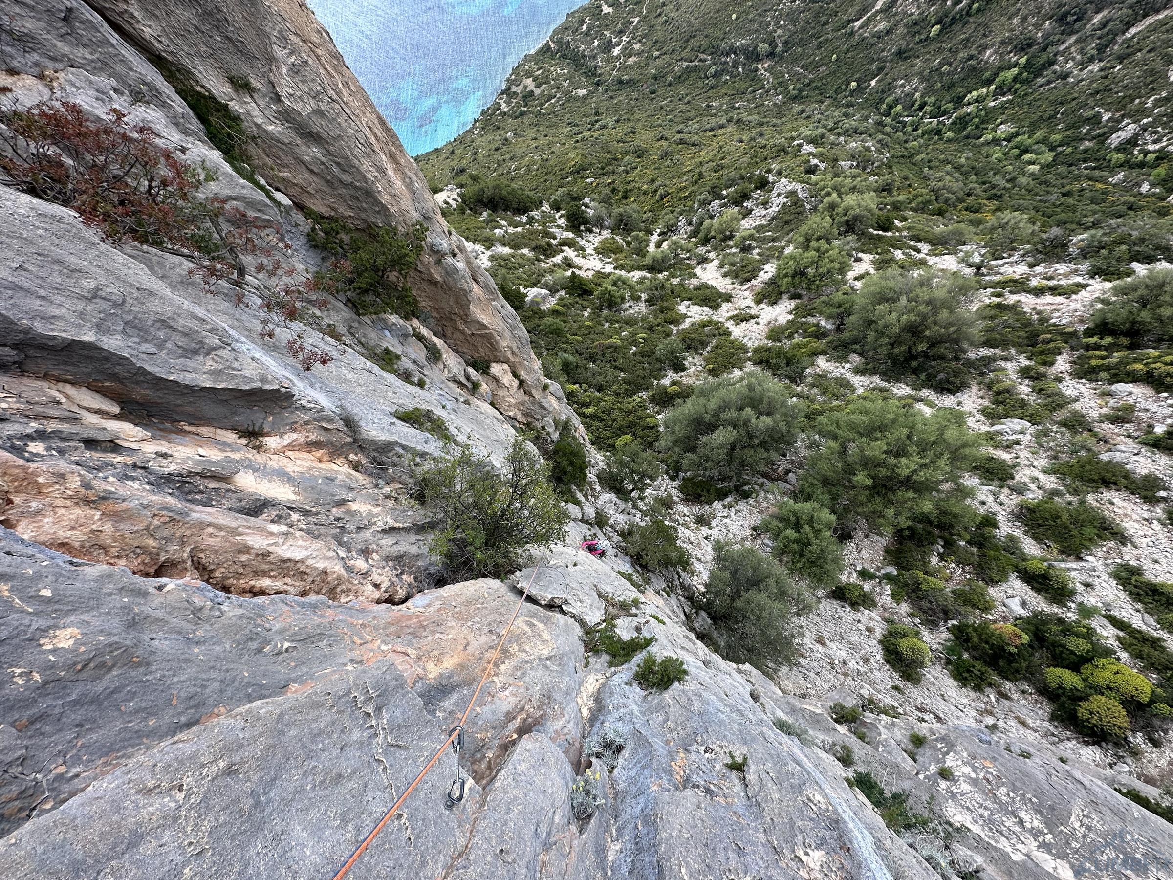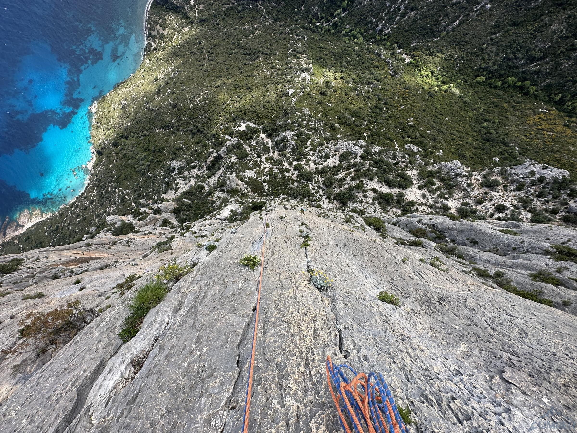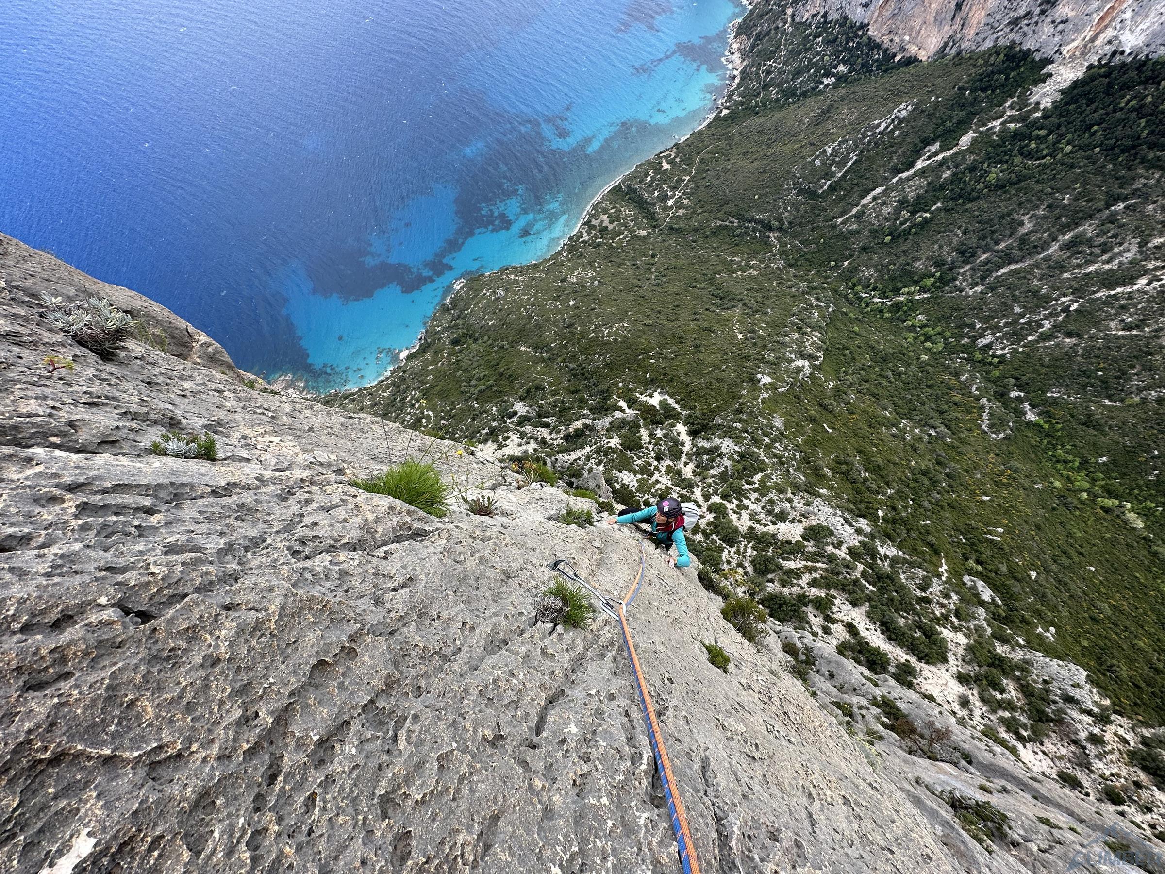 Pierwsza z nich okazuje się bardzo przyjemna – łatwa płytka i krótki trudniejszy fragment w prawo. Wyciąg 11-ty zaczyna się kolejną piękną podziurawioną płytą, która jednak stopniowo staje dęba i kończy się całkiem niebanalnie 😉. Ostatni odcinek z trudnościami to niewinnie wyglądający filarek, gdzie czeka jednak dość kąśliwa przewieszka, z wybrakowanym dla smaczku spitem. Po wyjściu na taras przechodzę od razu wieńczący drogę łatwy wyciąg (trójkowy) – do ostatniego stanowiska wychodzi ok. 50 metrów. Po wpisaniu się do pamiątkowej książki zmieniamy buty, pakujemy się i podchodzimy kilkadziesiąt metrów na szczyt Punta Giradili. Ania podziwia widoki, a ja lustruję widoczne stąd inne piękne ściany (m.in. Punta Argennas czy Monte Ginnircu) wypatrując kolejnych celów 😊. Po godzinnym spacerze jesteśmy z powrotem przy samochodzie i jedziemy na zasłużoną pizzę oraz cieszymy się wizją jutrzejszego plażowania – bark mimo kilku cięższych chwil wytrzymał, palce u stóp i rąk są jednak mocno skatowane. Dla TAKIEJ drogi warto jednak było pocierpieć, zdecydowanie była jedną z najlepszych i najbardziej intensywnych oraz efektownych dróg wielowyciągowych jakie mieliśmy okazję robić.