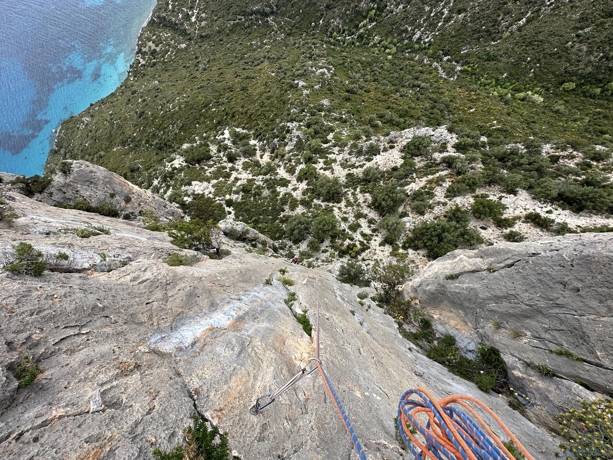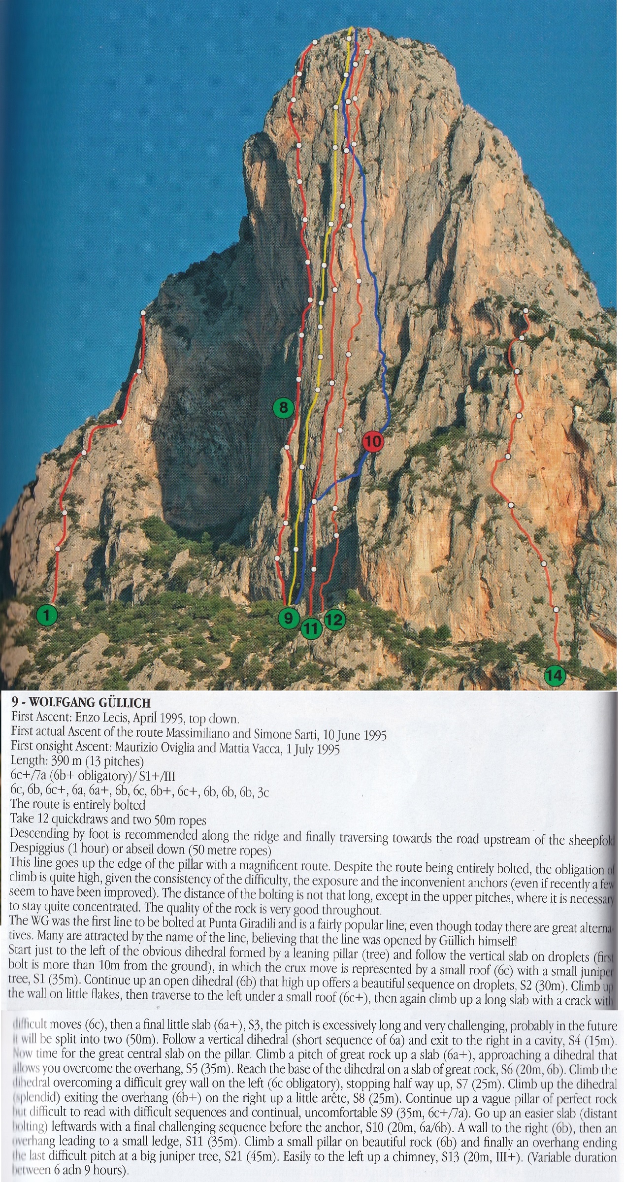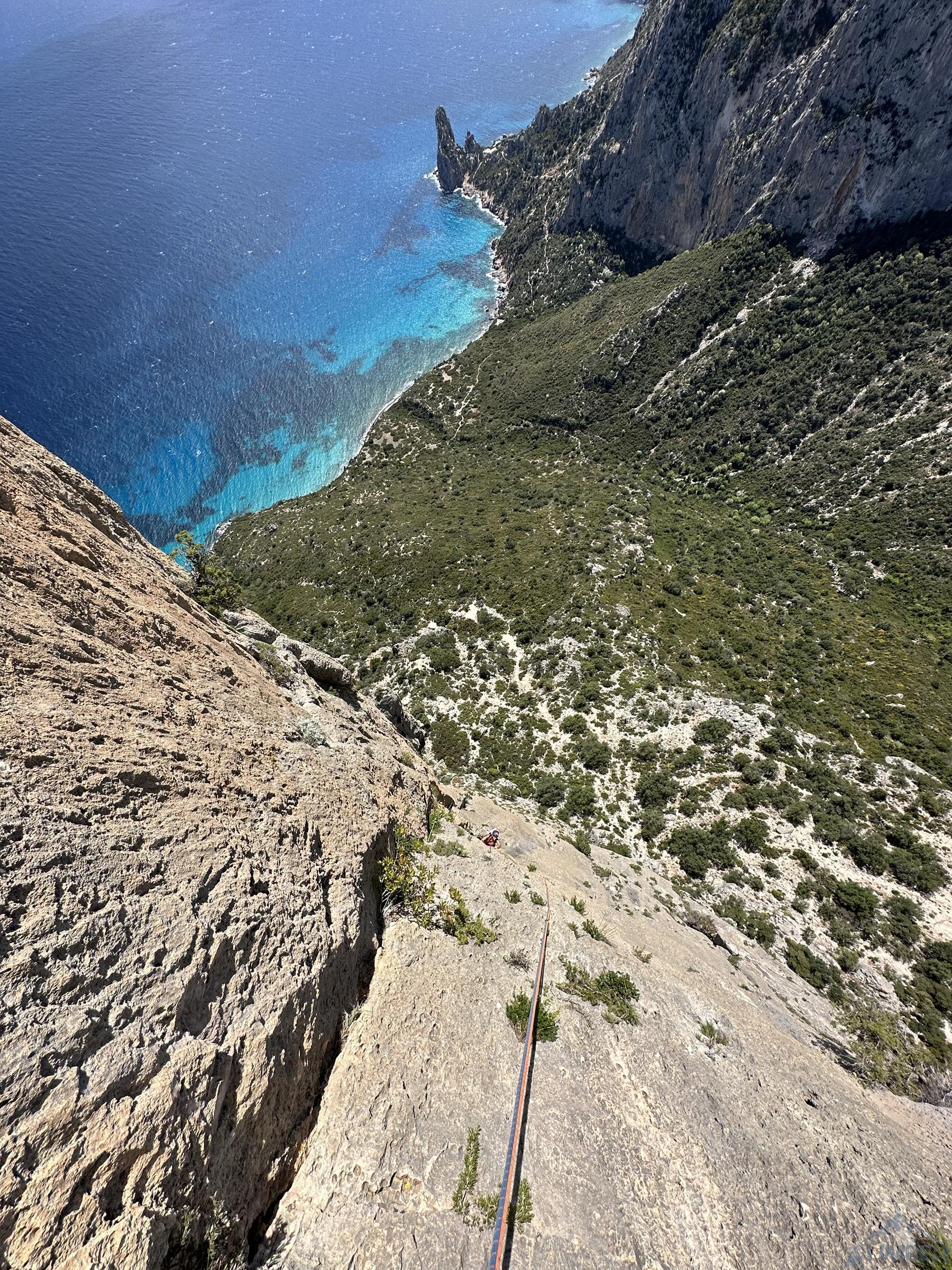 Pierwsza z nich okazuje się bardzo przyjemna – łatwa płytka i krótki trudniejszy fragment w prawo. Wyciąg 11-ty zaczyna się kolejną piękną podziurawioną płytą, która jednak stopniowo staje dęba i kończy się całkiem niebanalnie 😉. Ostatni odcinek z trudnościami to niewinnie wyglądający filarek, gdzie czeka jednak dość kąśliwa przewieszka, z wybrakowanym dla smaczku spitem. Po wyjściu na taras przechodzę od razu wieńczący drogę łatwy wyciąg (trójkowy) – do ostatniego stanowiska wychodzi ok. 50 metrów. Po wpisaniu się do pamiątkowej książki zmieniamy buty, pakujemy się i podchodzimy kilkadziesiąt metrów na szczyt Punta Giradili. Ania podziwia widoki, a ja lustruję widoczne stąd inne piękne ściany (m.in. Punta Argennas czy Monte Ginnircu) wypatrując kolejnych celów 😊. Po godzinnym spacerze jesteśmy z powrotem przy samochodzie i jedziemy na zasłużoną pizzę oraz cieszymy się wizją jutrzejszego plażowania – bark mimo kilku cięższych chwil wytrzymał, palce u stóp i rąk są jednak mocno skatowane. Dla TAKIEJ drogi warto jednak było pocierpieć, zdecydowanie była jedną z najlepszych i najbardziej intensywnych oraz efektownych dróg wielowyciągowych jakie mieliśmy okazję robić.
