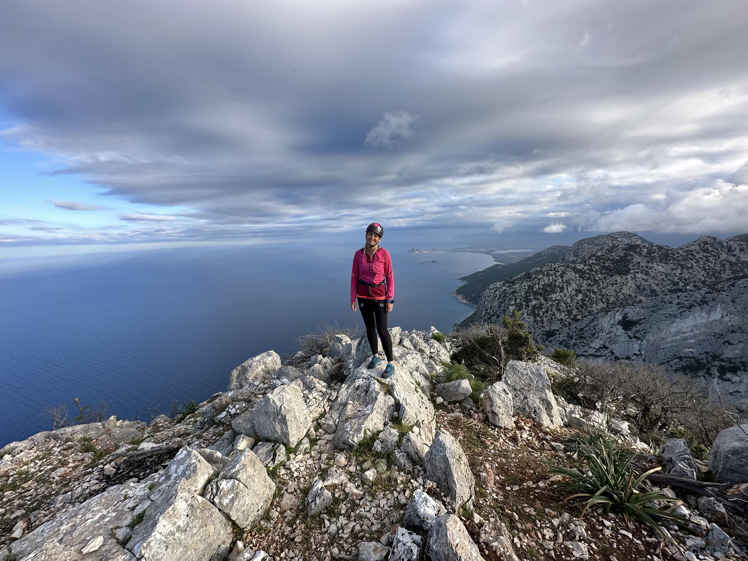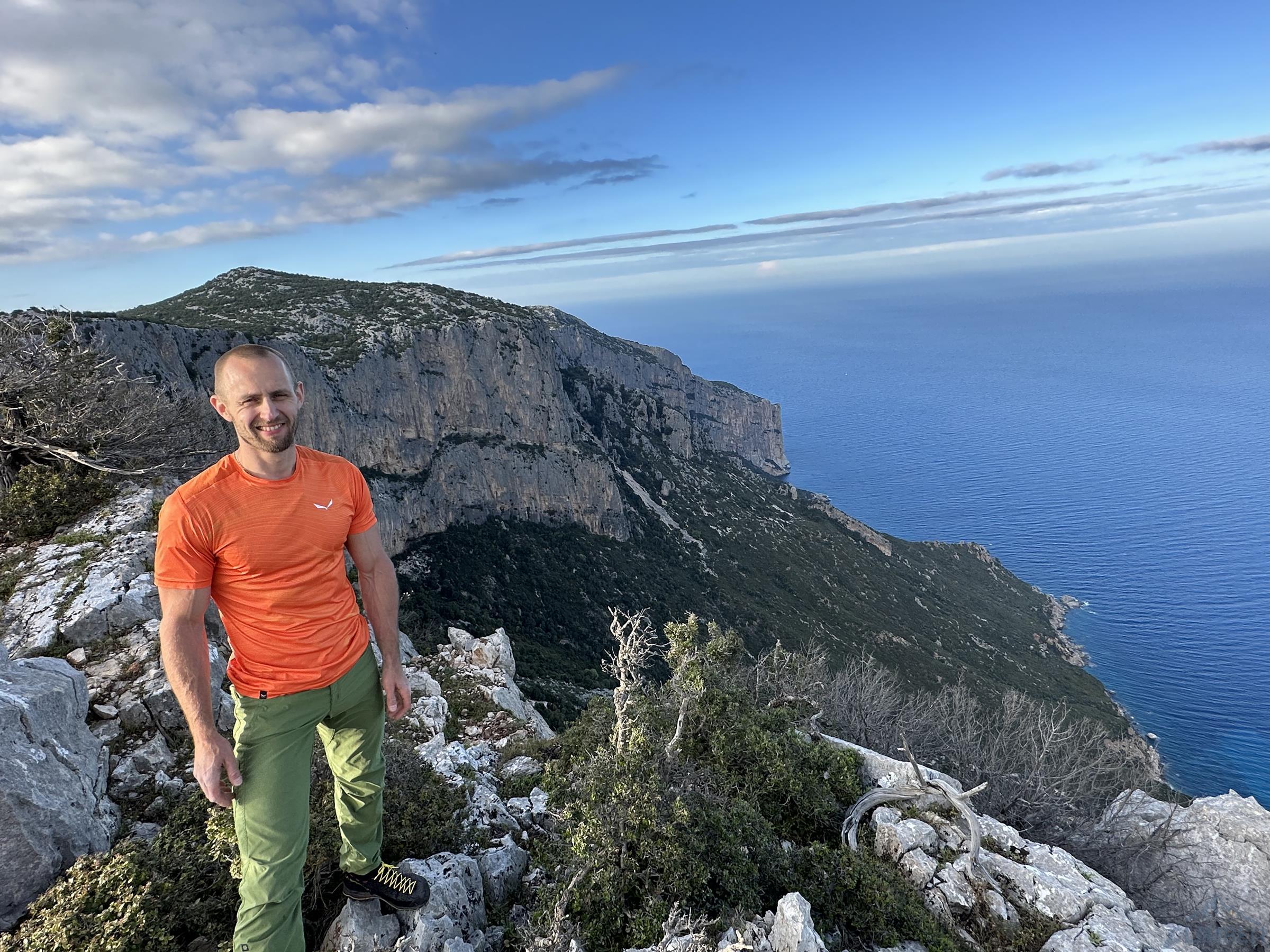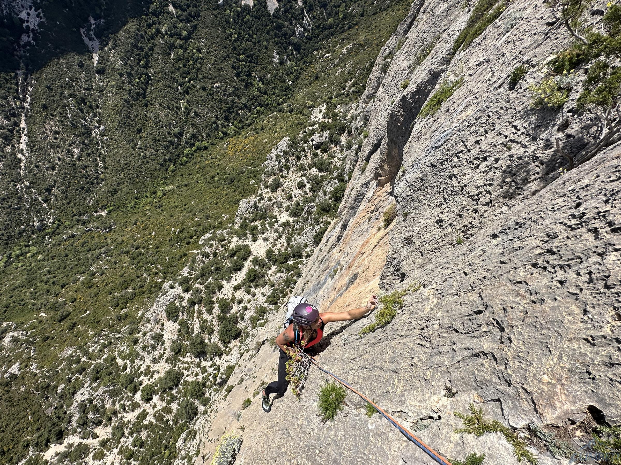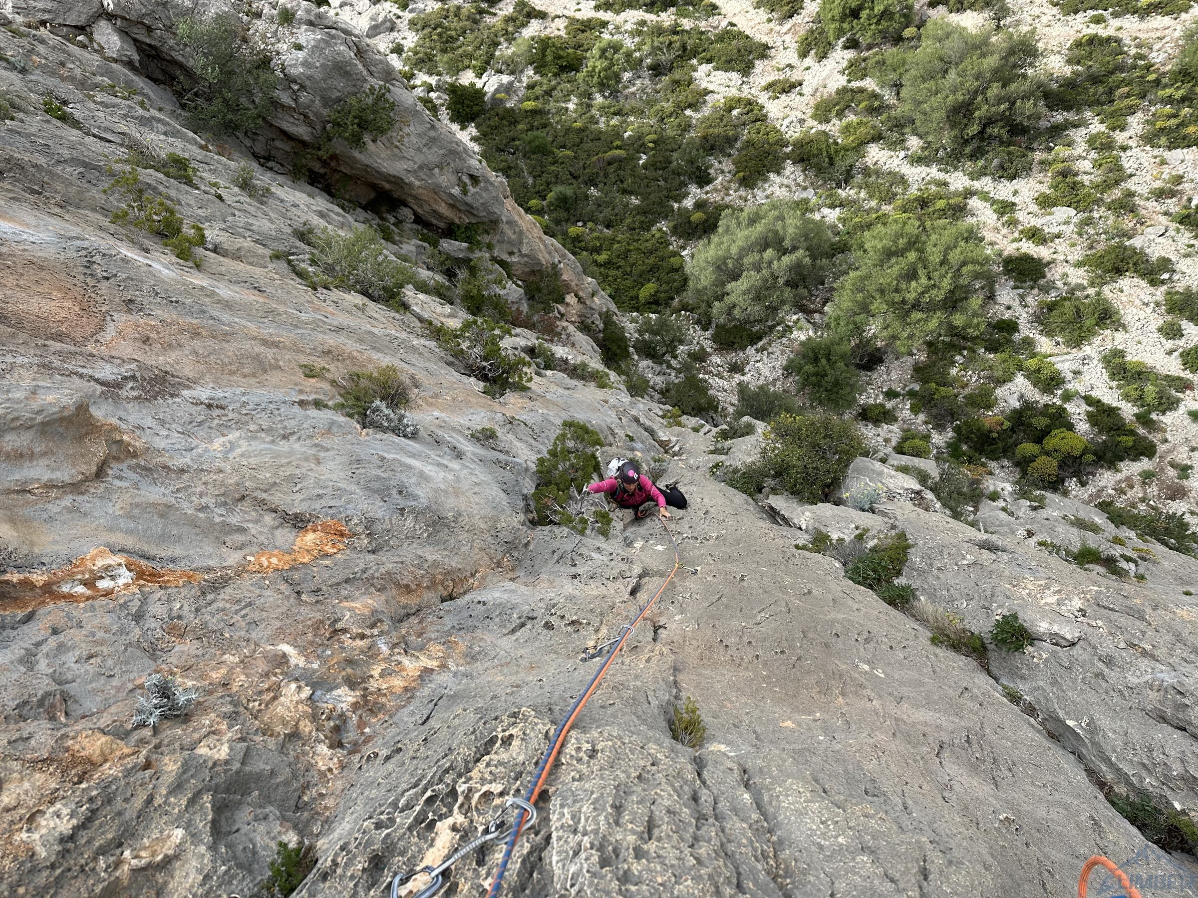 Pierwsza z nich okazuje się bardzo przyjemna – łatwa płytka i krótki trudniejszy fragment w prawo. Wyciąg 11-ty zaczyna się kolejną piękną podziurawioną płytą, która jednak stopniowo staje dęba i kończy się całkiem niebanalnie 😉. Ostatni odcinek z trudnościami to niewinnie wyglądający filarek, gdzie czeka jednak dość kąśliwa przewieszka, z wybrakowanym dla smaczku spitem. Po wyjściu na taras przechodzę od razu wieńczący drogę łatwy wyciąg (trójkowy) – do ostatniego stanowiska wychodzi ok. 50 metrów. Po wpisaniu się do pamiątkowej książki zmieniamy buty, pakujemy się i podchodzimy kilkadziesiąt metrów na szczyt Punta Giradili. Ania podziwia widoki, a ja lustruję widoczne stąd inne piękne ściany (m.in. Punta Argennas czy Monte Ginnircu) wypatrując kolejnych celów 😊. Po godzinnym spacerze jesteśmy z powrotem przy samochodzie i jedziemy na zasłużoną pizzę oraz cieszymy się wizją jutrzejszego plażowania – bark mimo kilku cięższych chwil wytrzymał, palce u stóp i rąk są jednak mocno skatowane. Dla TAKIEJ drogi warto jednak było pocierpieć, zdecydowanie była jedną z najlepszych i najbardziej intensywnych oraz efektownych dróg wielowyciągowych jakie mieliśmy okazję robić.