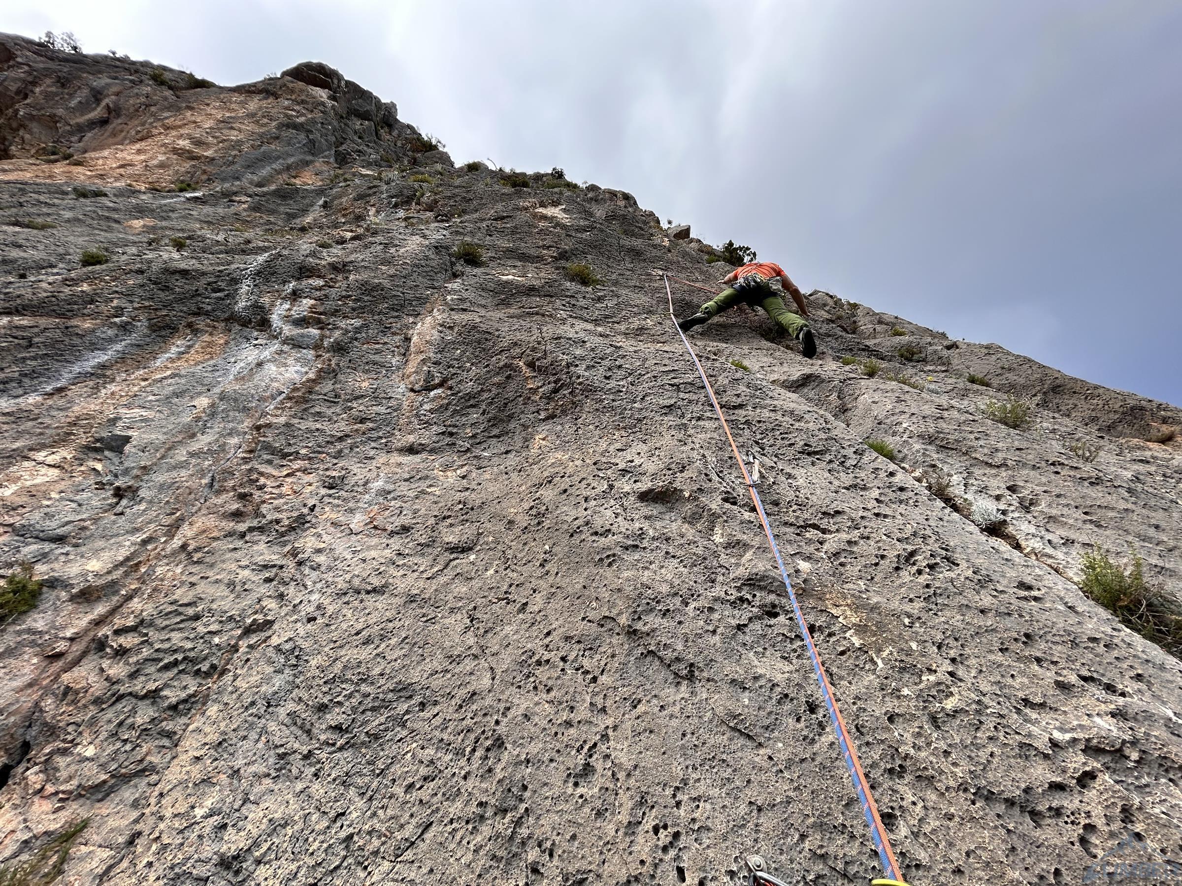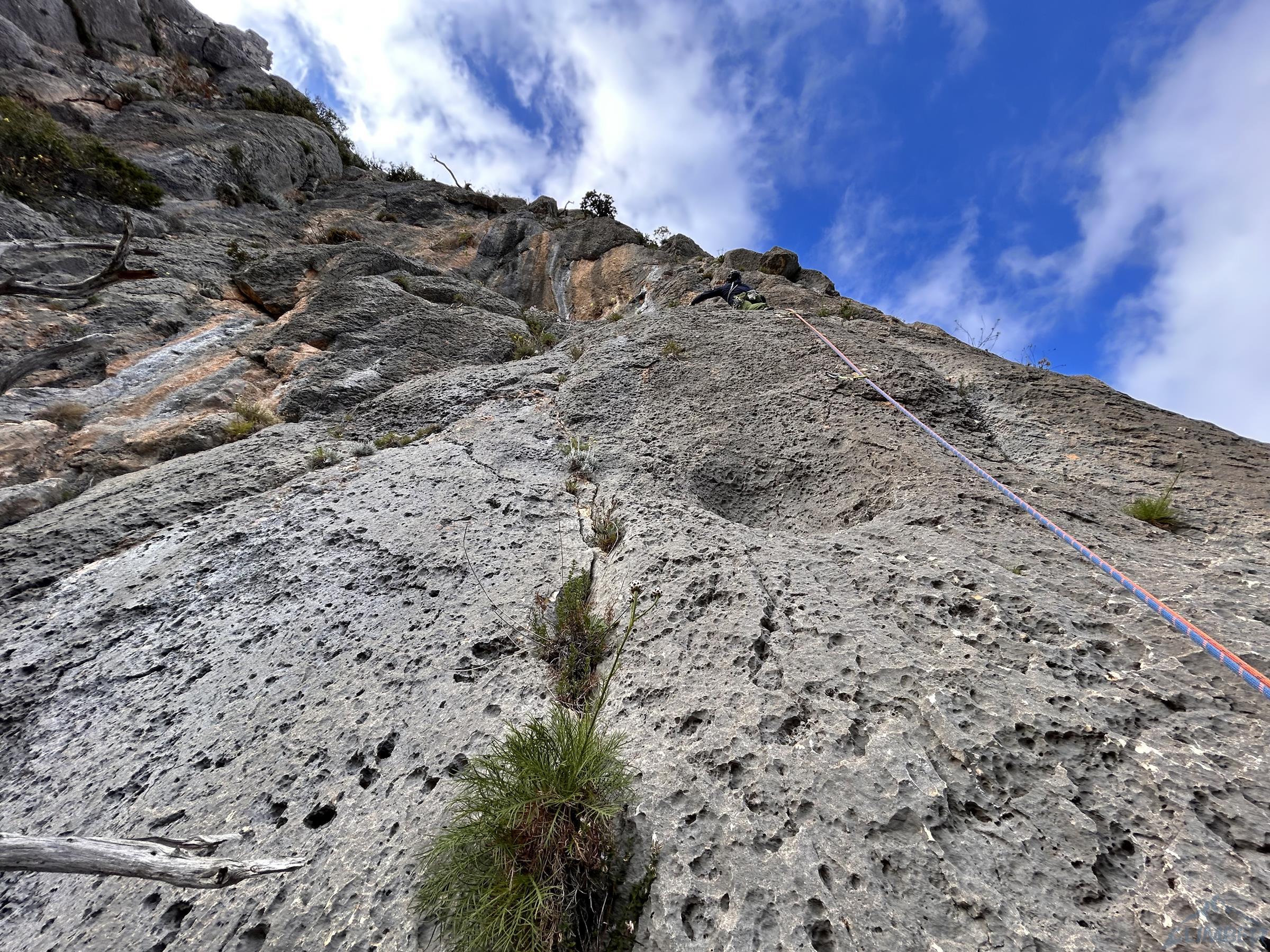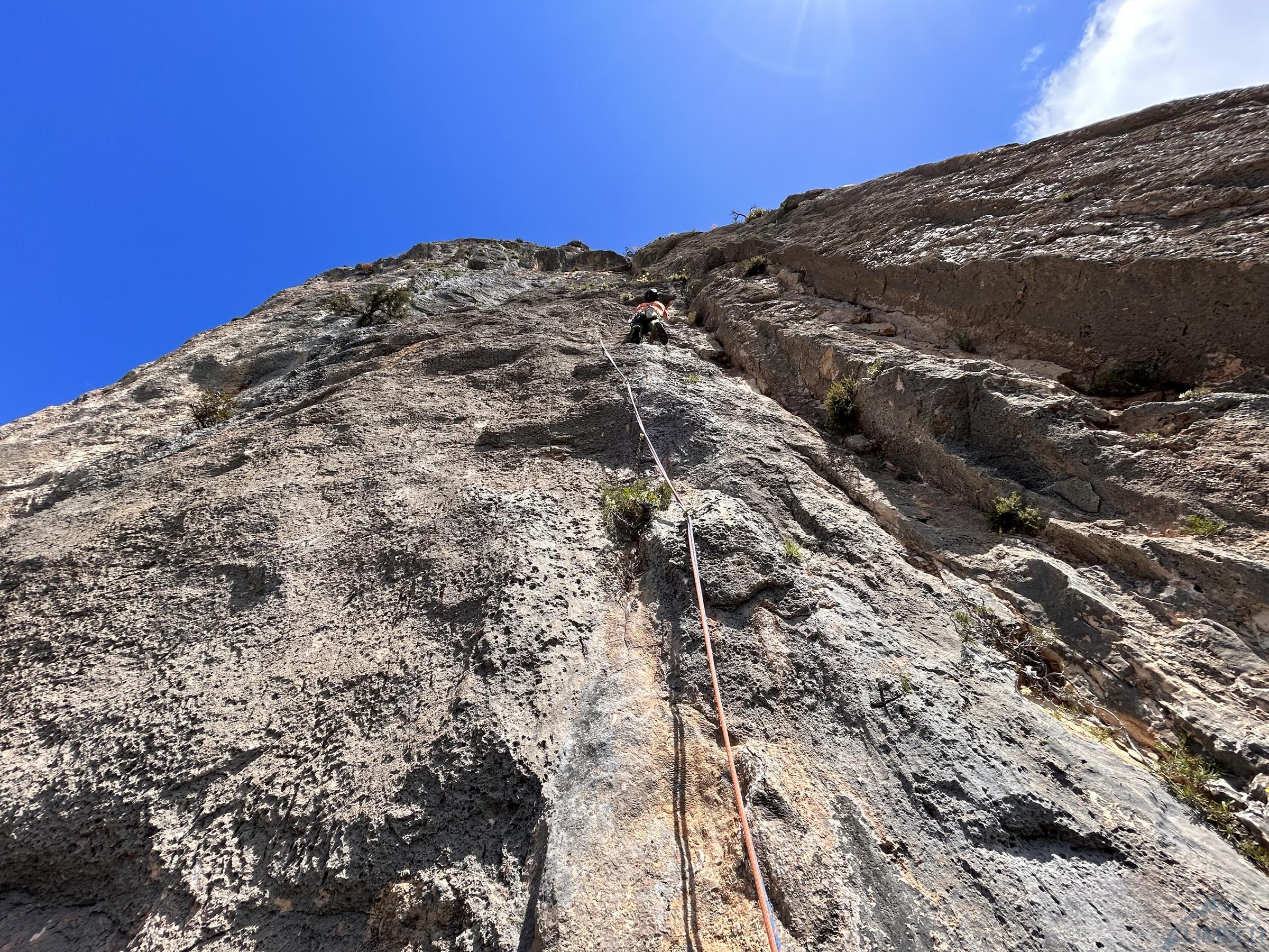 Wybrany na wspinanie dzień nie jest przypadkowy – jest bowiem jedynym pochmurnym (ale nie deszczowym) podczas naszego pobytu. Pamiętając jaka patelnia była na tej południowej ścianie w środku zimy przy czystym niebie wiemy, że teraz nie byłoby szans na klasycznie poprowadzenie długich i wymagających wyciągów w skale usianej dziurkami. Kilka z nich przyszło finalnie robić nam w Słońcu i było ciężko bo stopy puchły, a stopnie jechały – udało się z tym uporać, ale radzę unikać wspinania tutaj gdy jest za ciepło.