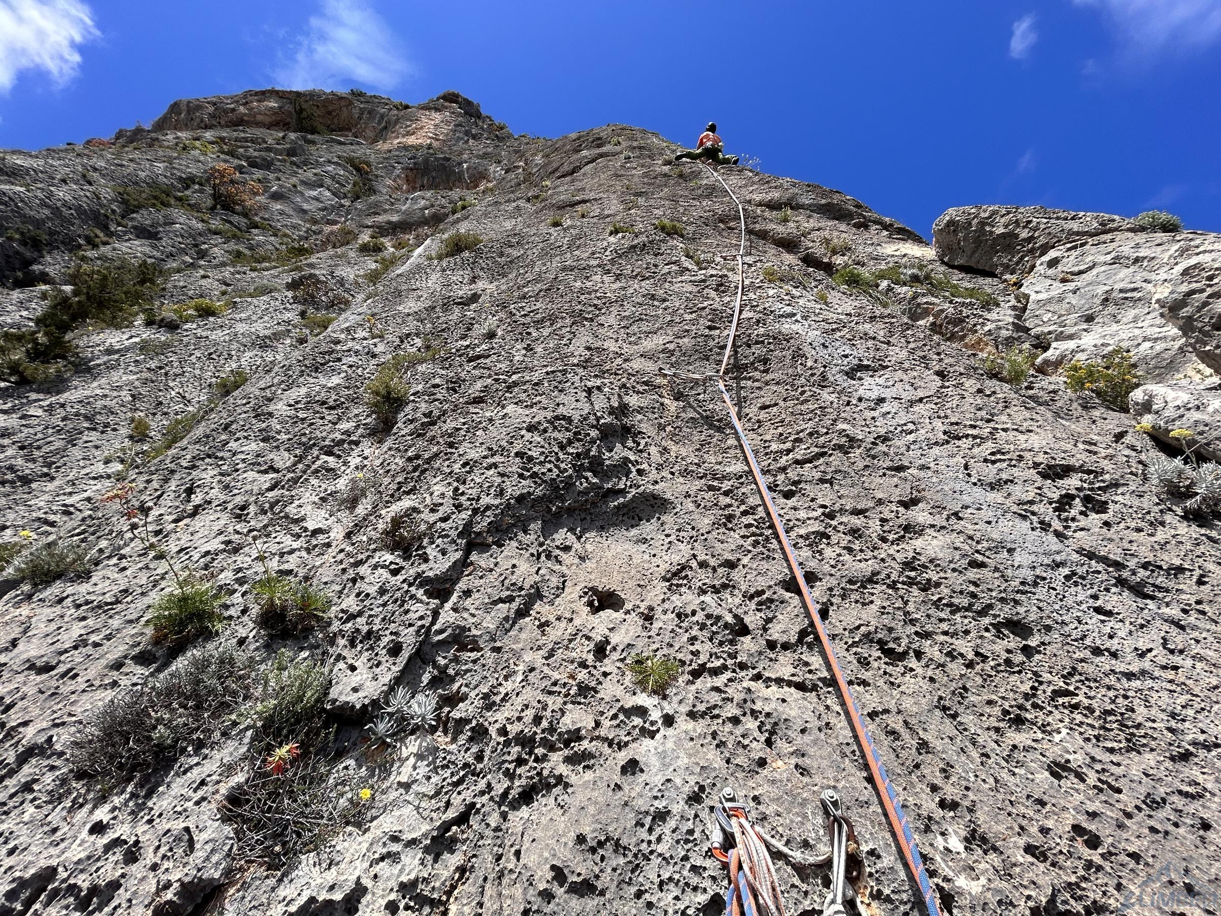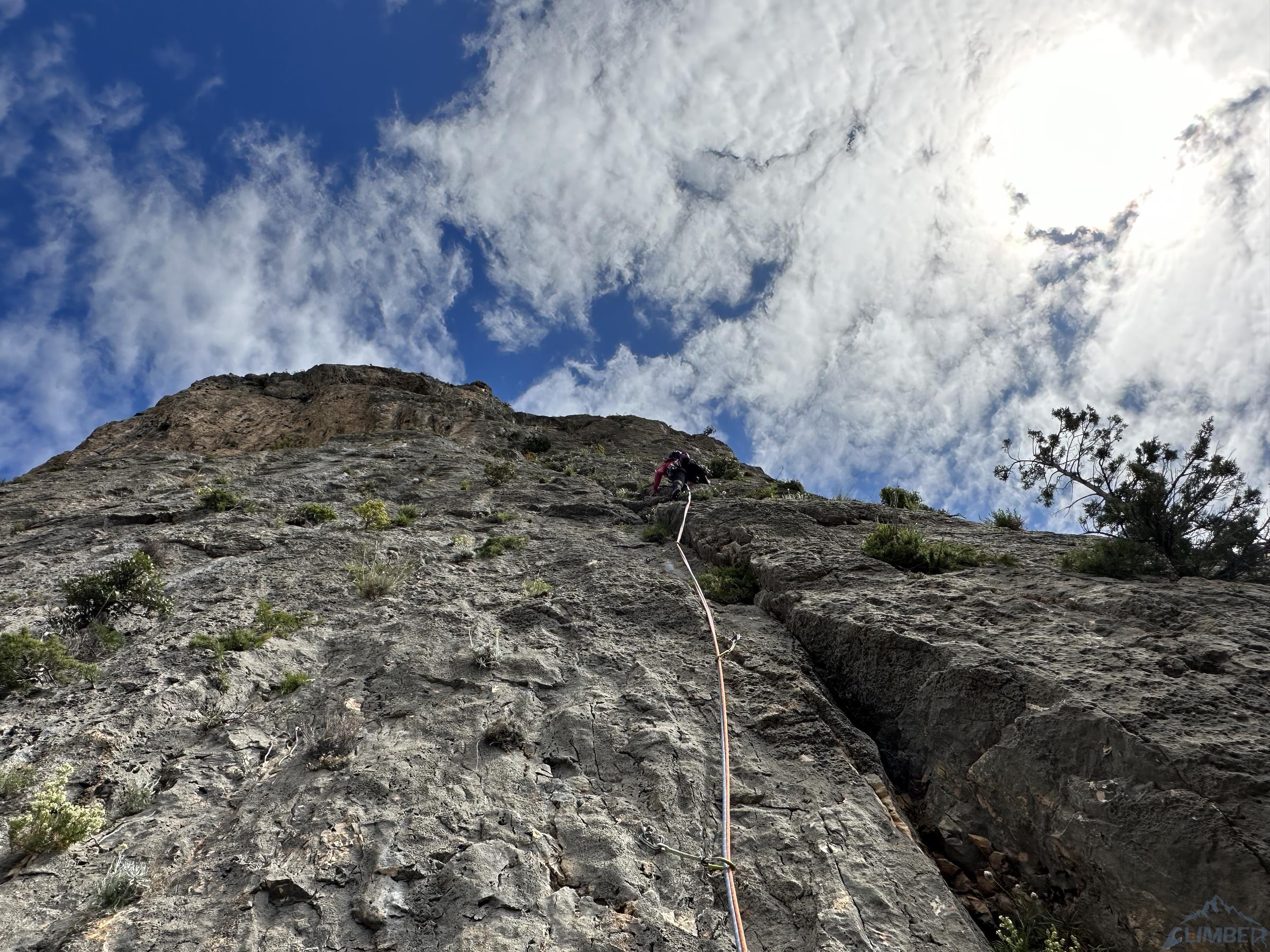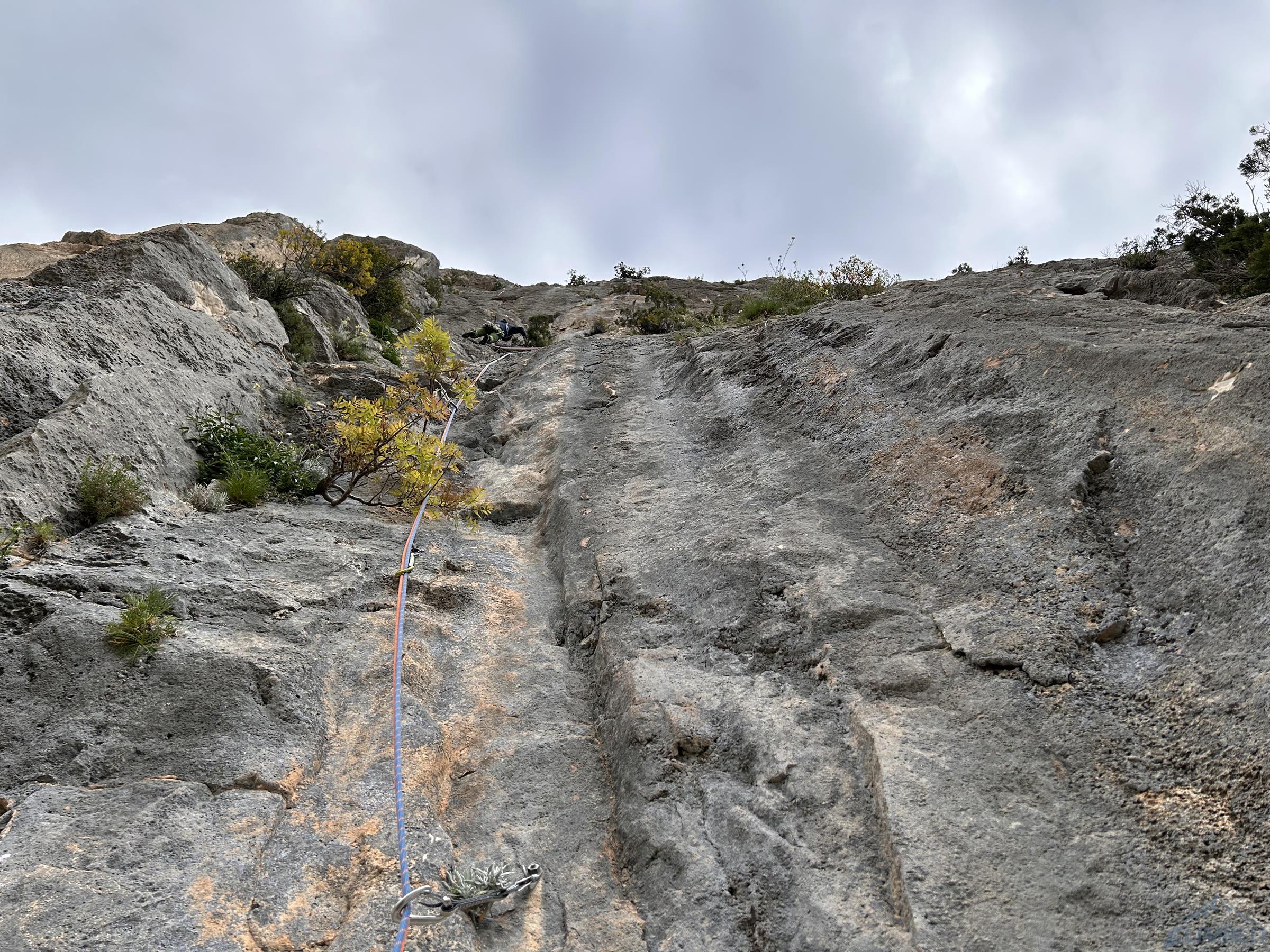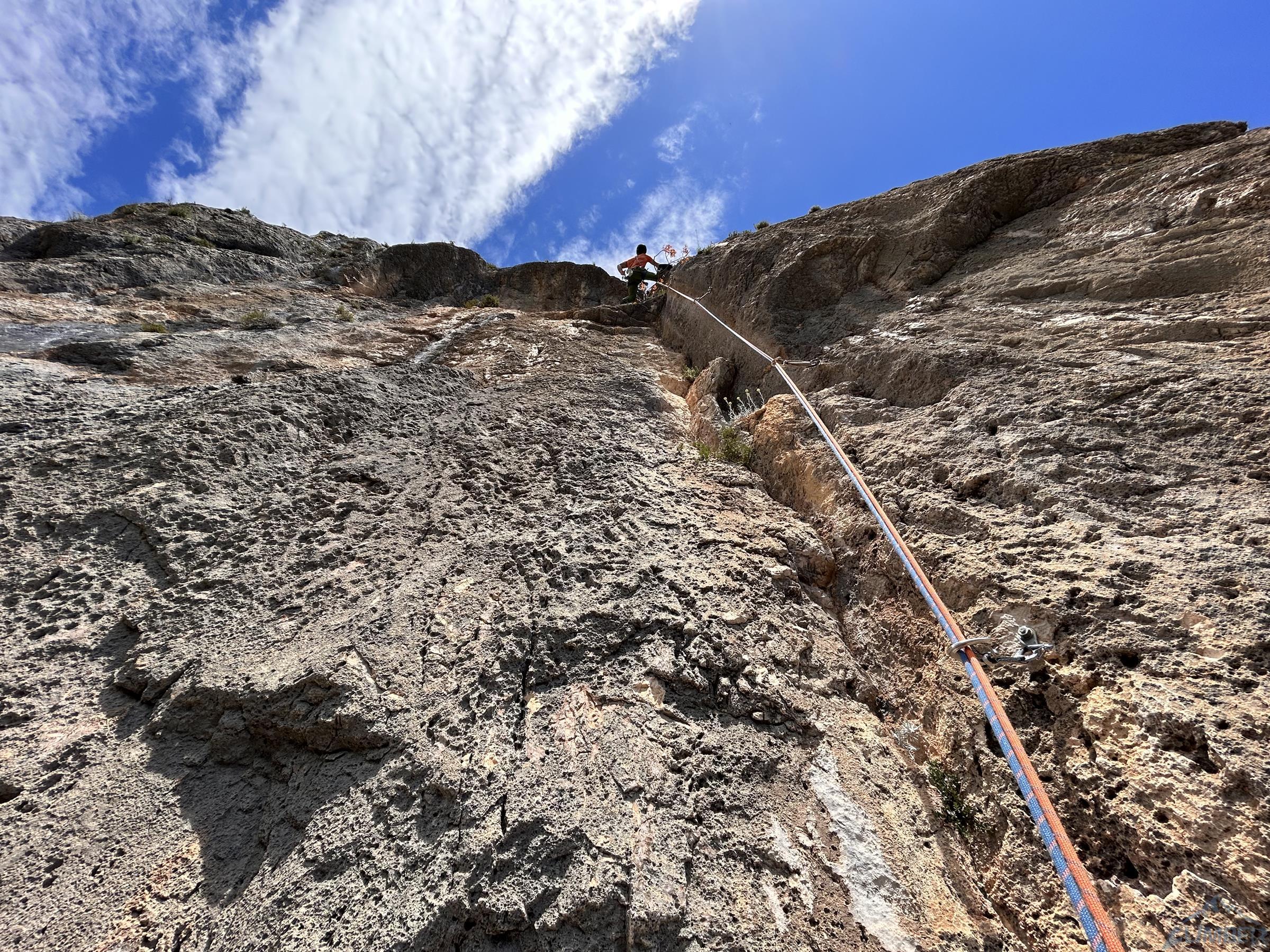 Wybrany na wspinanie dzień nie jest przypadkowy – jest bowiem jedynym pochmurnym (ale nie deszczowym) podczas naszego pobytu. Pamiętając jaka patelnia była na tej południowej ścianie w środku zimy przy czystym niebie wiemy, że teraz nie byłoby szans na klasycznie poprowadzenie długich i wymagających wyciągów w skale usianej dziurkami. Kilka z nich przyszło finalnie robić nam w Słońcu i było ciężko bo stopy puchły, a stopnie jechały – udało się z tym uporać, ale radzę unikać wspinania tutaj gdy jest za ciepło.