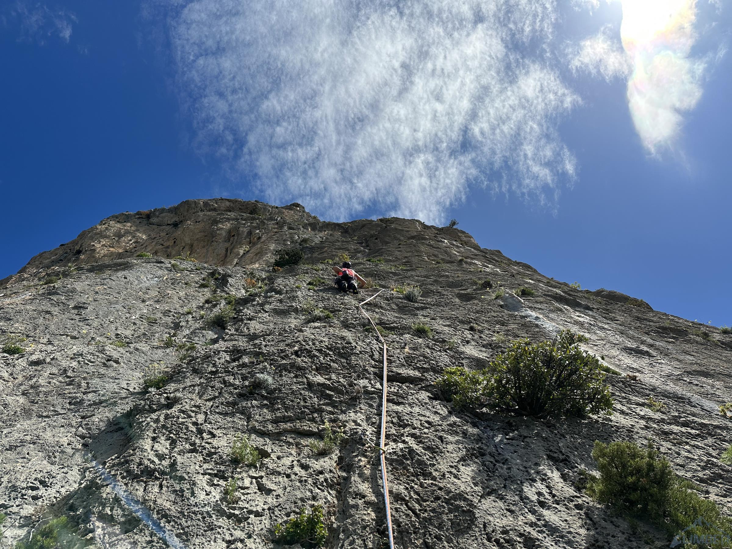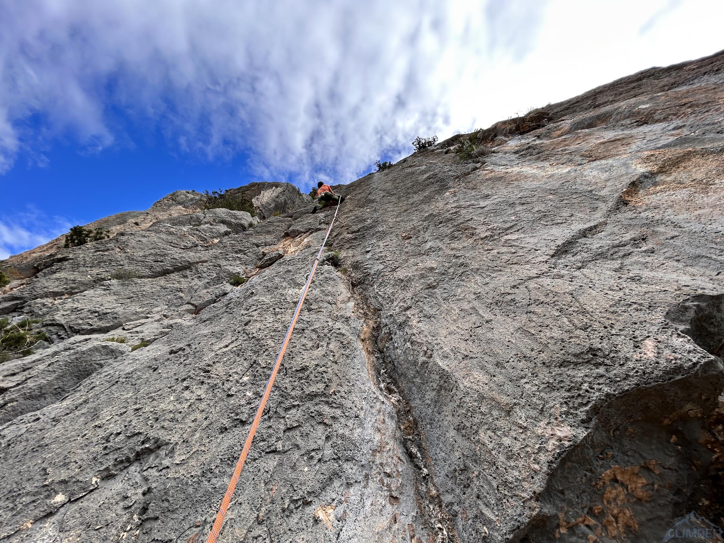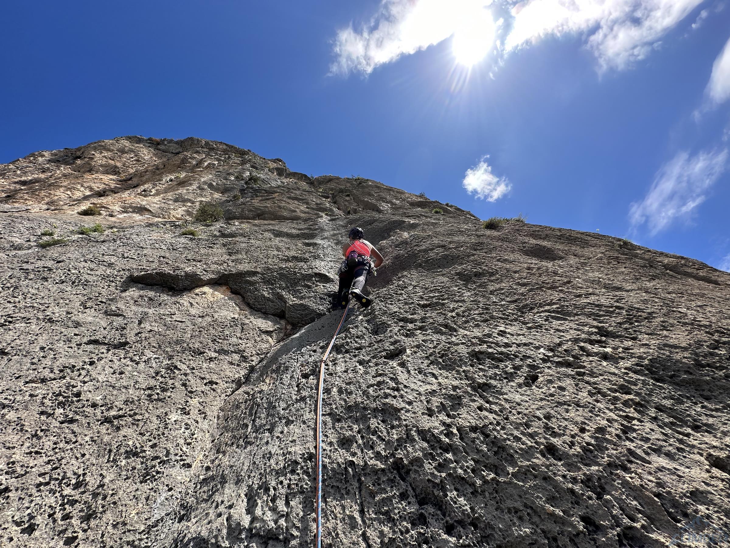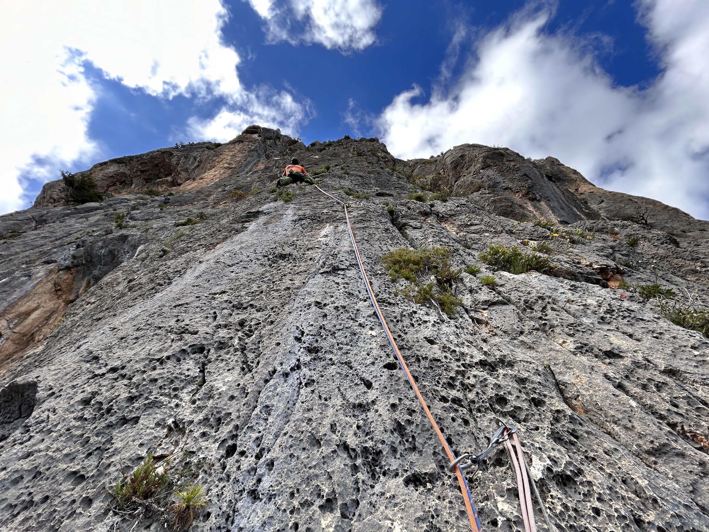Po dojechaniu w okolice owczarni (namiary w poprzedniej relacji) ruszamy w dół pod ścianę, podziwiamy widoki na Pedra Longę i namierzamy początek naszego Wolfganga, co bez dobrego zdjęcia wcale nie okazuje się takie proste 😊. W galerii zamieściłem topo z przewodnika wraz z dobrymi opisami poszczególnych wyciągów i ich długościami oraz linię drogi z innej perspektywy. Zakładamy, że poprowadzę najtrudniejsze wyciągi, ostatecznie Ania zmienia mnie jednak tylko na trzech najłatwiejszych – nawet te "średnio-trudne" są już bowiem dość mocne w swojej wycenie. Obicie jest nieco lepsze niż na Mediterraneo choć miejscami zdecydowanie nie jest to S1+ i sporo odcinków wymaga obligatoryjnych sekwencji, bez możliwości dołożenia własnego sprzętu (choć dwa zabrane małe friendy kilka razy się przydały).