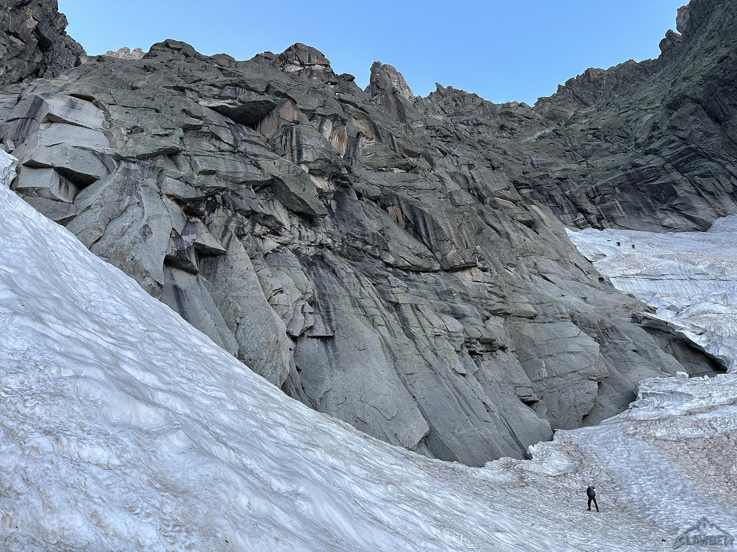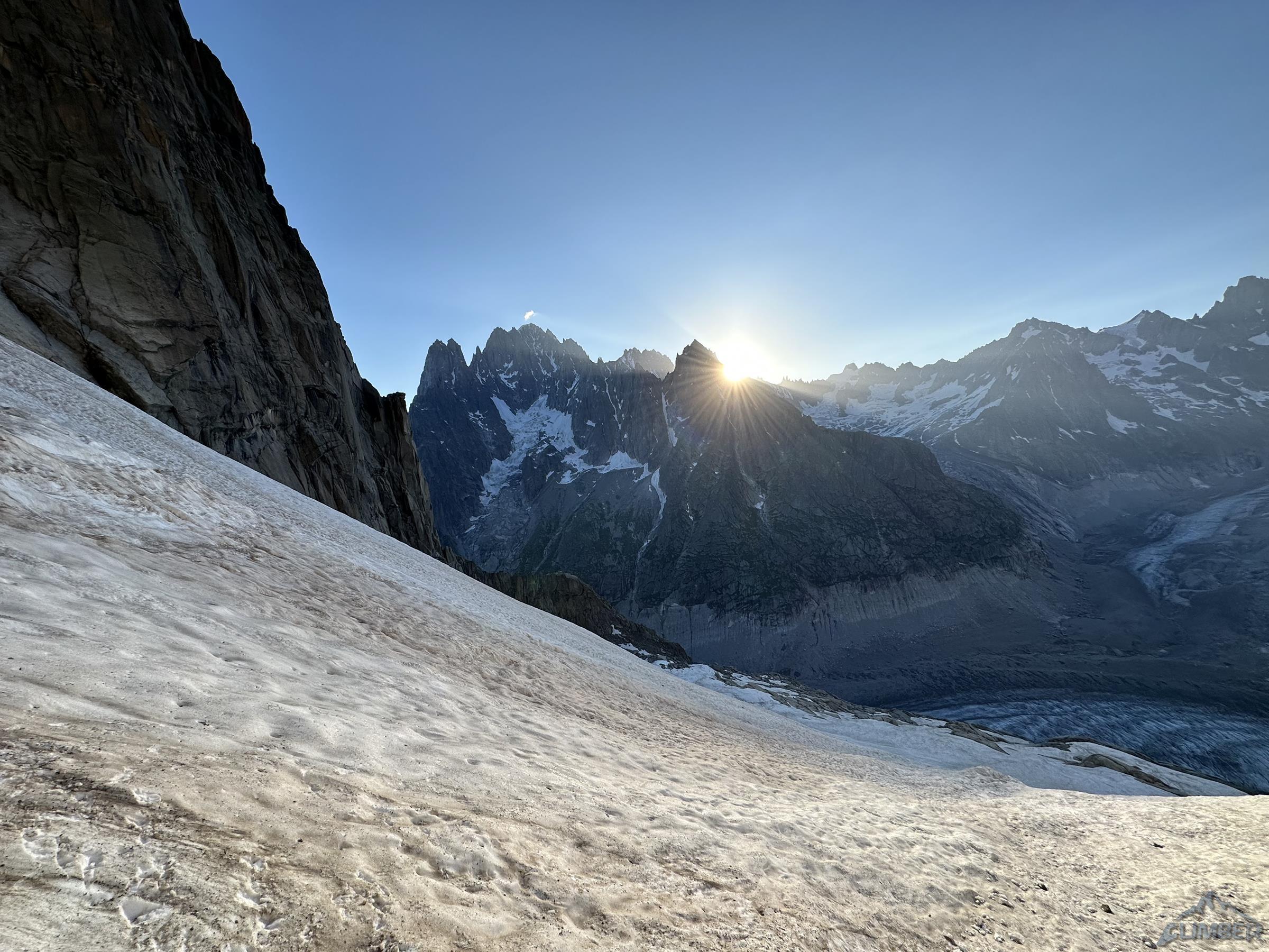 Po wczesnym śniadaniu w schronisku z resztą ekipy (Ania, Marcin i Szymon idą na klasyka Nantillons – Bienvenue) trawersujemy lodowcem za Tour Rouge i docieramy do podstawy ściany, która startuje nasza droga. Wspinanie zaczynamy później niż planowaliśmy (jak zwykle 😉) – około godziny siódmej, już przy pierwszych promieniach Słońca. Pierwsze wyciągi prowadzi Romek, będziemy się zmieniać co kilka wyciągów tak by każdemu przypadły zarówno trudniejsze jak i łatwiejsze odcinki. Wszystkie rysy i zacięcia są w całości na własnej (przydał się cały zdublowany zestaw camów od #0.1 do #2 i jeden #3), na płytach są spity. Ponieważ postanawiamy zjeżdżać linią drogi (nie polecamy o czym później) buty z rakami zostawiamy na drugim stanowisku – dostępu do ściany broni dość nieprzyjemna szczelina brzeżna.