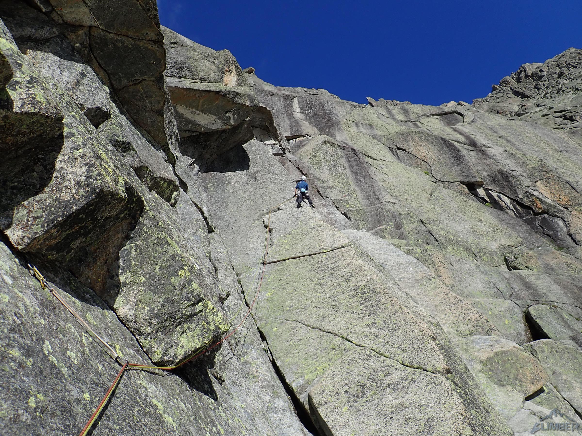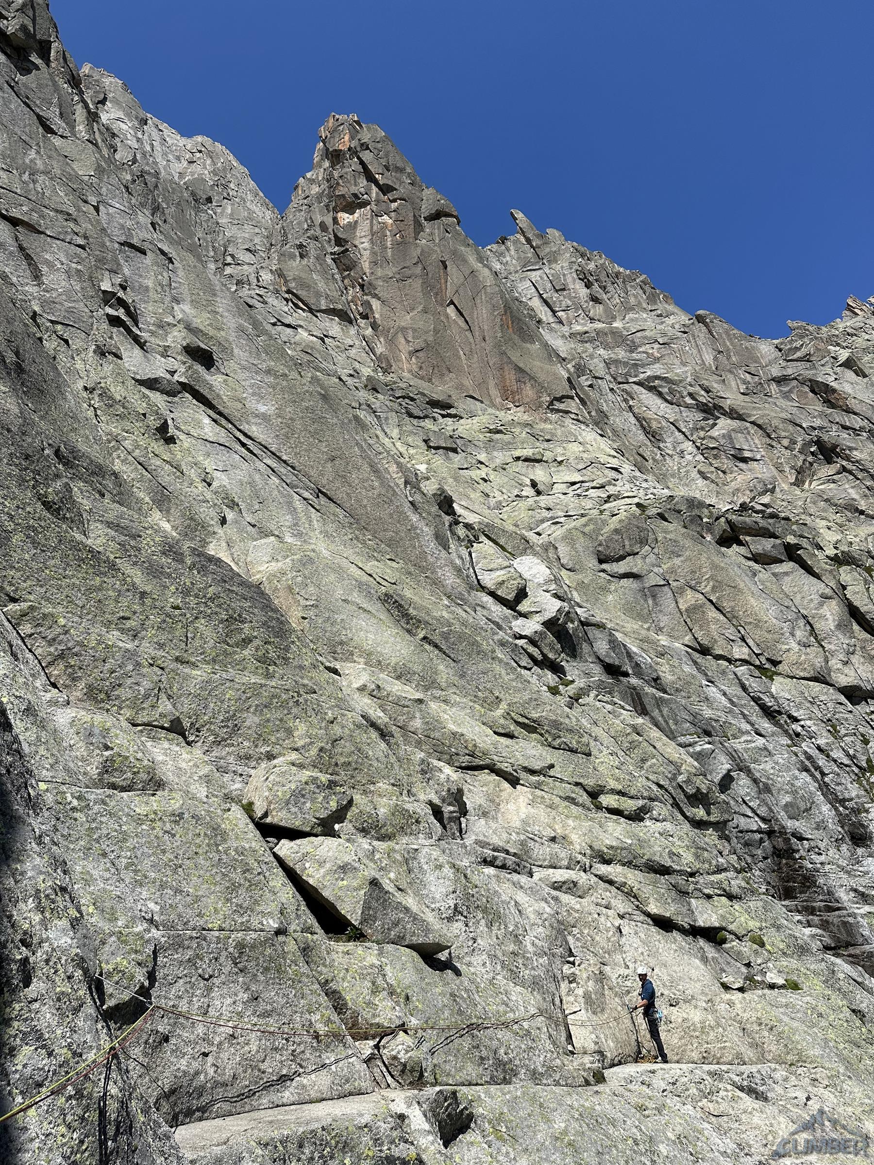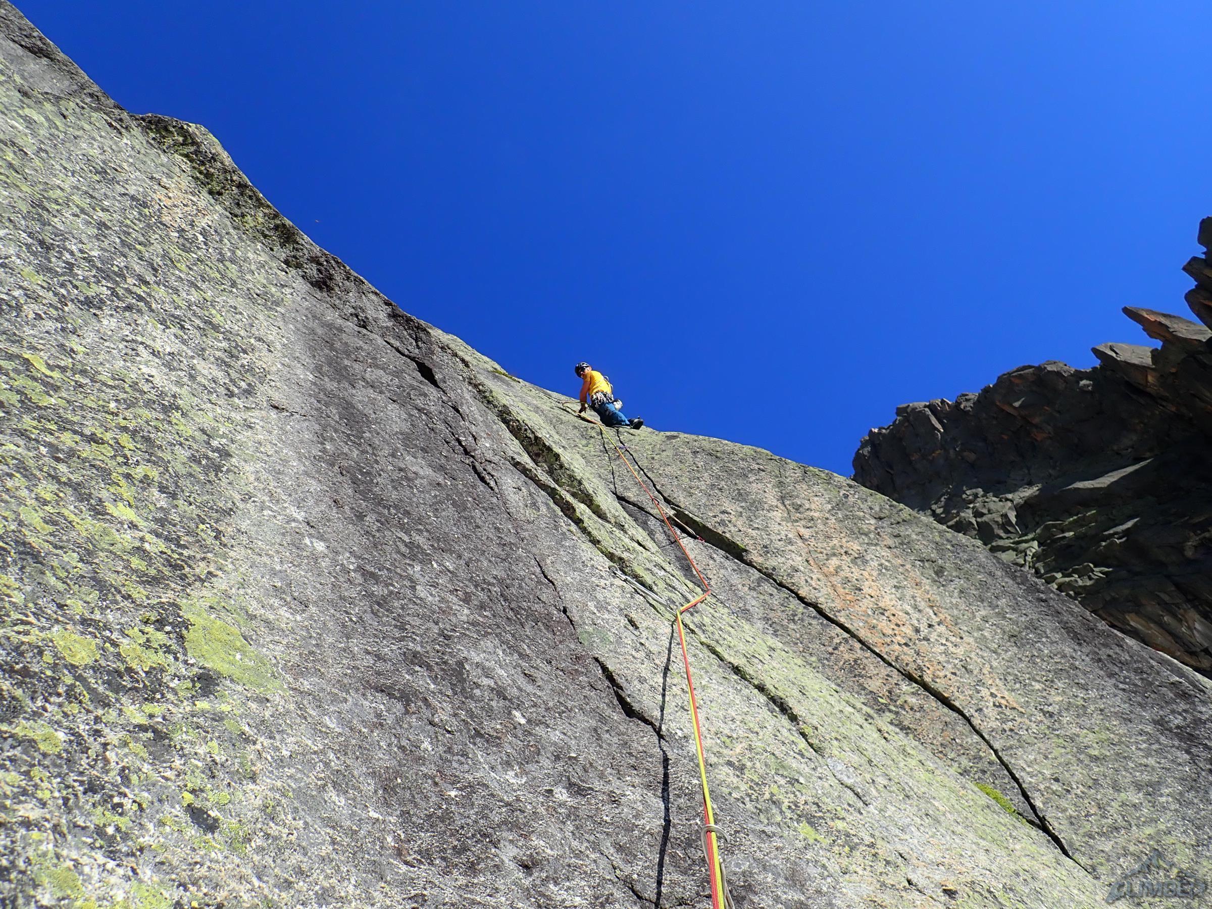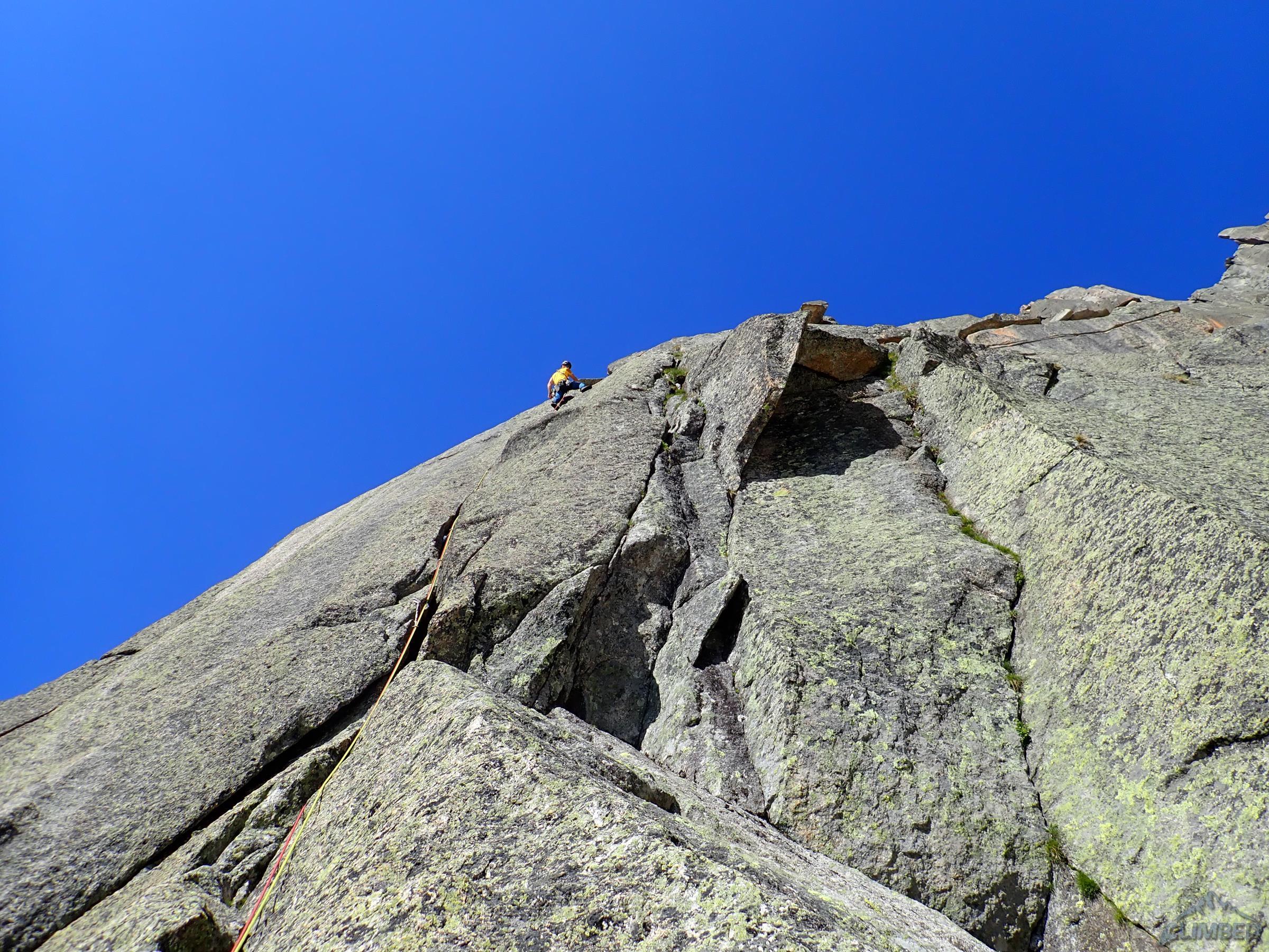 Ósmy wyciąg (6a+) zaczyna się na prawo od chaty – idziemy rysą do góry, po czym wybieramy jej lewą lub prawą odnogę (my poszliśmy lewą). Na dziewiątym wyciągu (zmieniamy się) czeka nas przewinięcie pod charakterystycznym nosem skalnym i trawers półkami w prawo – lepiej iść lekko po skosie by dotrzeć do stanowiska. Wyciąg nr 10 to piękne wspinanie w płycie (6b), do której dostajemy się skośną rysą od lewej strony. Na kolejnym odcinku idziemy wzdłuż spitów skośnie w prawo (6a) i docieramy w łatwy teren pod imponującą turnią, Tour Brune. Tutaj czeka nas ponad 60 metrów łatwego (4b) podejścia pod najpiękniejszy chyba fragment drogi, przewieszające się 50-metrowe zacięcie przecięte rysą. Po jego przejściu zgodnie stwierdzamy, że to jeden z najpiękniejszych wyciągów jakie w życiu przeszliśmy – wspinanie jest niezwykle estetyczne i sprawia mnóstwo frajdy, trzeba też oszczędzać sprzęt gdyż jedyny stały punkt jest dopiero pod stanowiskiem 😊.