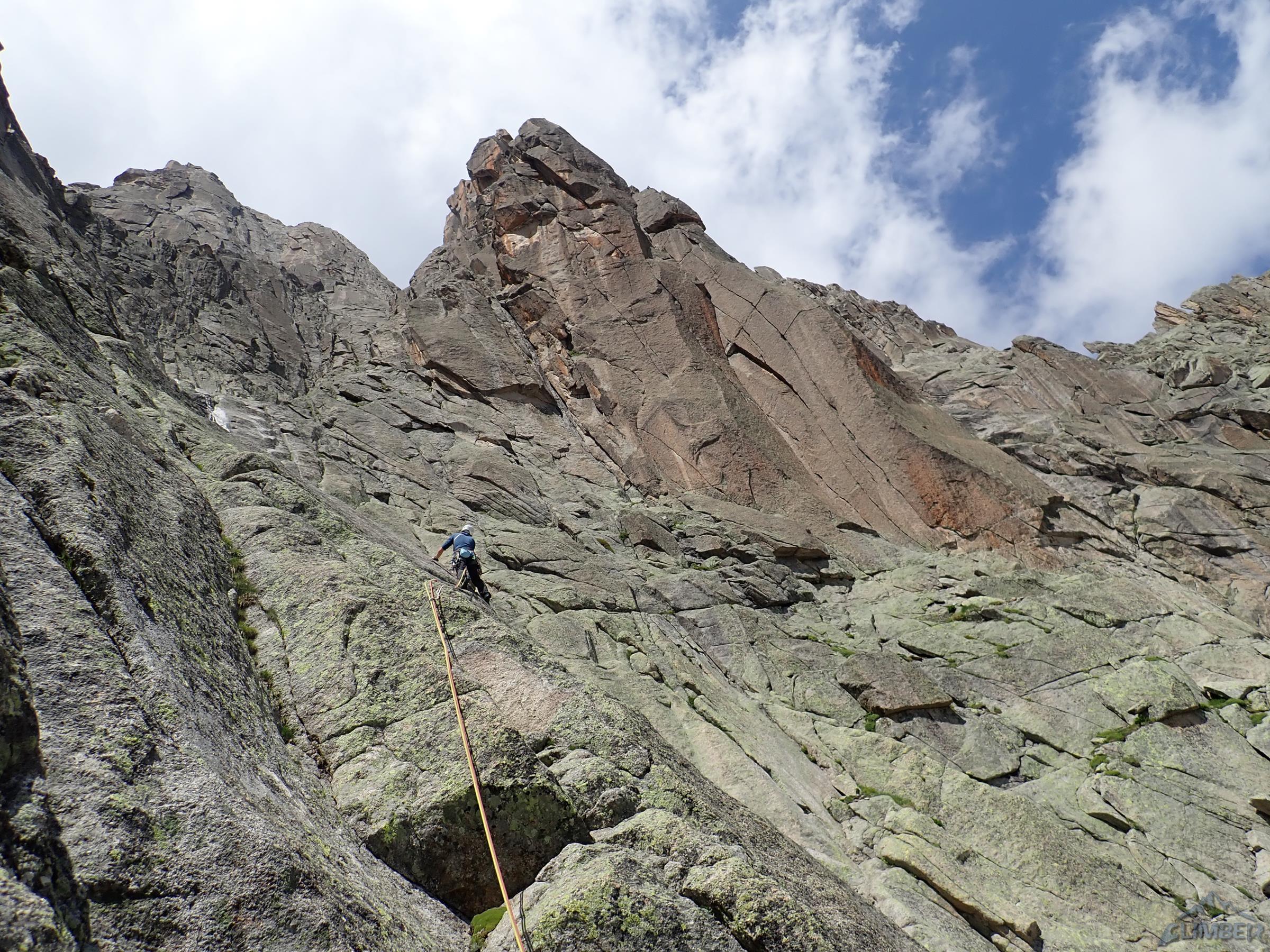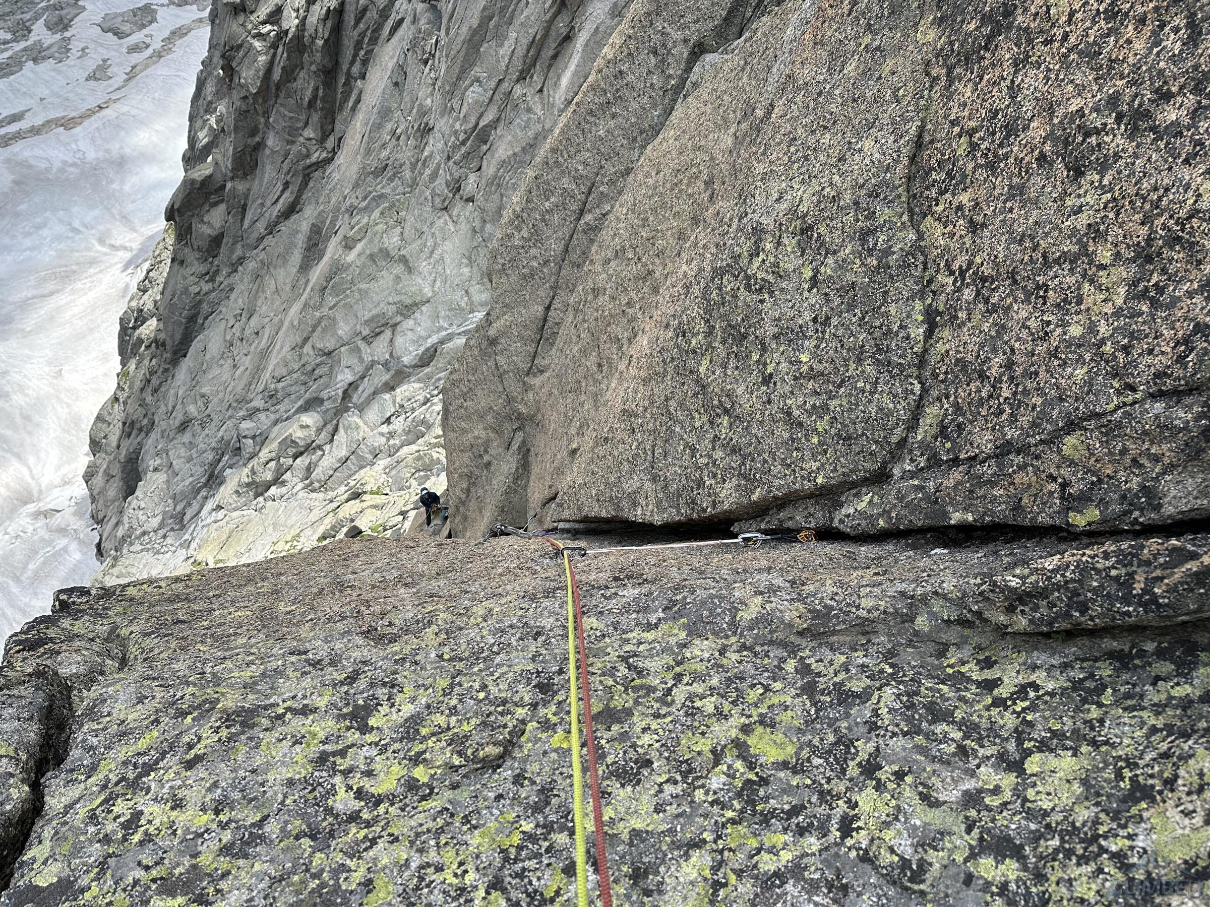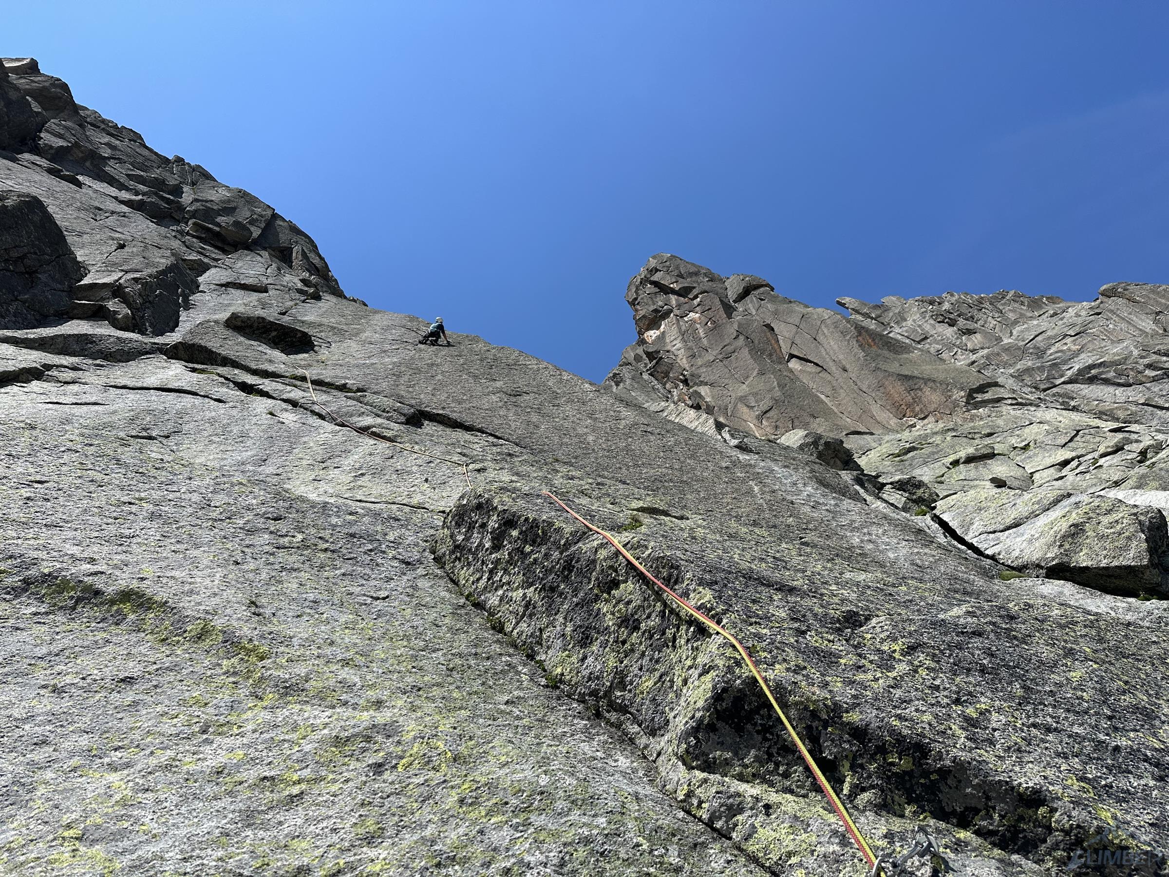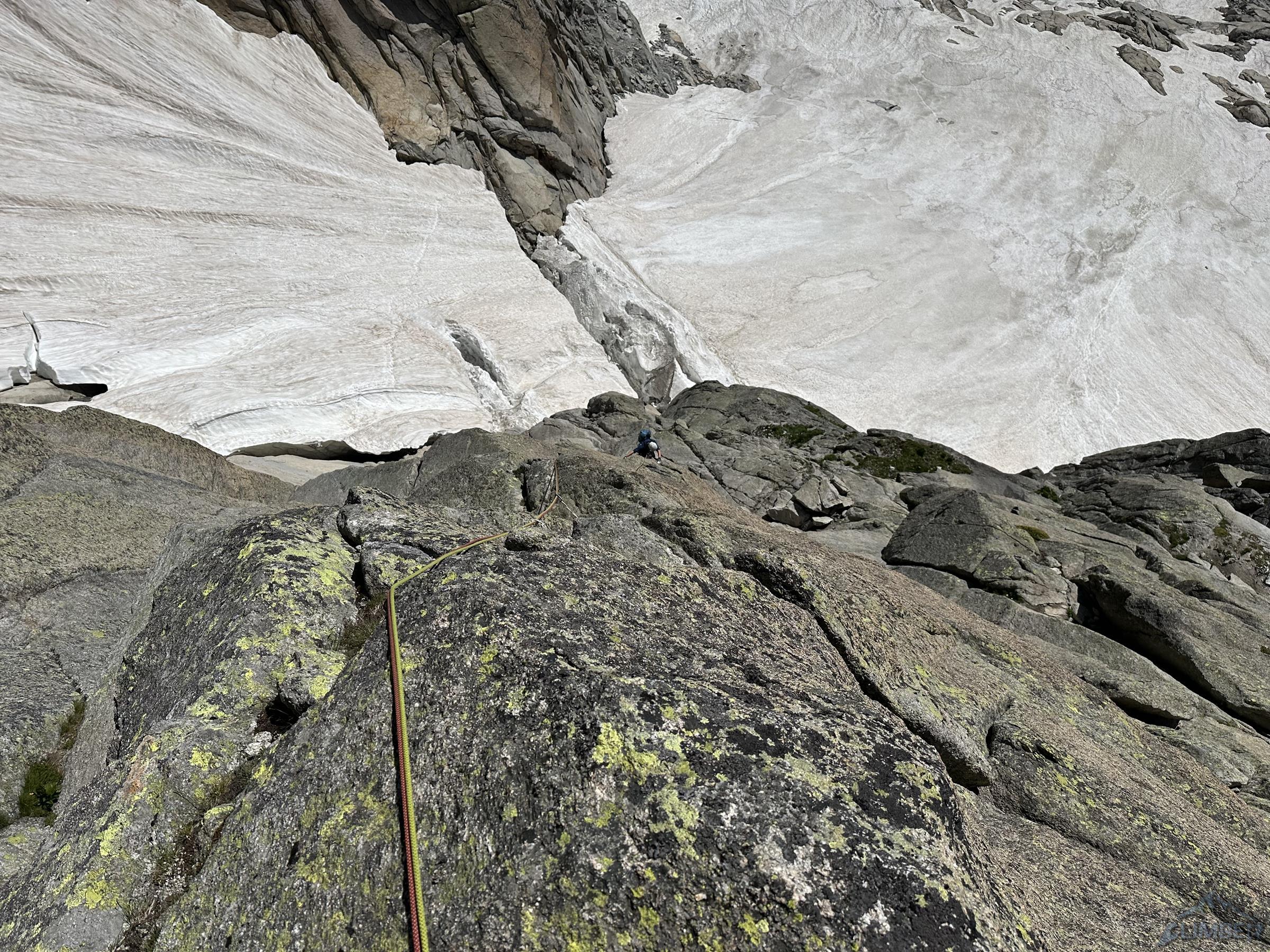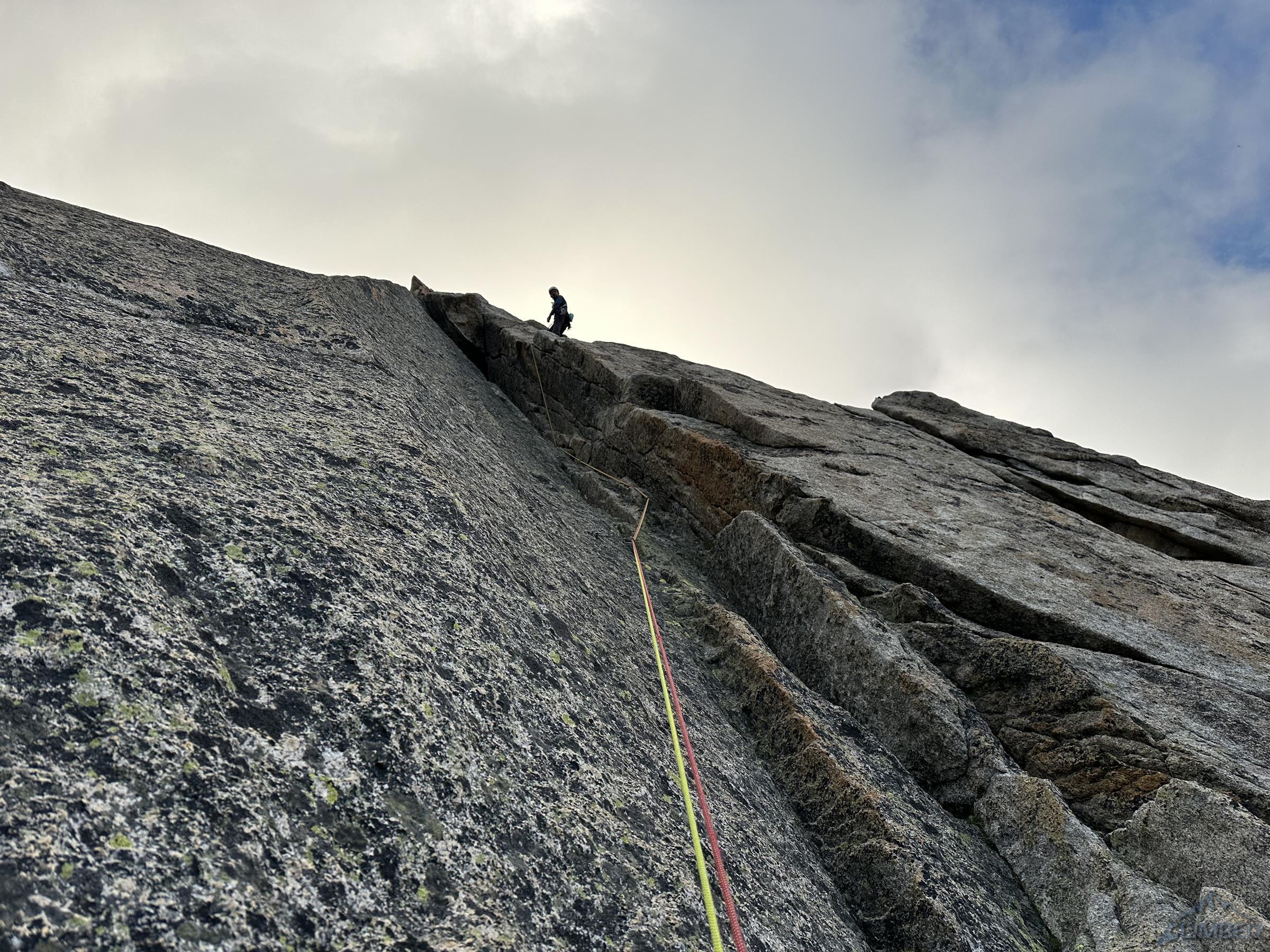 Ósmy wyciąg (6a+) zaczyna się na prawo od chaty – idziemy rysą do góry, po czym wybieramy jej lewą lub prawą odnogę (my poszliśmy lewą). Na dziewiątym wyciągu (zmieniamy się) czeka nas przewinięcie pod charakterystycznym nosem skalnym i trawers półkami w prawo – lepiej iść lekko po skosie by dotrzeć do stanowiska. Wyciąg nr 10 to piękne wspinanie w płycie (6b), do której dostajemy się skośną rysą od lewej strony. Na kolejnym odcinku idziemy wzdłuż spitów skośnie w prawo (6a) i docieramy w łatwy teren pod imponującą turnią, Tour Brune. Tutaj czeka nas ponad 60 metrów łatwego (4b) podejścia pod najpiękniejszy chyba fragment drogi, przewieszające się 50-metrowe zacięcie przecięte rysą. Po jego przejściu zgodnie stwierdzamy, że to jeden z najpiękniejszych wyciągów jakie w życiu przeszliśmy – wspinanie jest niezwykle estetyczne i sprawia mnóstwo frajdy, trzeba też oszczędzać sprzęt gdyż jedyny stały punkt jest dopiero pod stanowiskiem 😊.