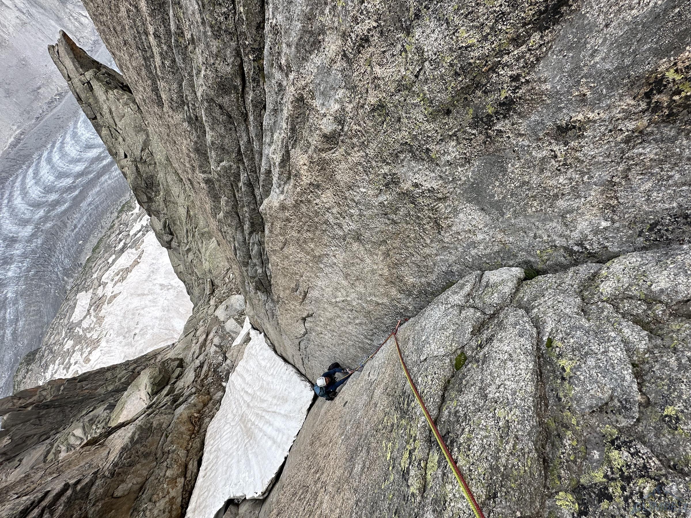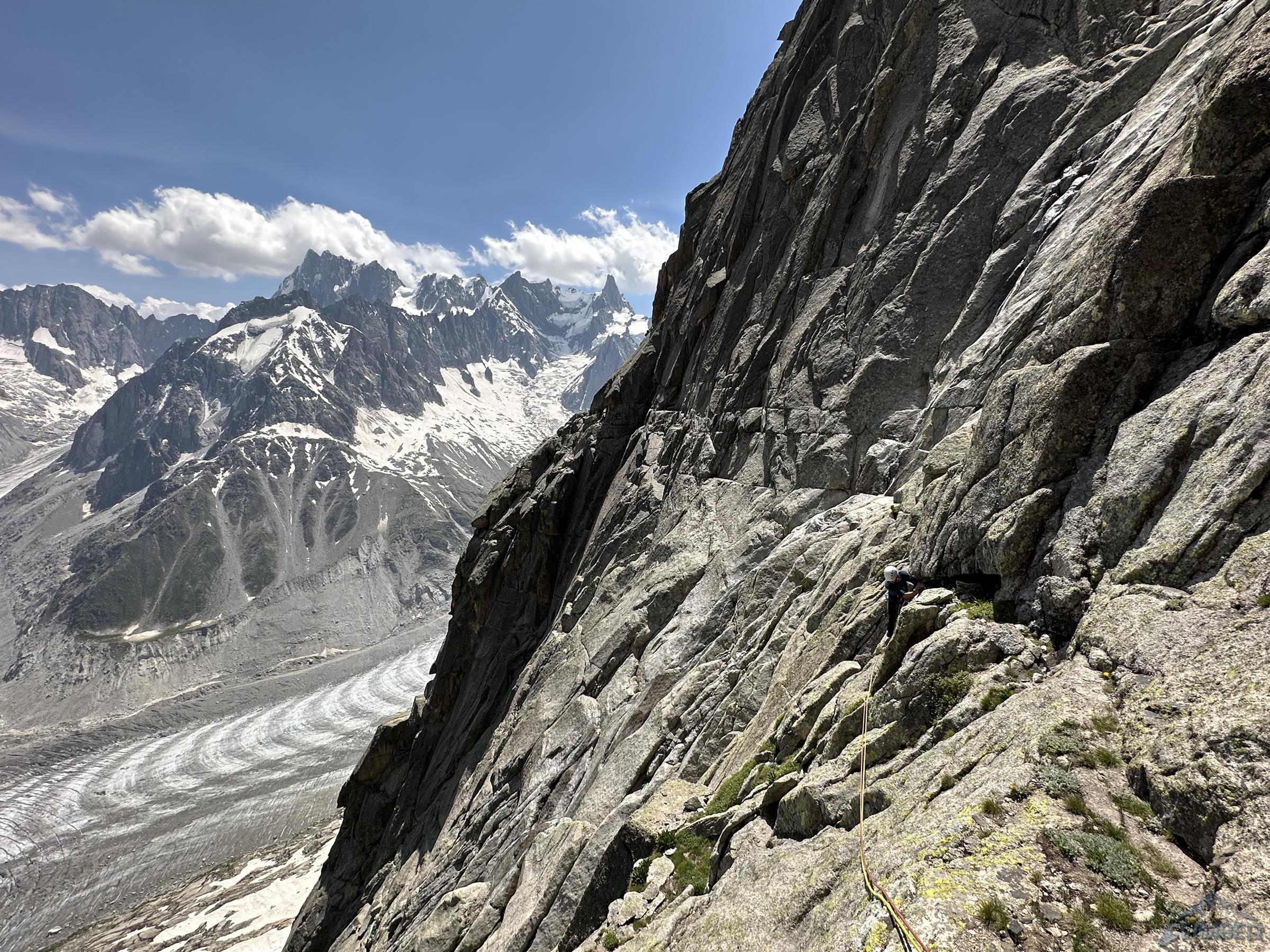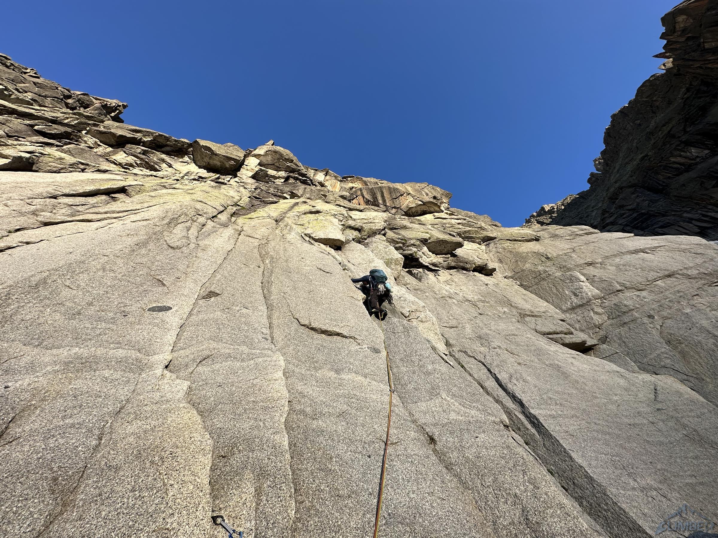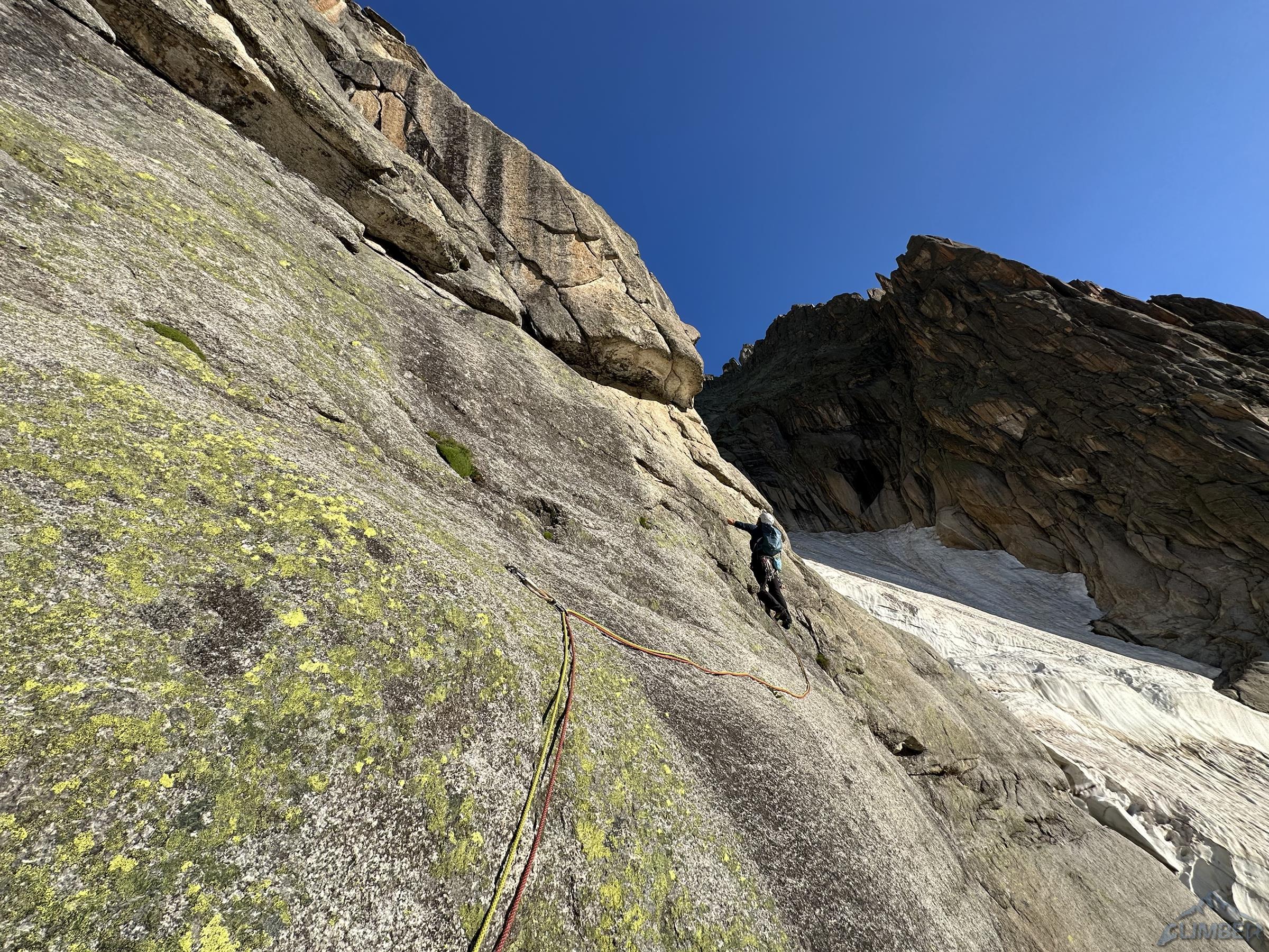 Ósmy wyciąg (6a+) zaczyna się na prawo od chaty – idziemy rysą do góry, po czym wybieramy jej lewą lub prawą odnogę (my poszliśmy lewą). Na dziewiątym wyciągu (zmieniamy się) czeka nas przewinięcie pod charakterystycznym nosem skalnym i trawers półkami w prawo – lepiej iść lekko po skosie by dotrzeć do stanowiska. Wyciąg nr 10 to piękne wspinanie w płycie (6b), do której dostajemy się skośną rysą od lewej strony. Na kolejnym odcinku idziemy wzdłuż spitów skośnie w prawo (6a) i docieramy w łatwy teren pod imponującą turnią, Tour Brune. Tutaj czeka nas ponad 60 metrów łatwego (4b) podejścia pod najpiękniejszy chyba fragment drogi, przewieszające się 50-metrowe zacięcie przecięte rysą. Po jego przejściu zgodnie stwierdzamy, że to jeden z najpiękniejszych wyciągów jakie w życiu przeszliśmy – wspinanie jest niezwykle estetyczne i sprawia mnóstwo frajdy, trzeba też oszczędzać sprzęt gdyż jedyny stały punkt jest dopiero pod stanowiskiem 😊.