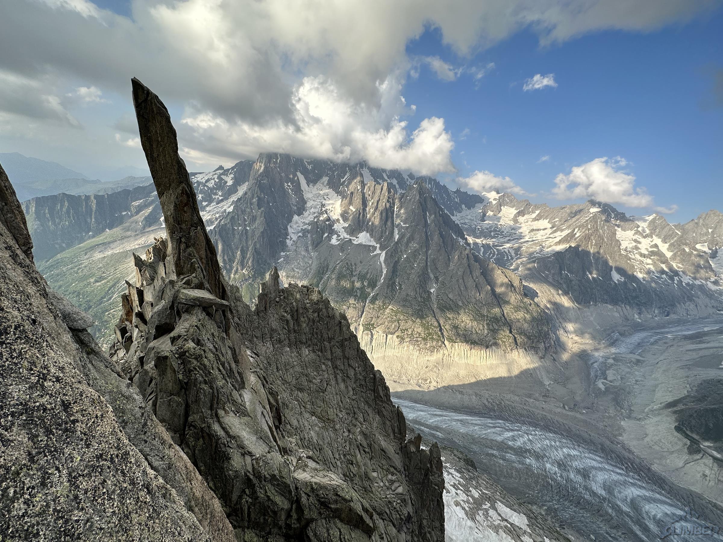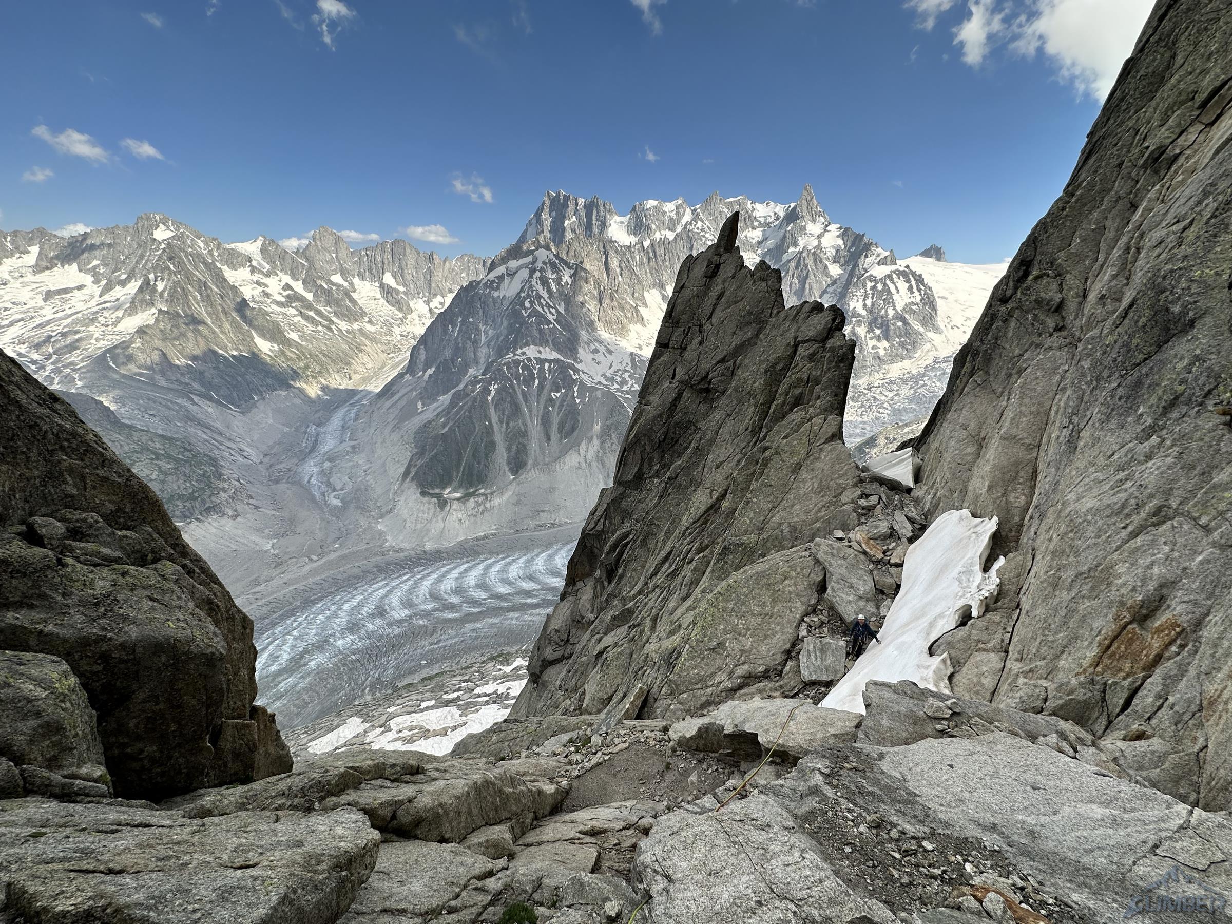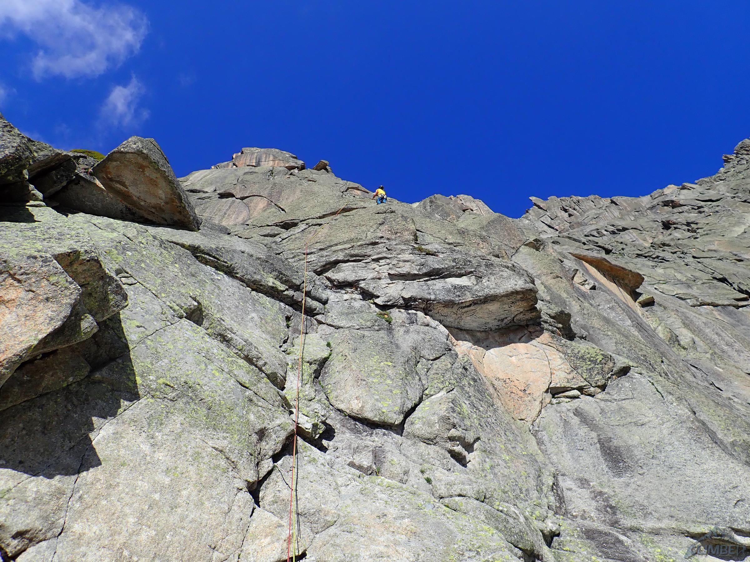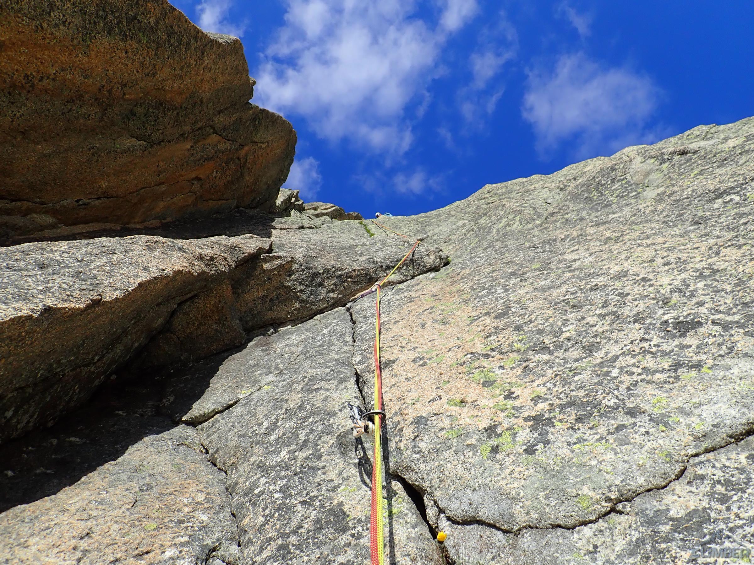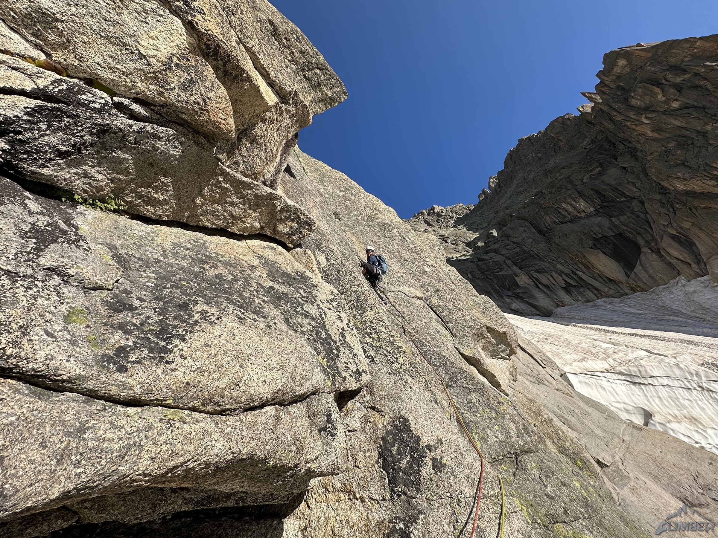 Ósmy wyciąg (6a+) zaczyna się na prawo od chaty – idziemy rysą do góry, po czym wybieramy jej lewą lub prawą odnogę (my poszliśmy lewą). Na dziewiątym wyciągu (zmieniamy się) czeka nas przewinięcie pod charakterystycznym nosem skalnym i trawers półkami w prawo – lepiej iść lekko po skosie by dotrzeć do stanowiska. Wyciąg nr 10 to piękne wspinanie w płycie (6b), do której dostajemy się skośną rysą od lewej strony. Na kolejnym odcinku idziemy wzdłuż spitów skośnie w prawo (6a) i docieramy w łatwy teren pod imponującą turnią, Tour Brune. Tutaj czeka nas ponad 60 metrów łatwego (4b) podejścia pod najpiękniejszy chyba fragment drogi, przewieszające się 50-metrowe zacięcie przecięte rysą. Po jego przejściu zgodnie stwierdzamy, że to jeden z najpiękniejszych wyciągów jakie w życiu przeszliśmy – wspinanie jest niezwykle estetyczne i sprawia mnóstwo frajdy, trzeba też oszczędzać sprzęt gdyż jedyny stały punkt jest dopiero pod stanowiskiem 😊.
