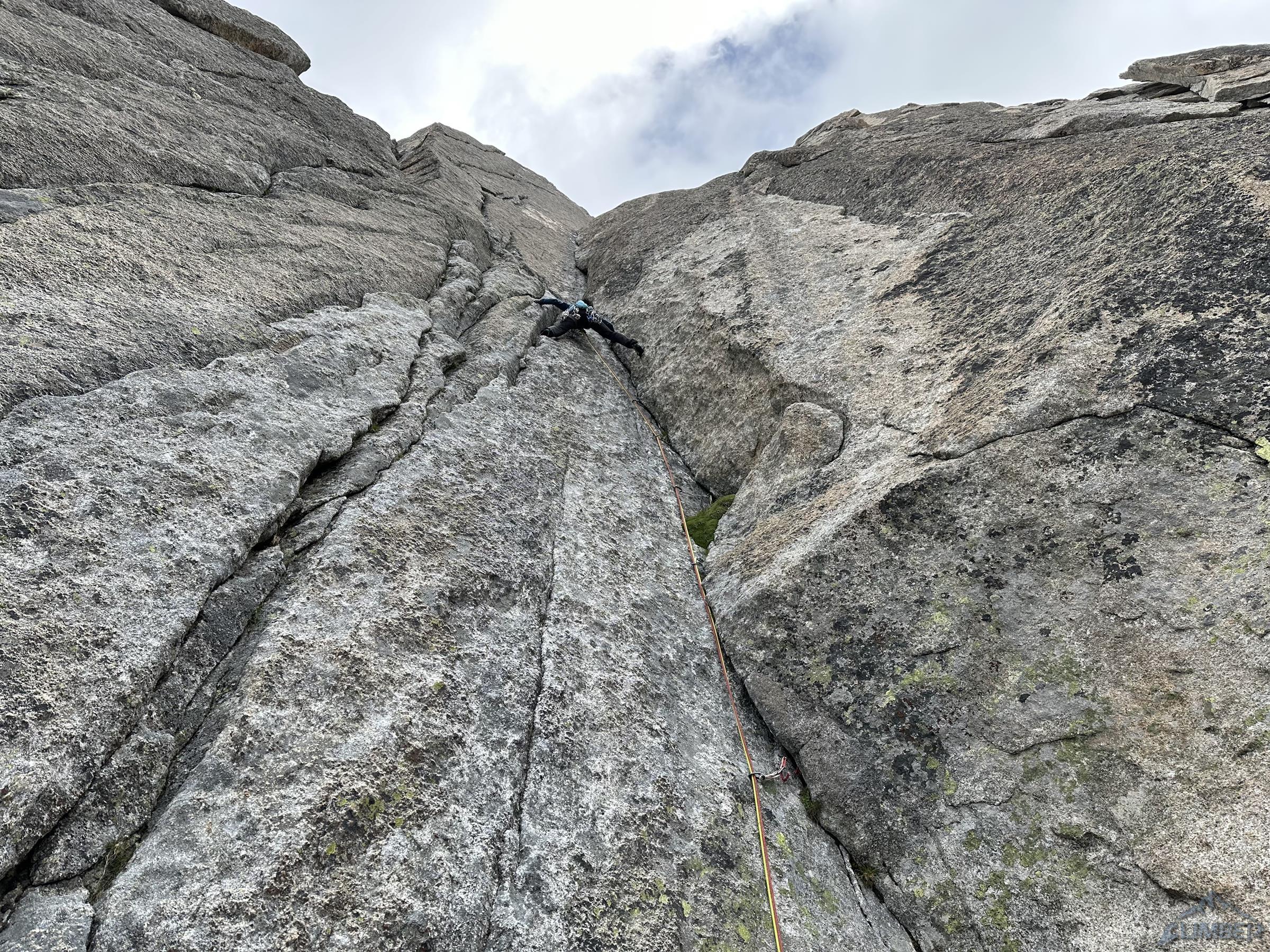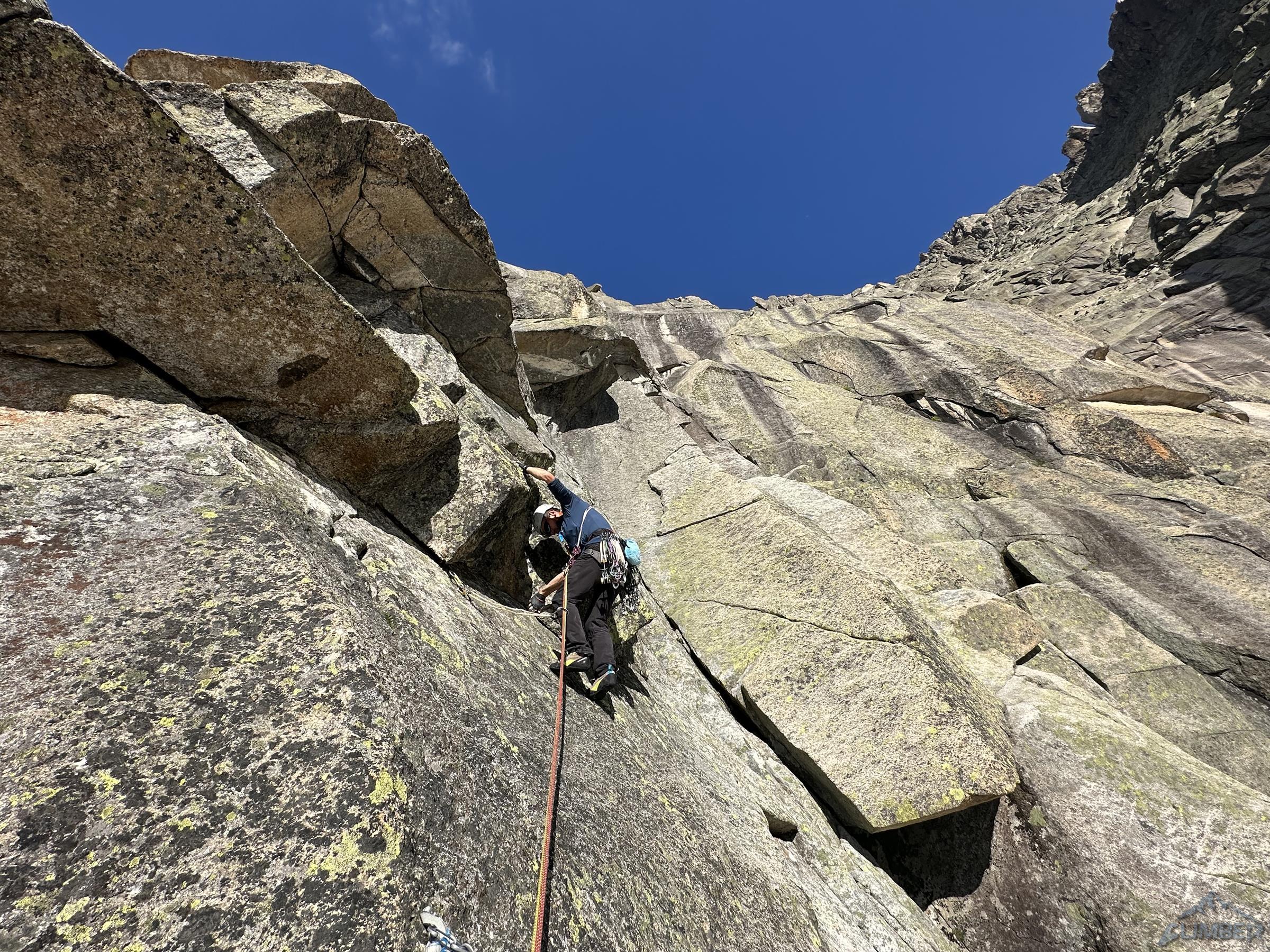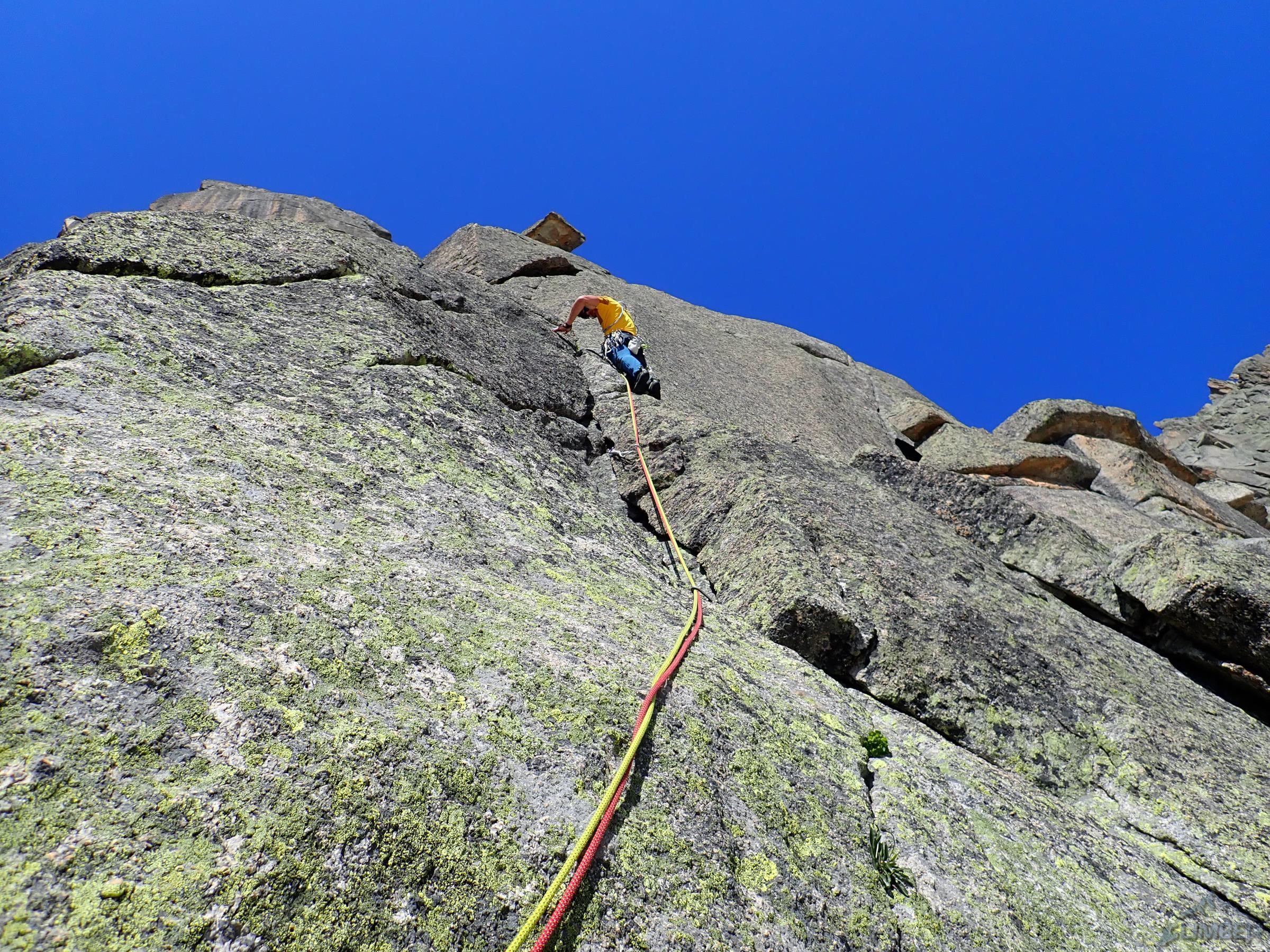 Po zmianie na prowadzeniu ruszam w piąty odcinek – dość przystępną jak na Piolę płytę za 6c, po której kontynuuje się ślicznymi rysami do góry. Cały ten wyciąg można obejść zacięciem po lewej stronie i załupą w prawo (5c), warto jednak pokusić się o oryginalny, trudniejszy wariant. Stanowisko znajdujące się po wyjściu z trudności warto przenieść 10 metrów wyżej – kolejny odcinek to prawie 60 metrów wspinania. Idziemy kominem i dalej płytą w prawo do spita na kancie, którym kontynuujemy skośnie w lewo do odległej półki. Siódmy wyciąg to piękna rysa po lewej (6a), docieramy nią wprost na wielki taras na którym znajdziemy… chatkę 😊. Historyczne schronisko (Old Tour Rouge) zostało odrestaurowane i służy obecnie jako miejsce biwakowe, z którego korzysta całkiem sporo osób wspinających się République Bananière. Dzięki temu kilka wyciągów przejść można późnym popołudniem dnia pierwszego, a pozostałe po wygodnym noclegu – nie jest to głupi pomysł bo mamy więcej czasu żeby wyrobić się na szczyt i zjechać jeszcze przed zmrokiem.